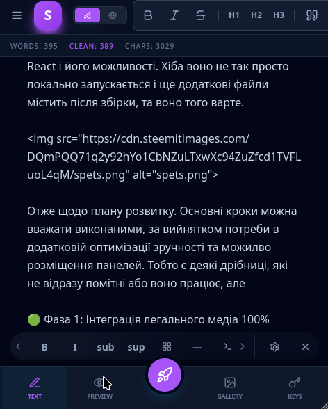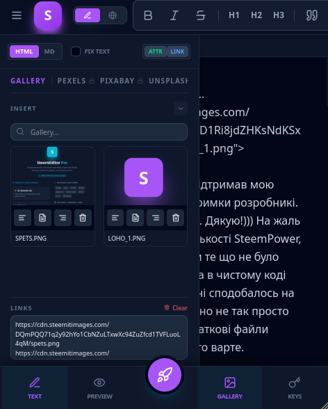 The editor is fully functional and convenient. It’s particularly efficient for adding images, both personal and from stock services (with personal API keys). Signing image uploads with Keychain might feel a bit repetitive if manual confirmation is on, but it ensures higher security.
