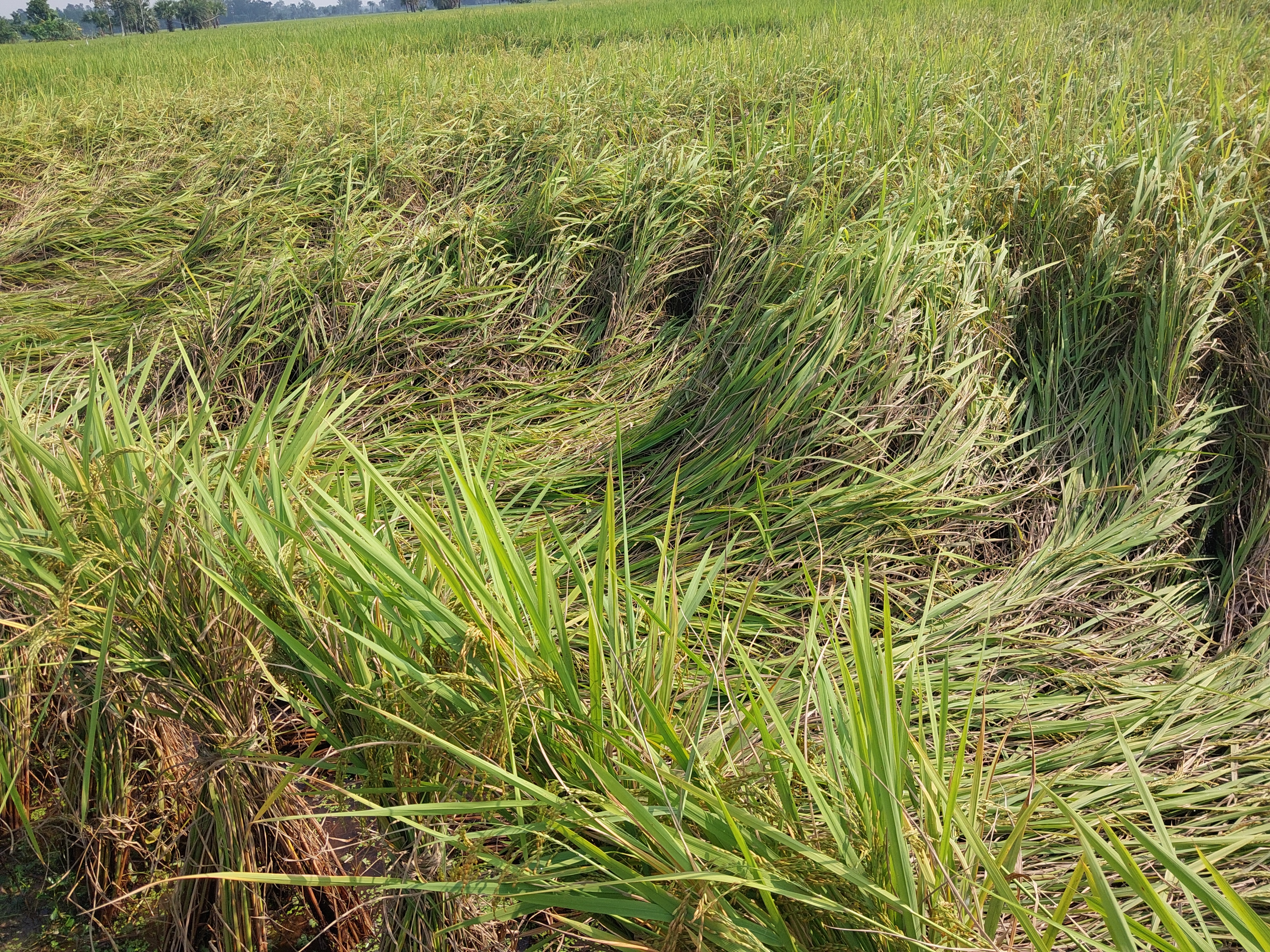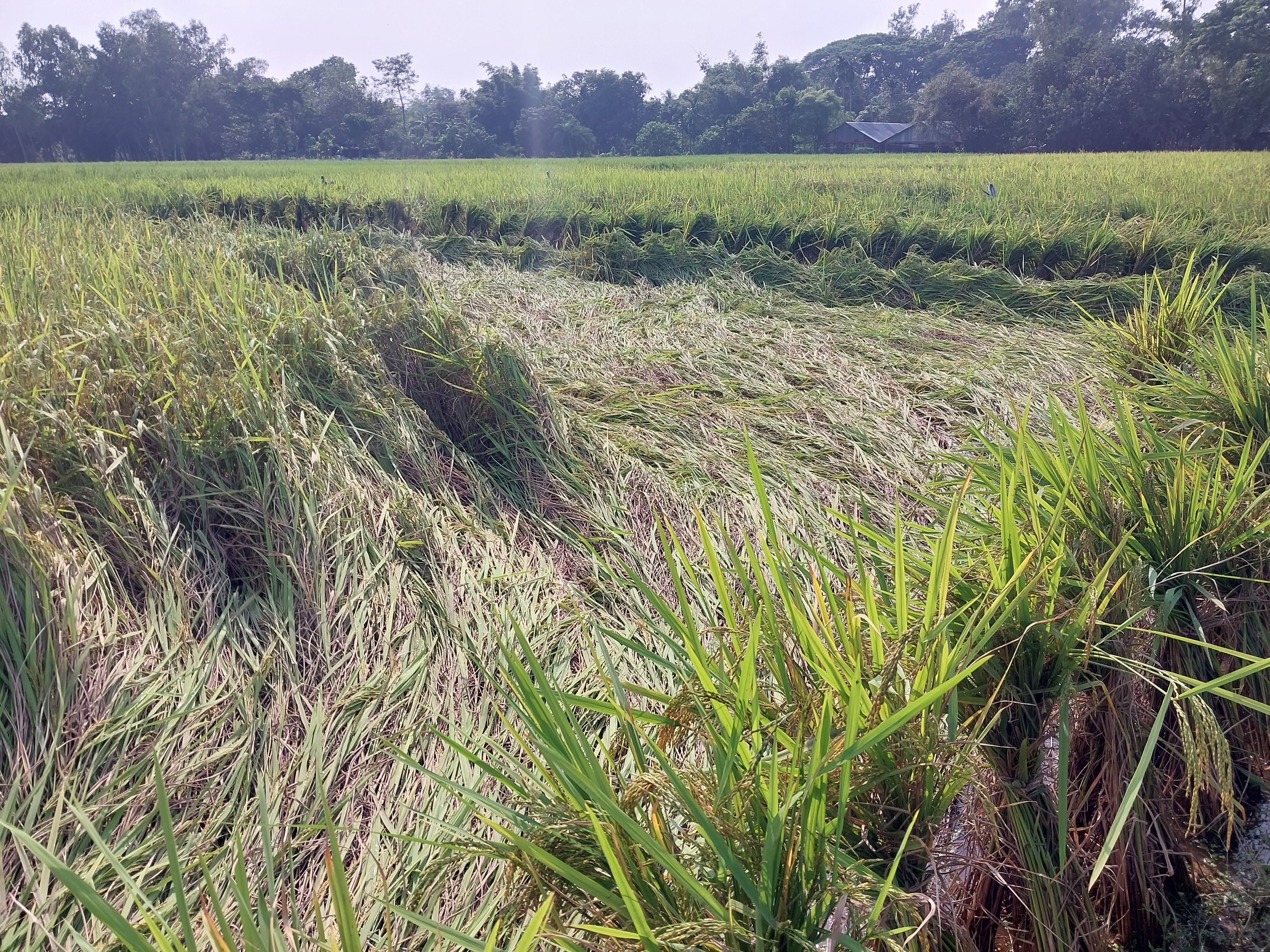 I went on a trip to the land yesterday. But I found the low pressure caused a light storm. A lot of paddy has been damaged by the rain. I have collected two pictures from there.