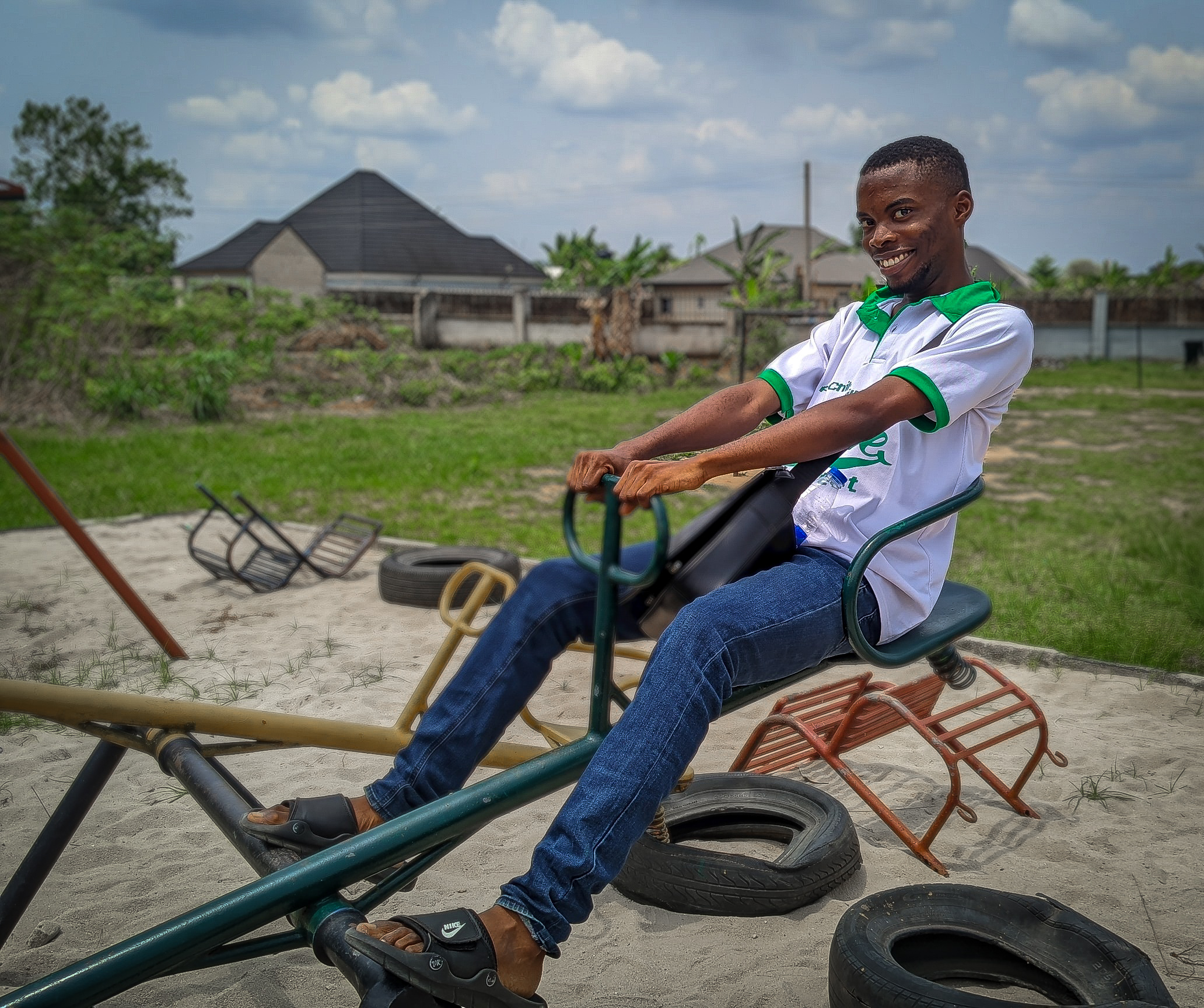 There's nothing really formal about the photo. It's just me having a good time on the see-saw. Sitting on the see-saw brought memories that made me cry. I would turn and see the pupils jumping up and down and reciting timetable. I'll then remember those days I'll be in primary school. I'll be given lunch to take to school. My parents would come and pick me from school, I'll be on the swing for hours enjoying the benefits of being a child.