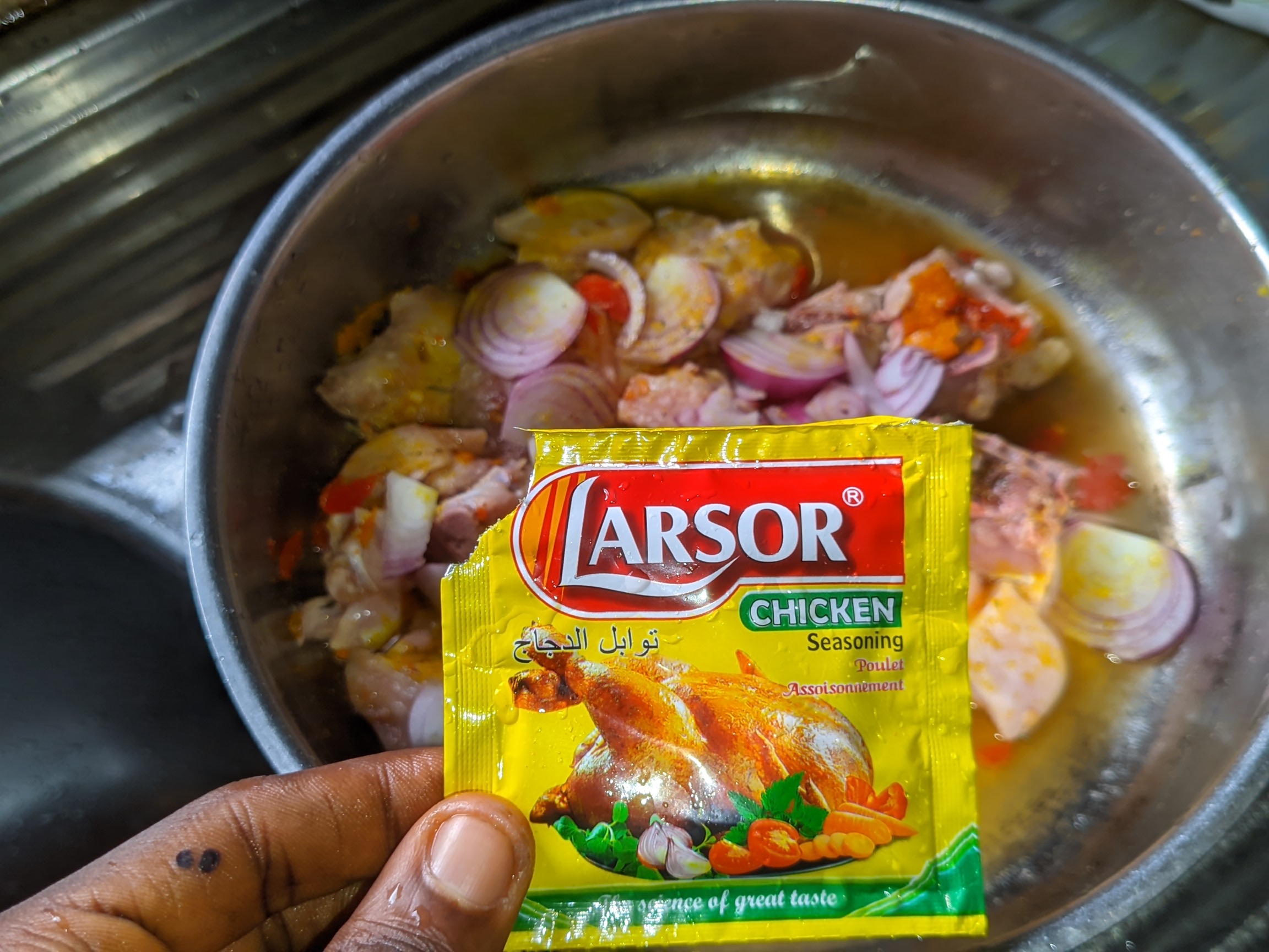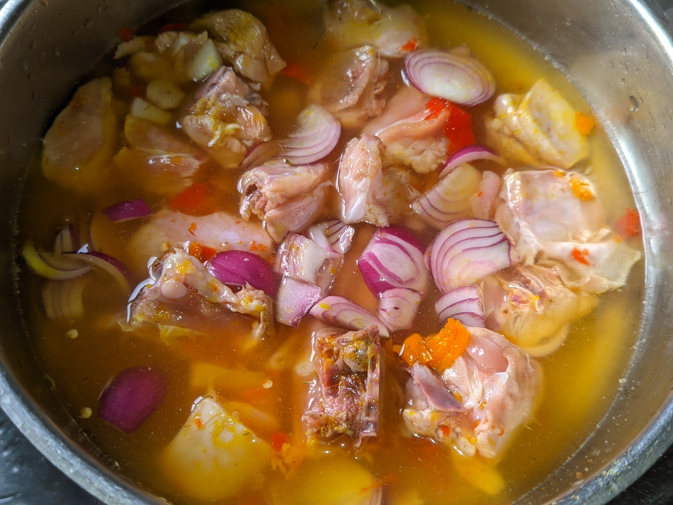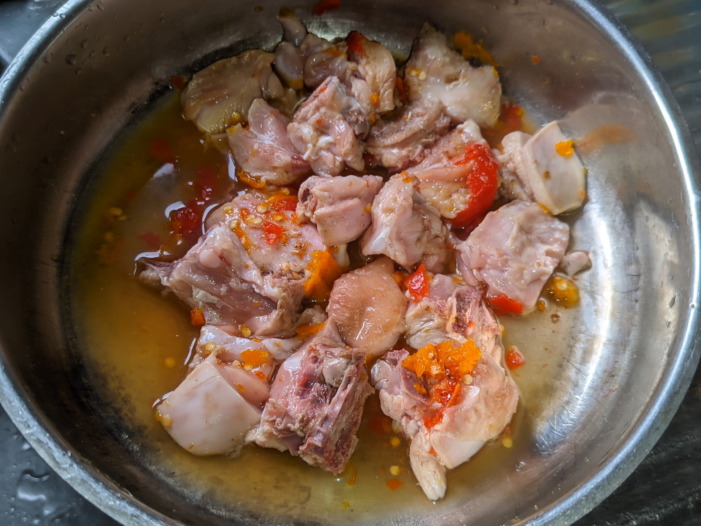 - I washed my chicken and contained it in a bowl metal plate. I added half spoon of salt, 3 peppers, half bulb of onion and 1 cube of Maggi. I added a bit of water to level and then placed it on medium heat for the chicken to cook. I made sure I mixed it well to blend.