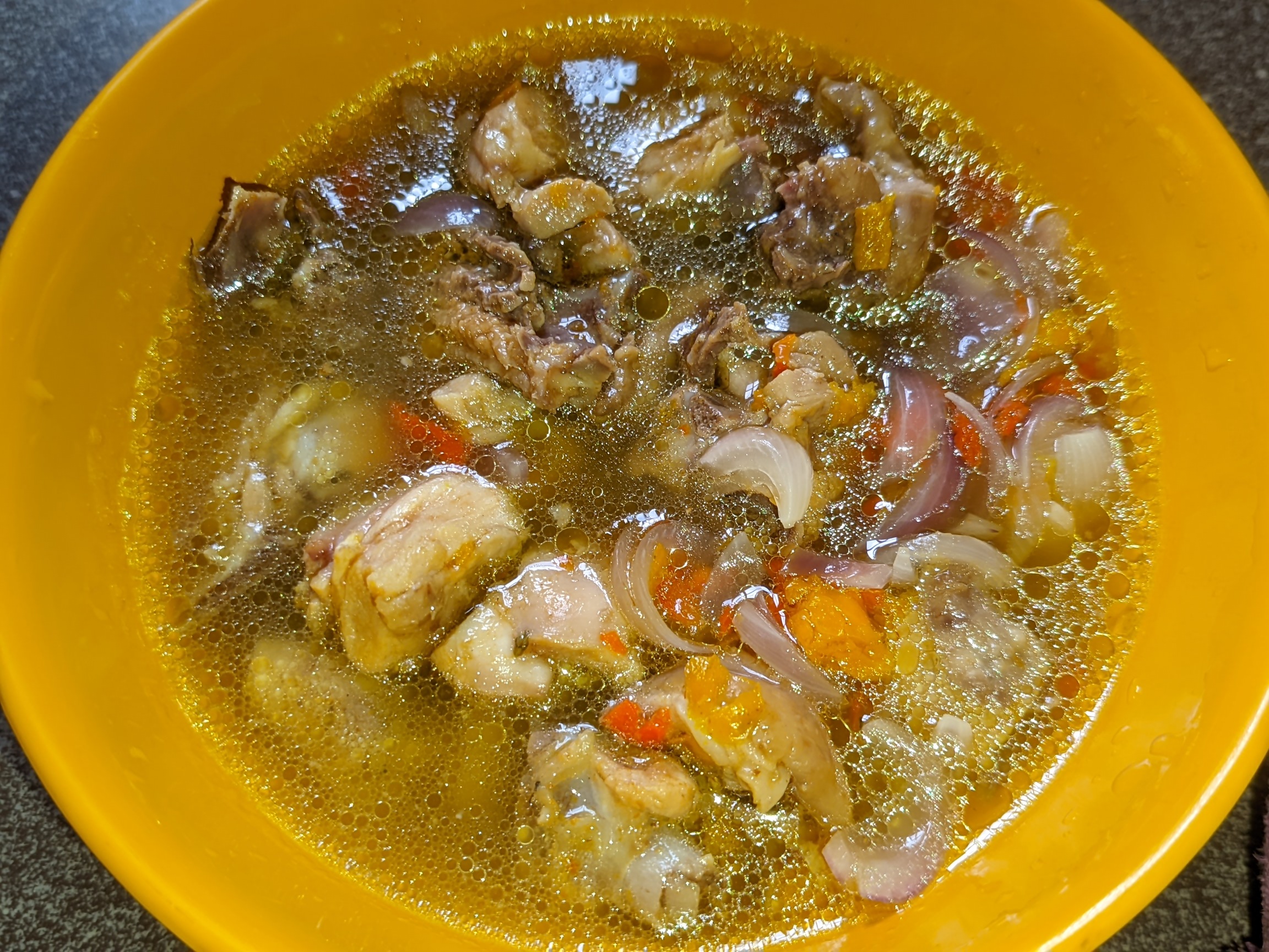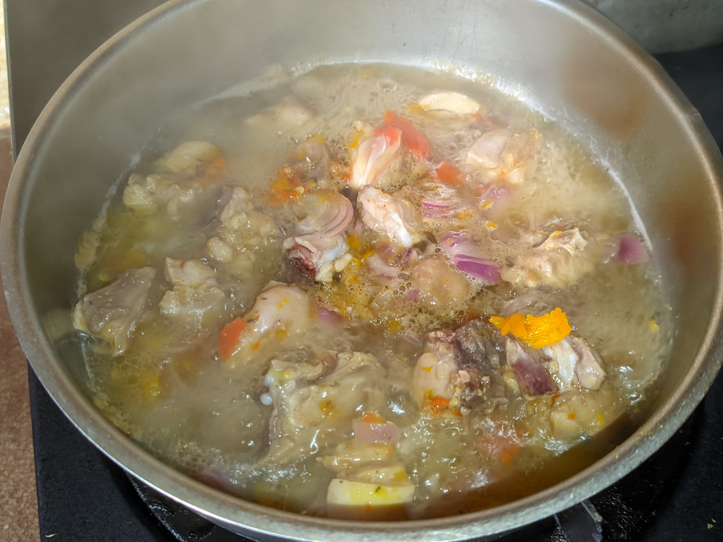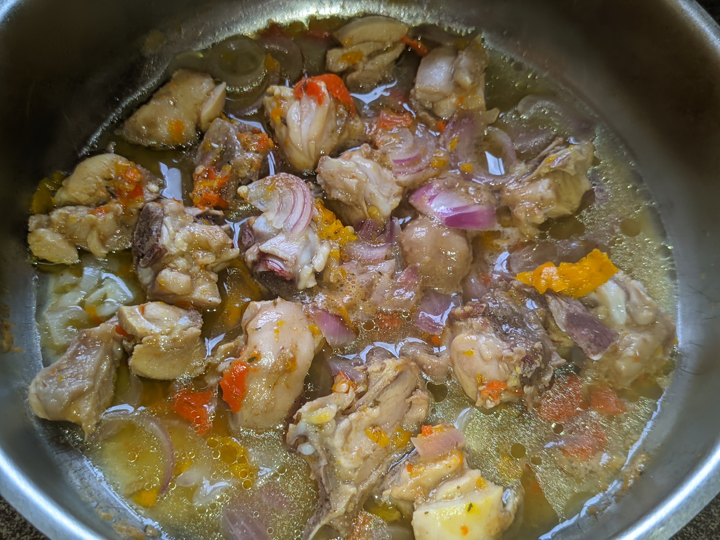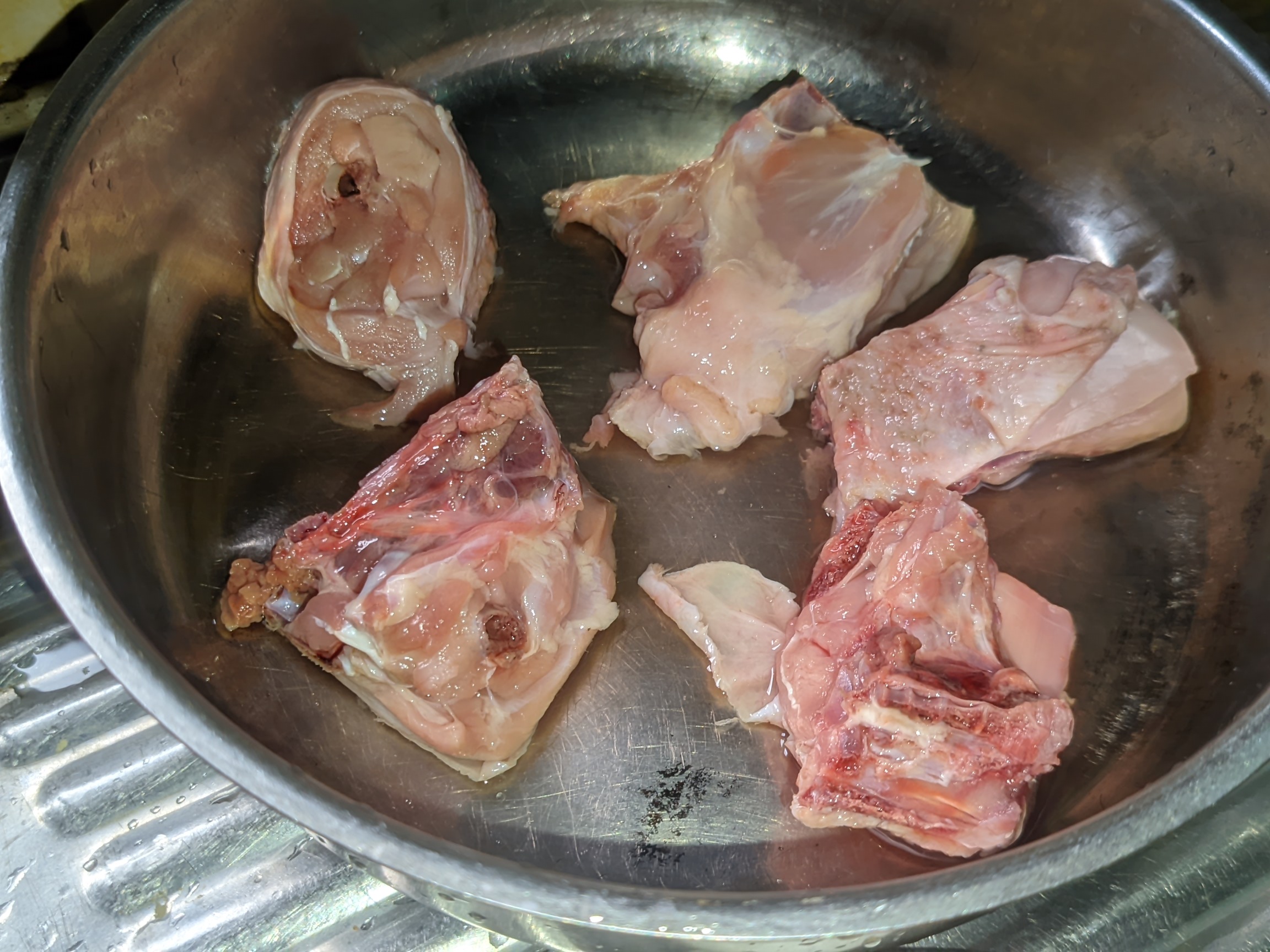 - I washed my chicken and contained it in a bowl metal plate. I added half spoon of salt, 3 peppers, half bulb of onion and 1 cube of Maggi. I added a bit of water to level and then placed it on medium heat for the chicken to cook. I made sure I mixed it well to blend.