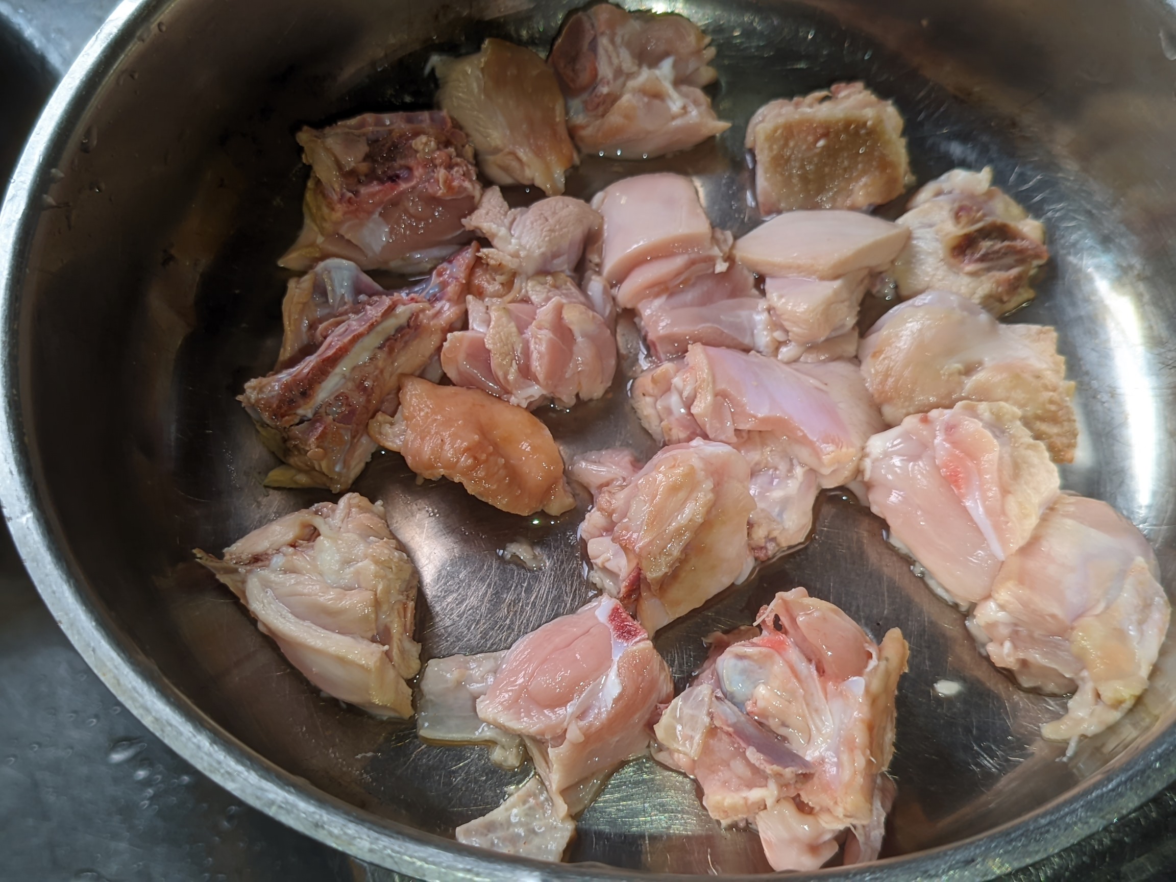 - My rice was done before then. I filtered the water and washed the rice with a siever and then I returned it back to the pot with water filled in it to level and salt added to the rice to taste.. I then placed it on heat yo parboil. My chicken was done and I preserved the water which I would use to prepare my sauce.