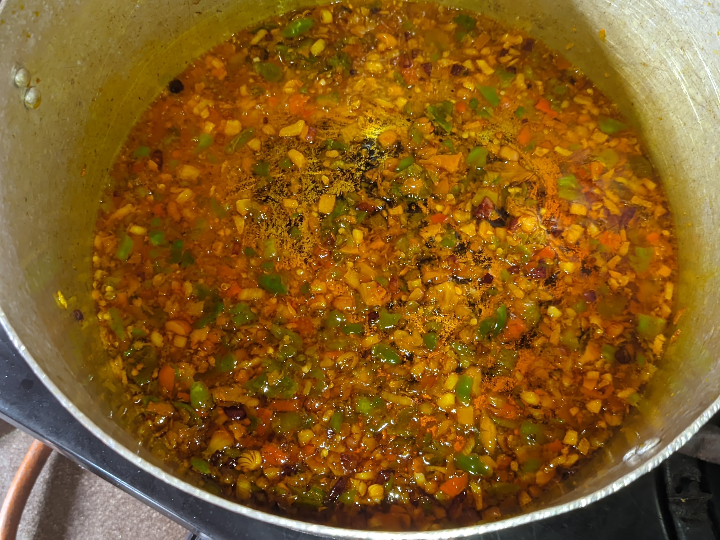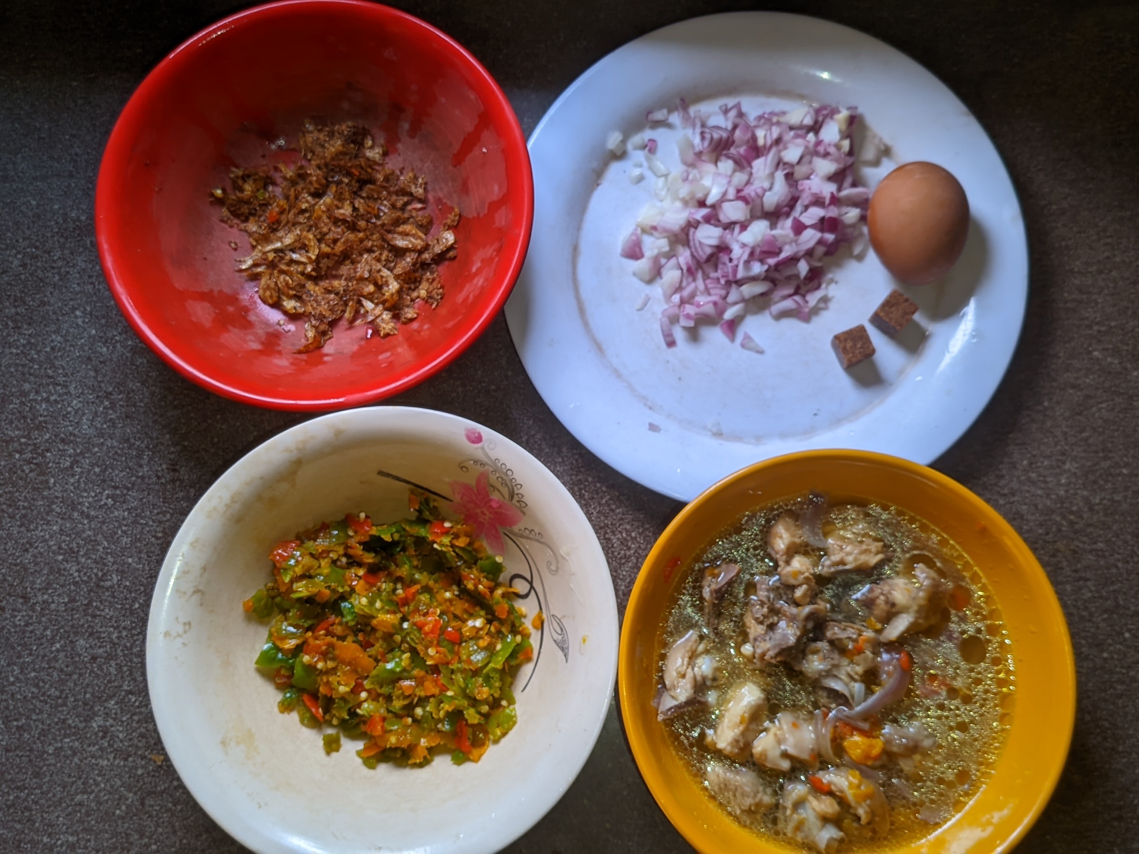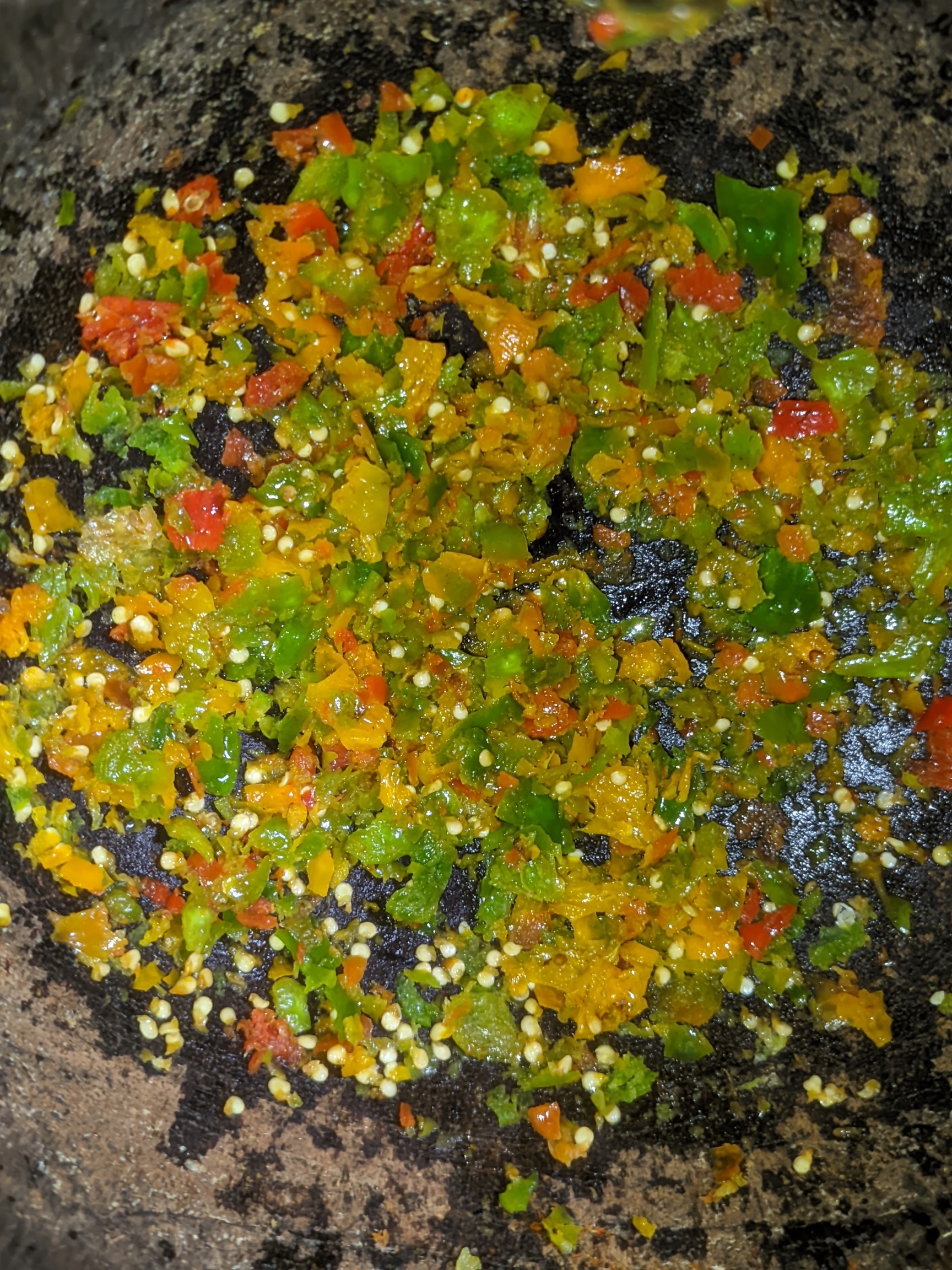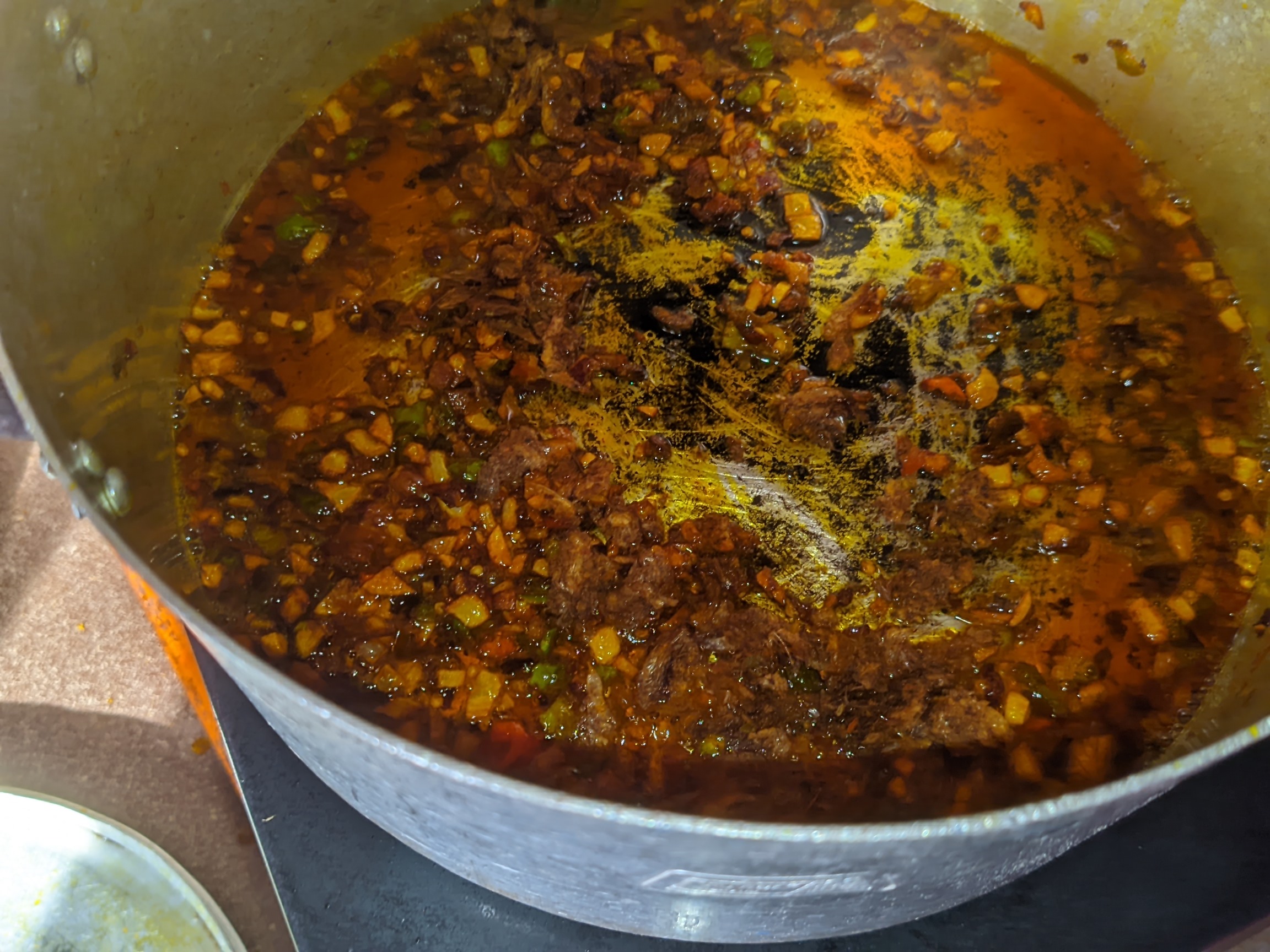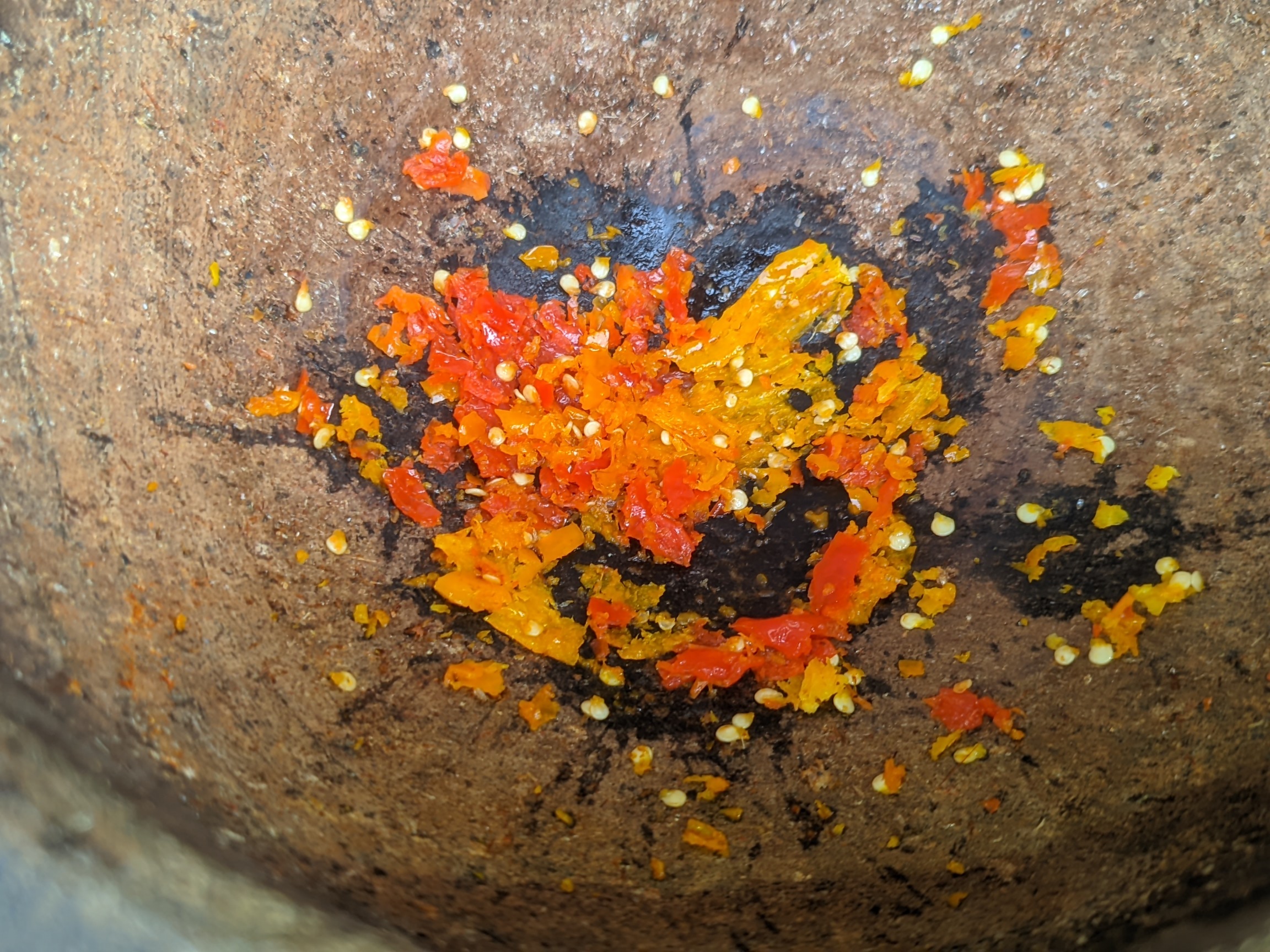 - I sliced my onions and ground my pepper, about 15 pepper in a mortar. I then ground my crayfish and contained them in plates. I started by bleaching my oil on medium heat for 5 minutes before adding my onions. I allowed the onions to heat for 3 minutes before adding my pepper and heating it for 7 minutes to reduce the pepper effect and also make it brown instead of red.