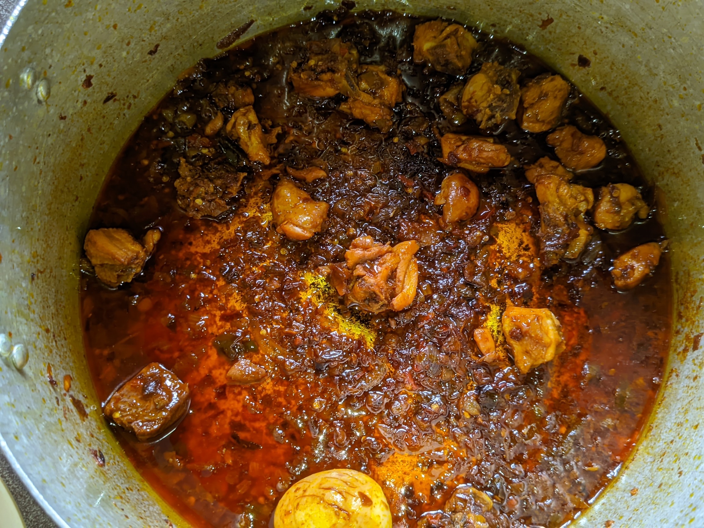 - After that, I added my crayfish, egg and chicken with its water and stirred for a few minutes for the chicken to fry before bringing it down from heat.