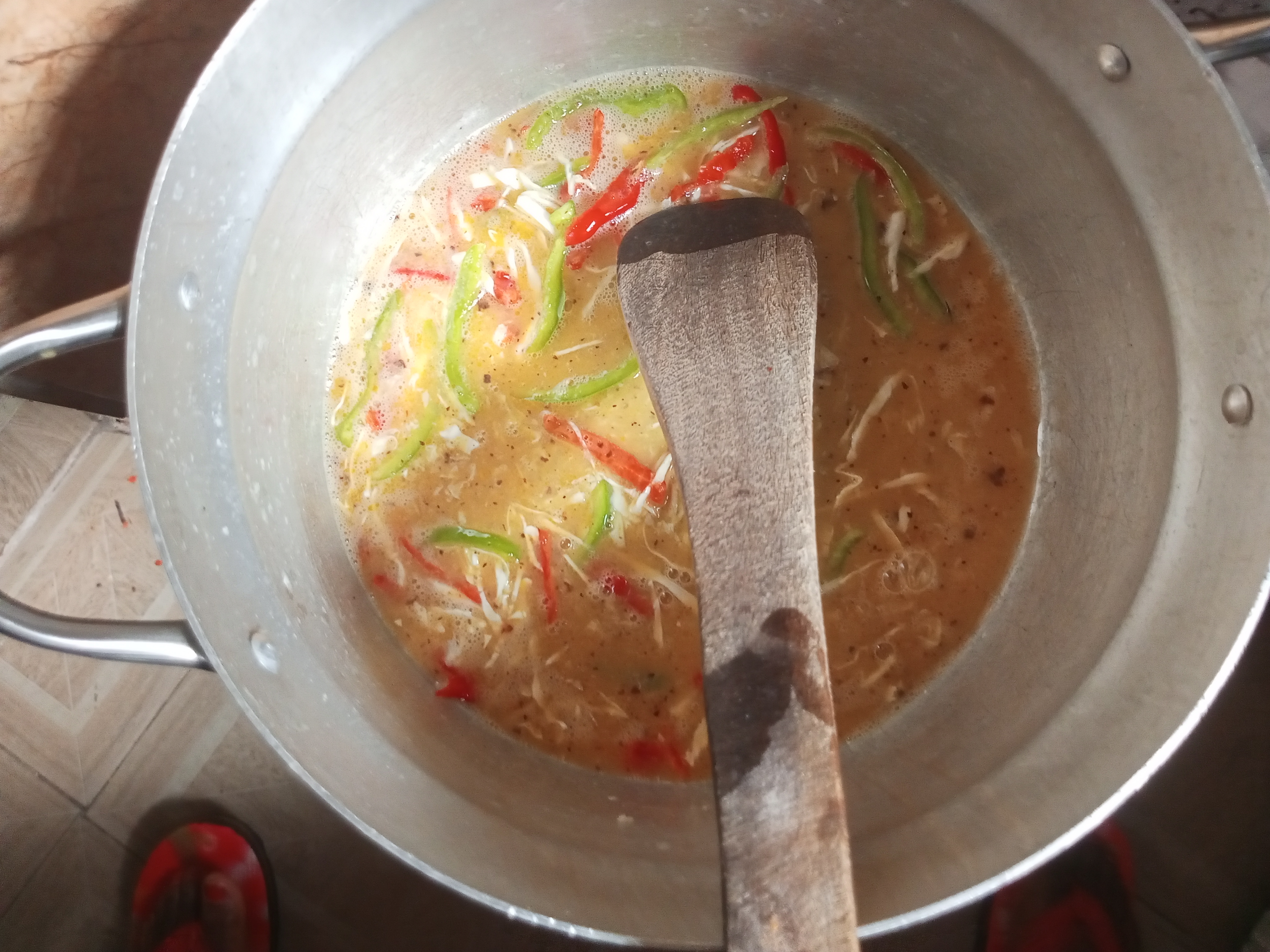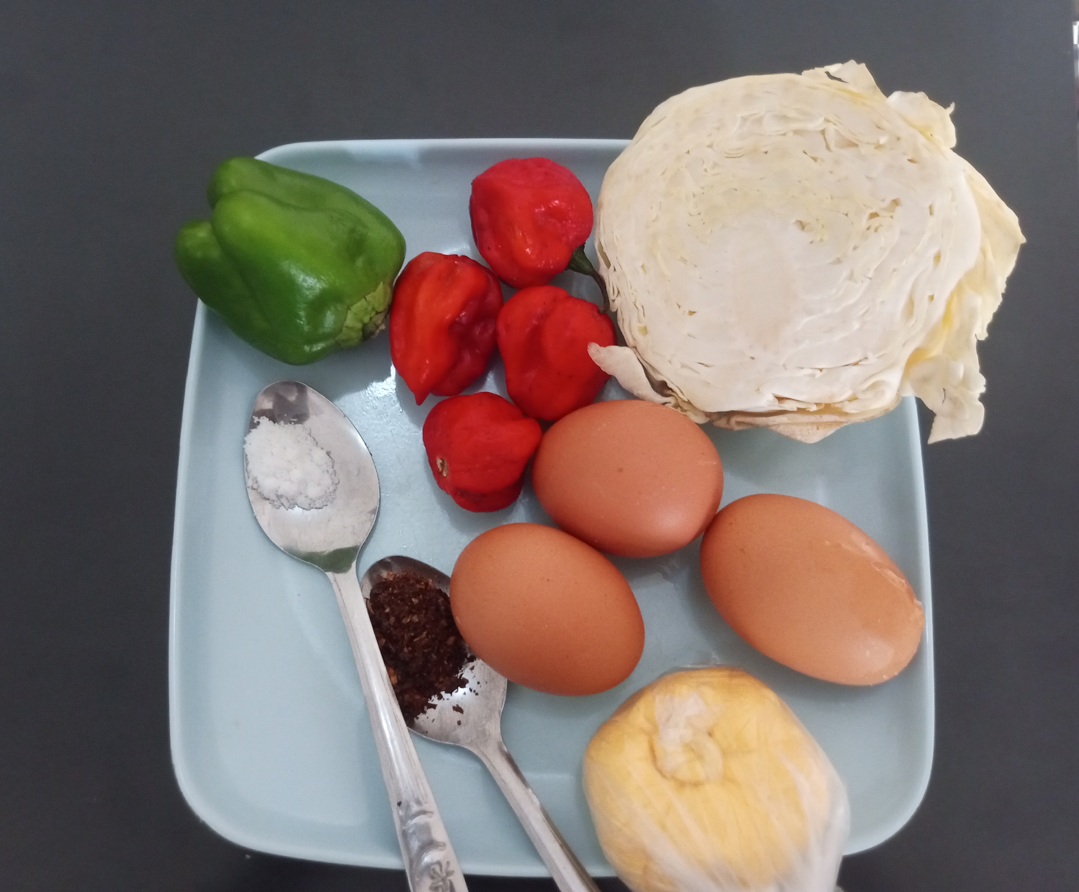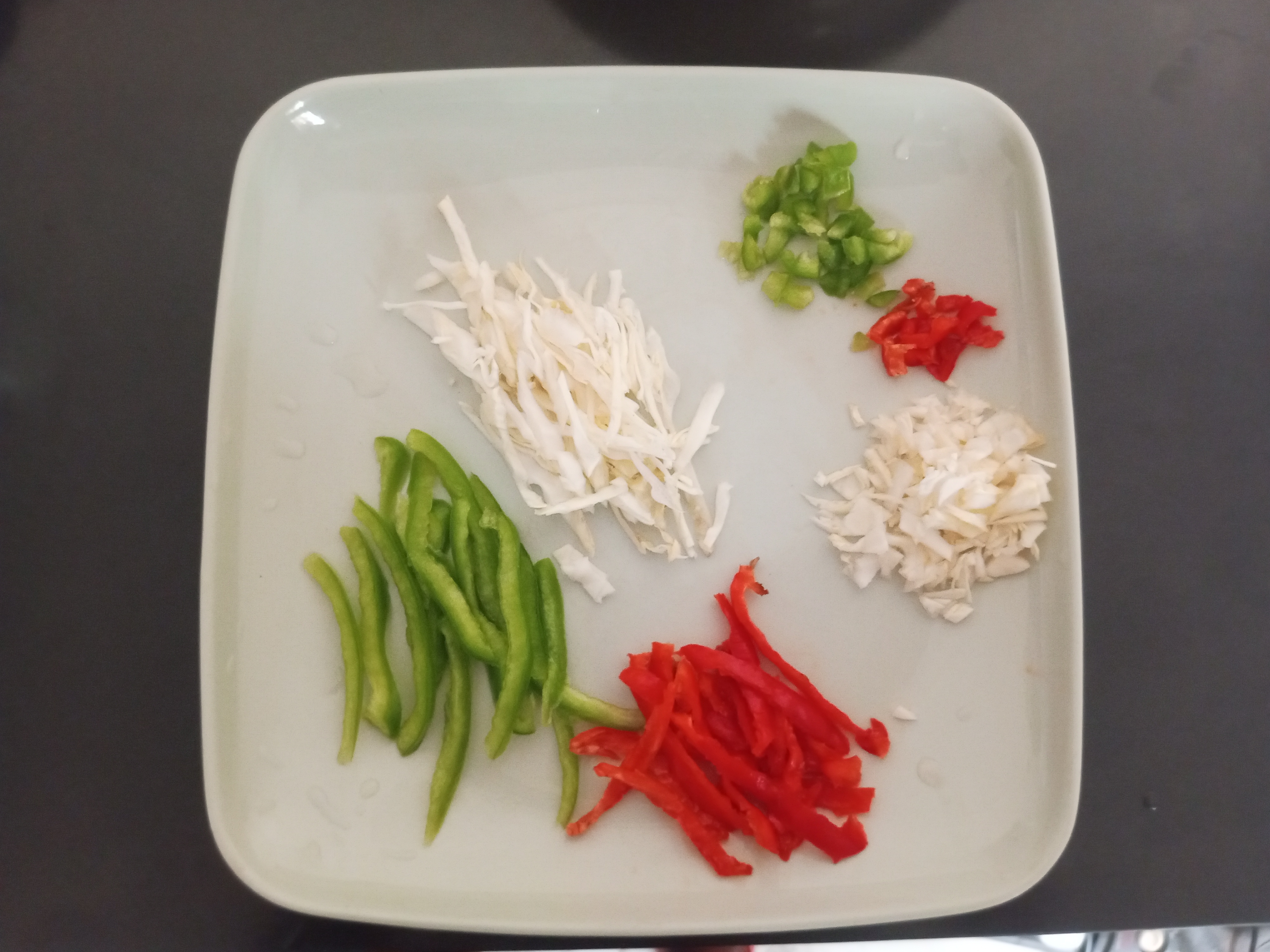 - Wash veggies clean and Slice veggies ( cabbage, red pepper and green pepper into a clean plate)