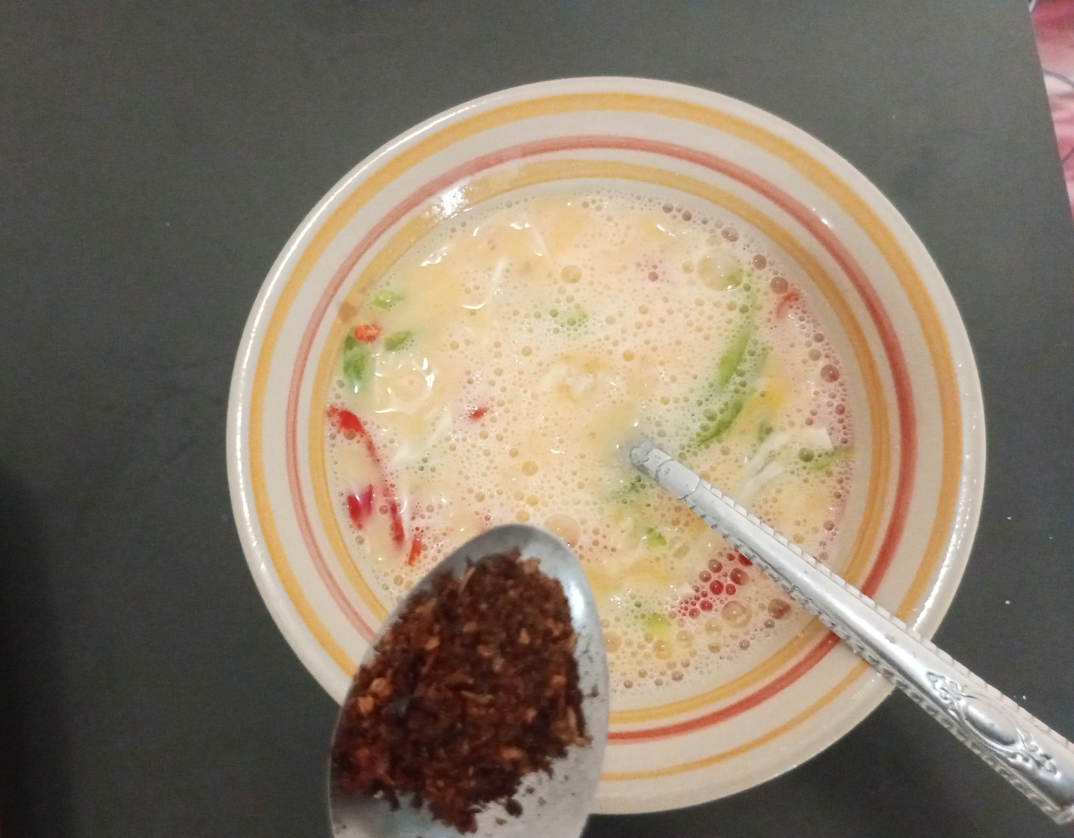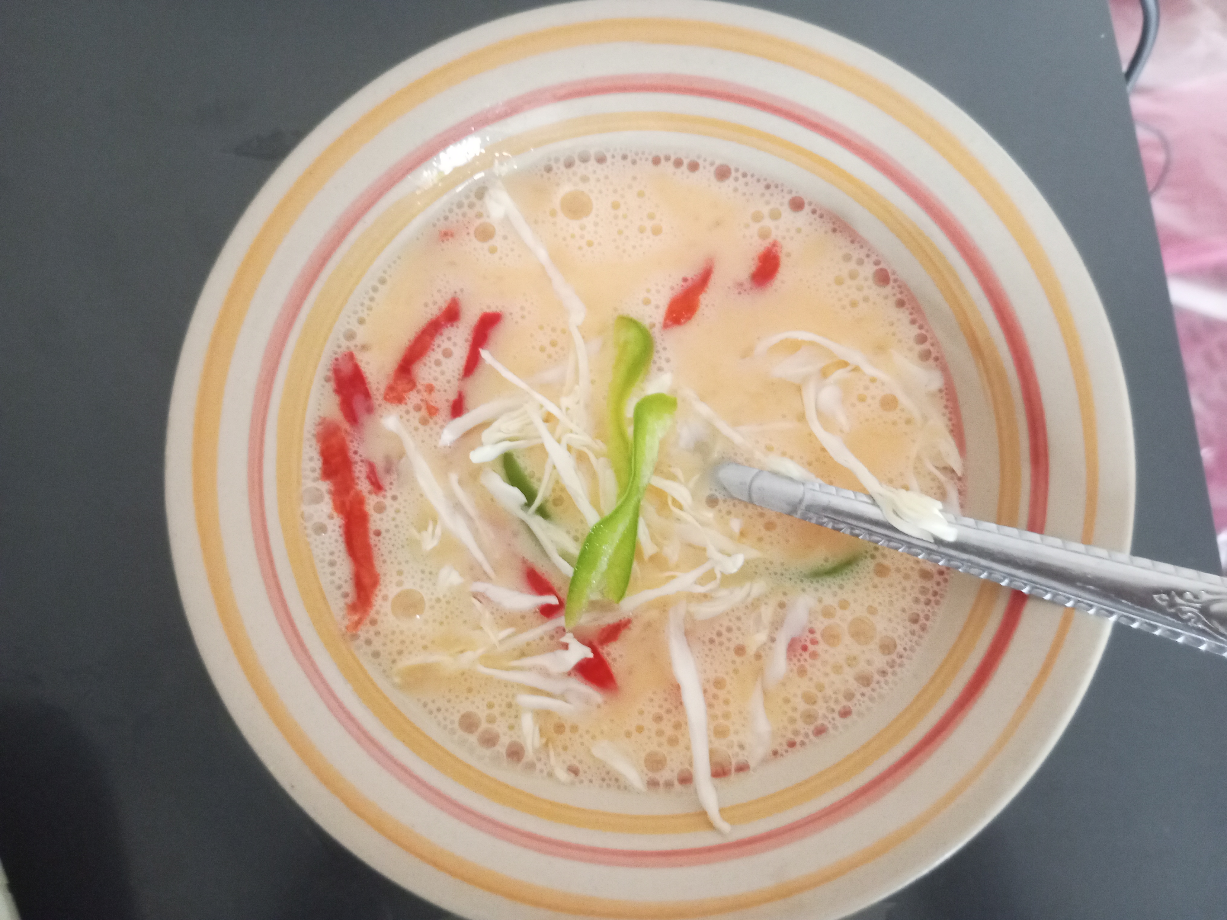 ![]() | add sliced veggies into the egg |