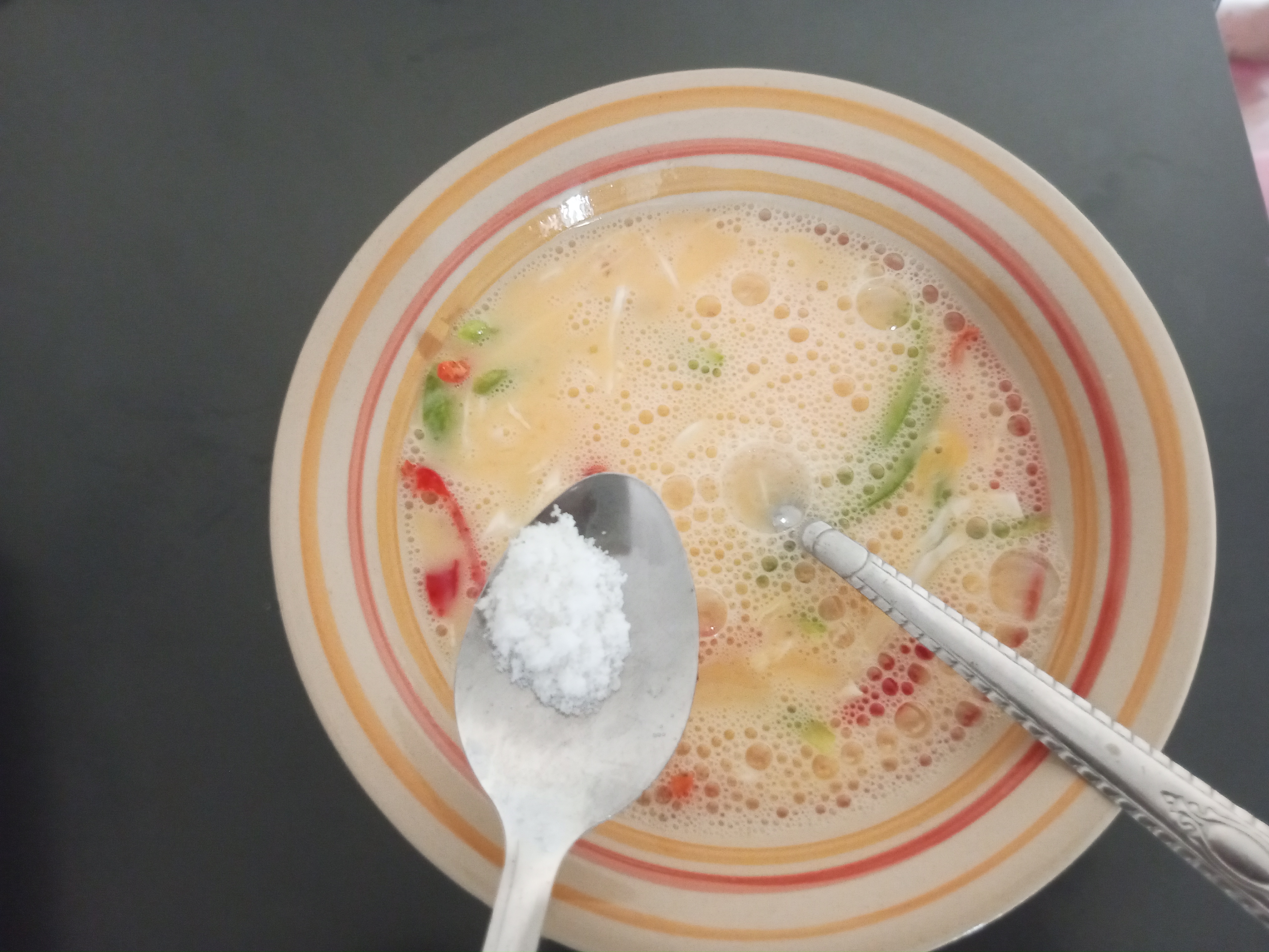 ![]() | Add the black pepper into the egg and whisk everything together |