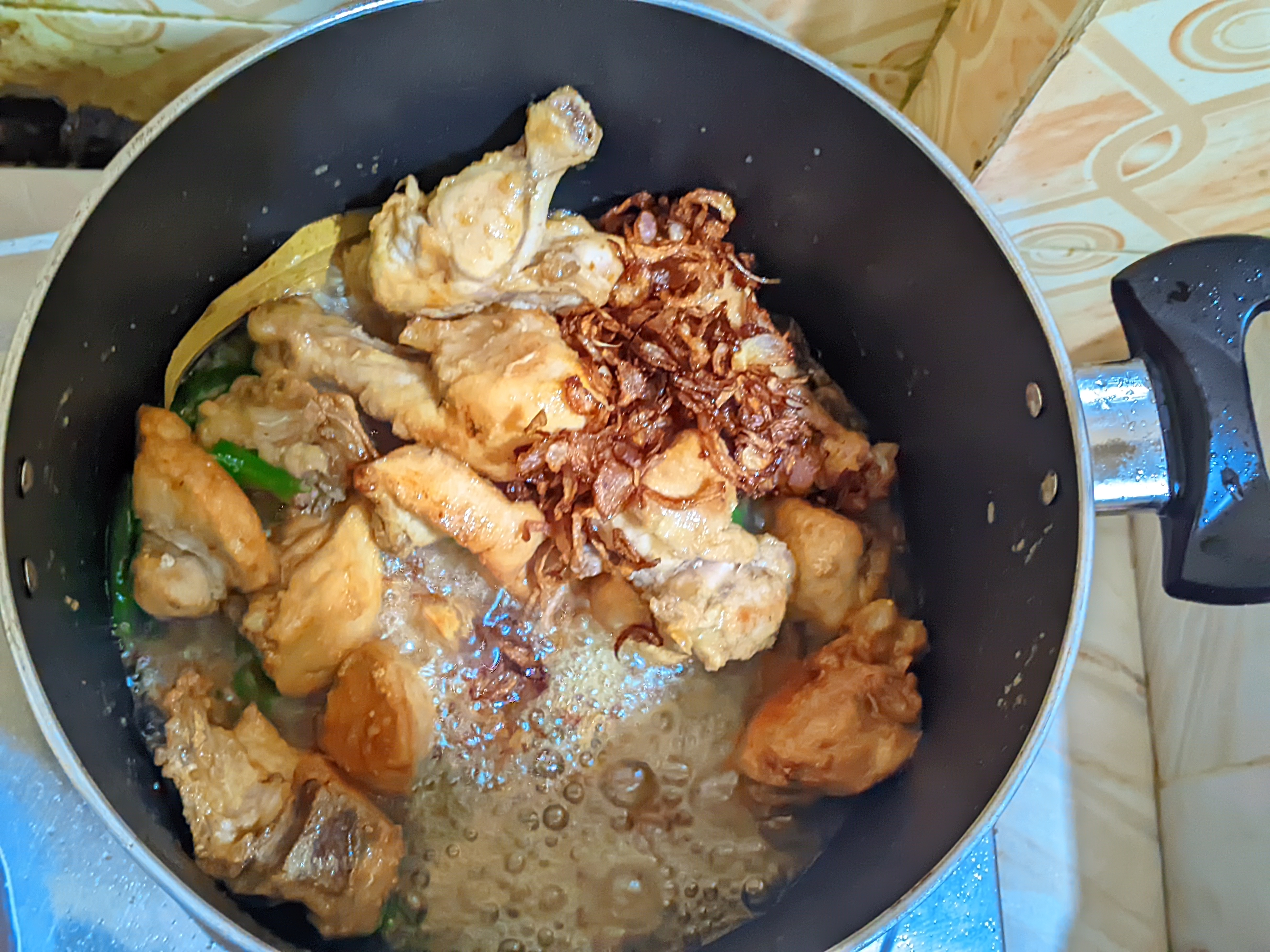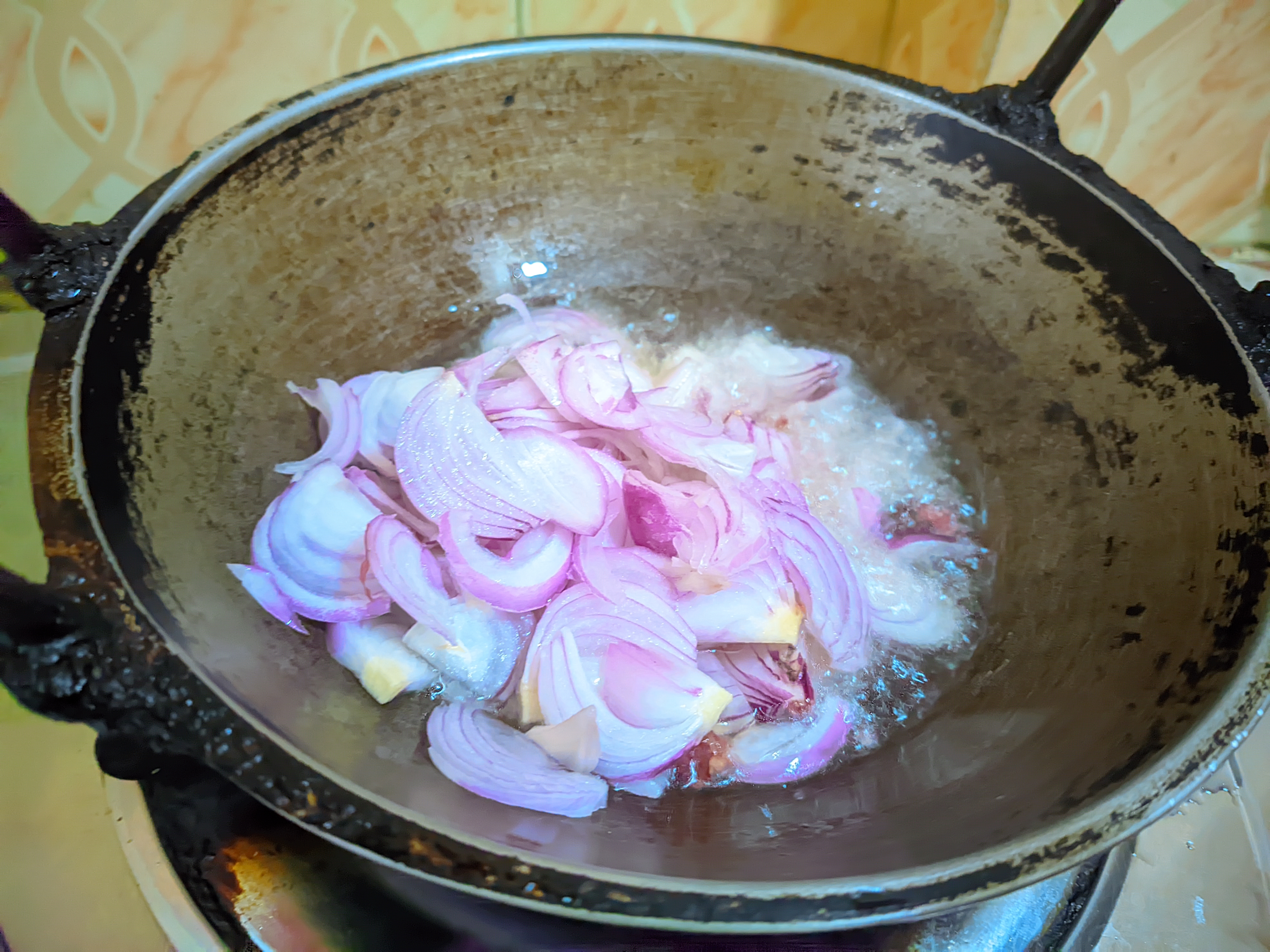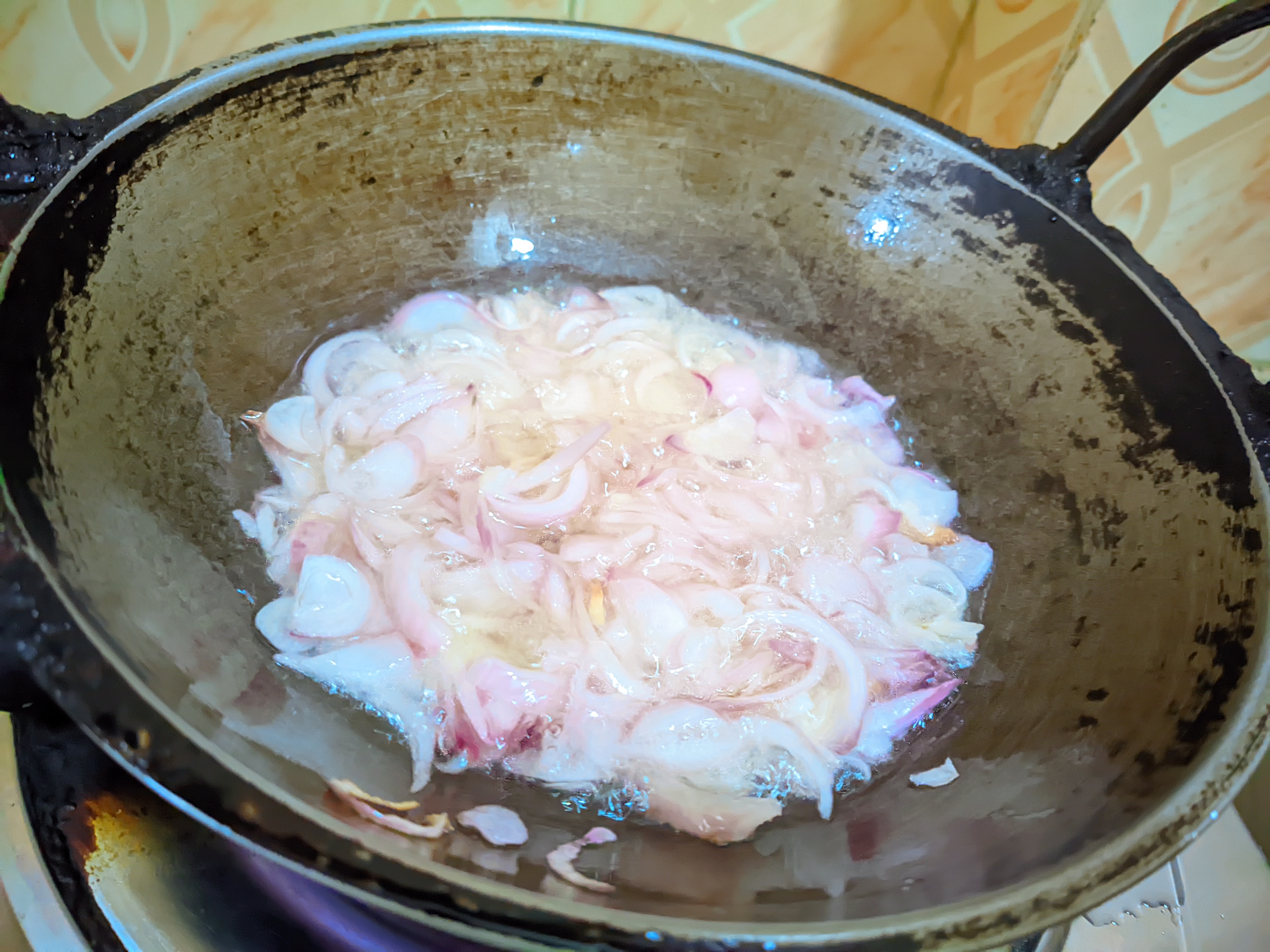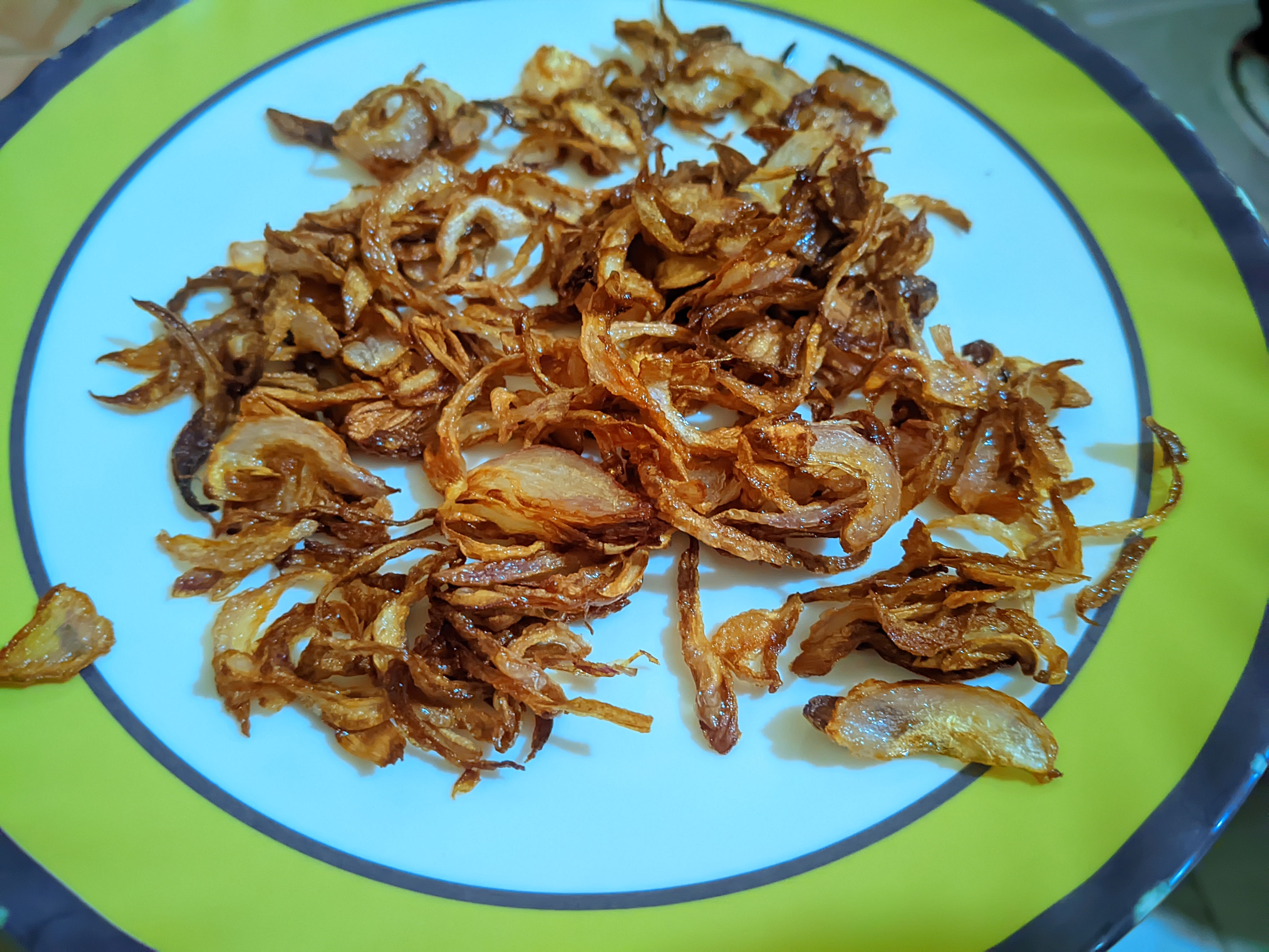 - When it gets fried, I put the green chillies and fried onions in it. And fry for some more time.