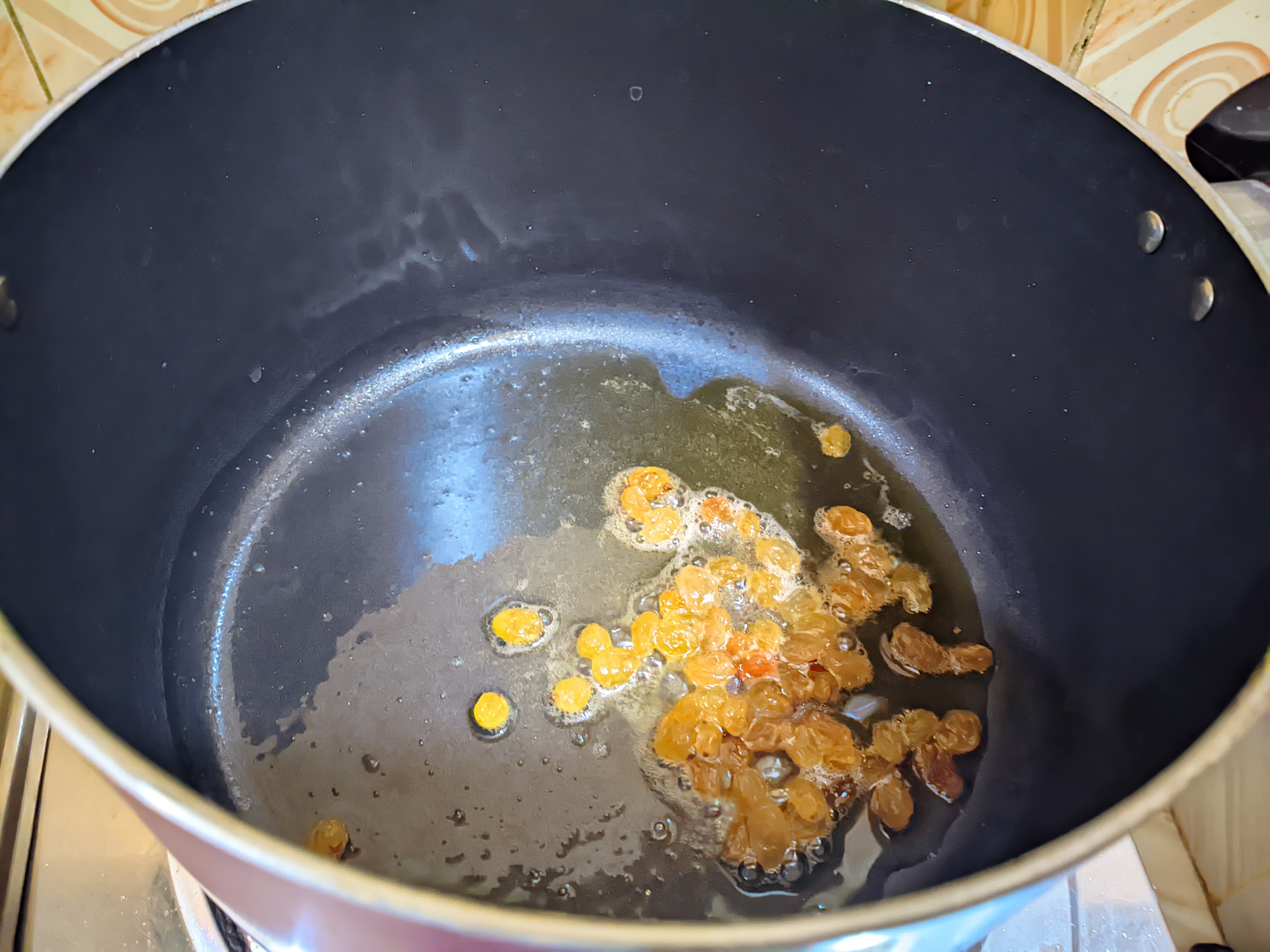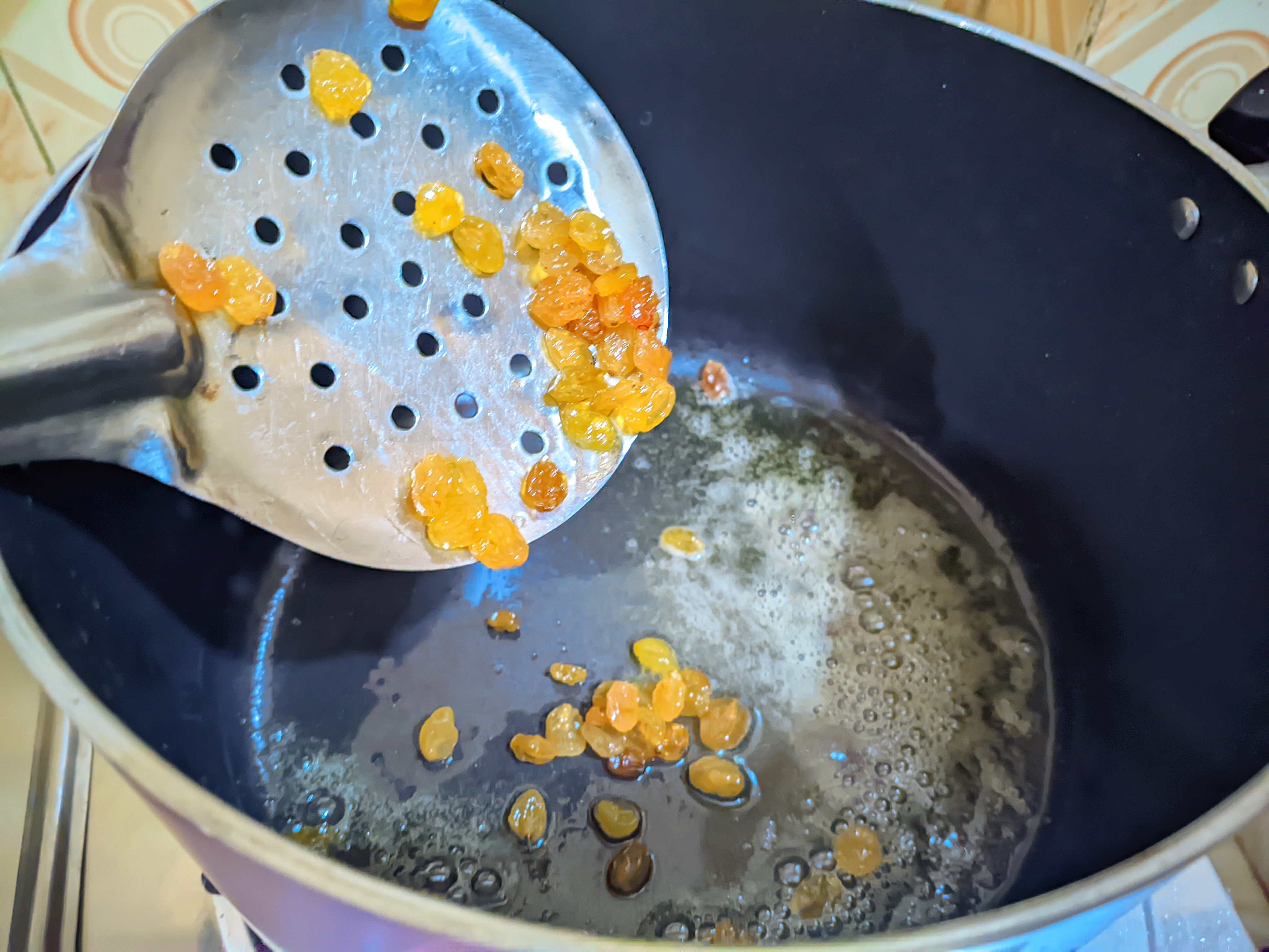 - Now I put a saucepan on the stove. I put three spoons of ghee in it. When the ghee gets hot, I put the raisins in it, fry the raisins in the ghee for a while and put it in a bowl.