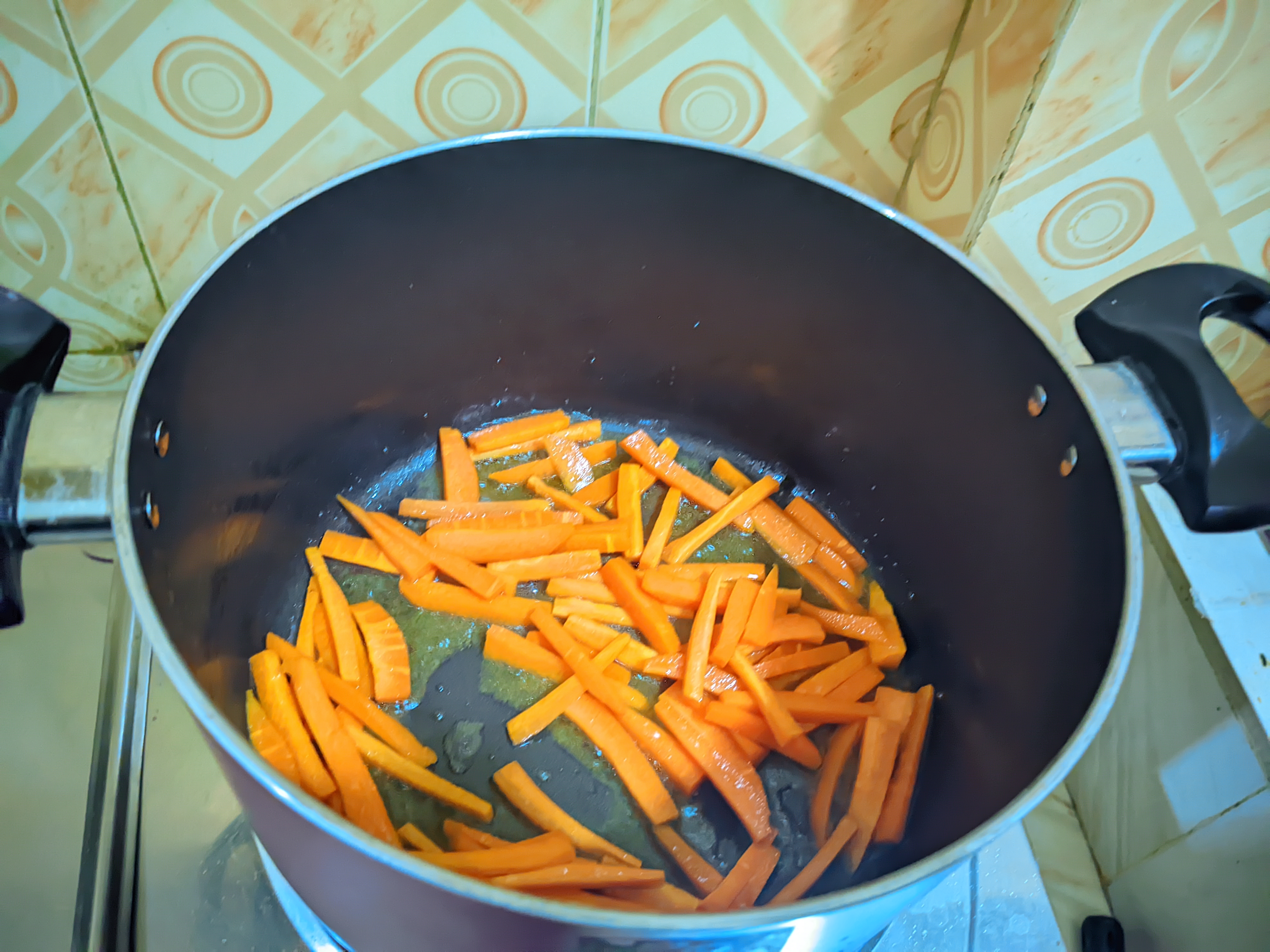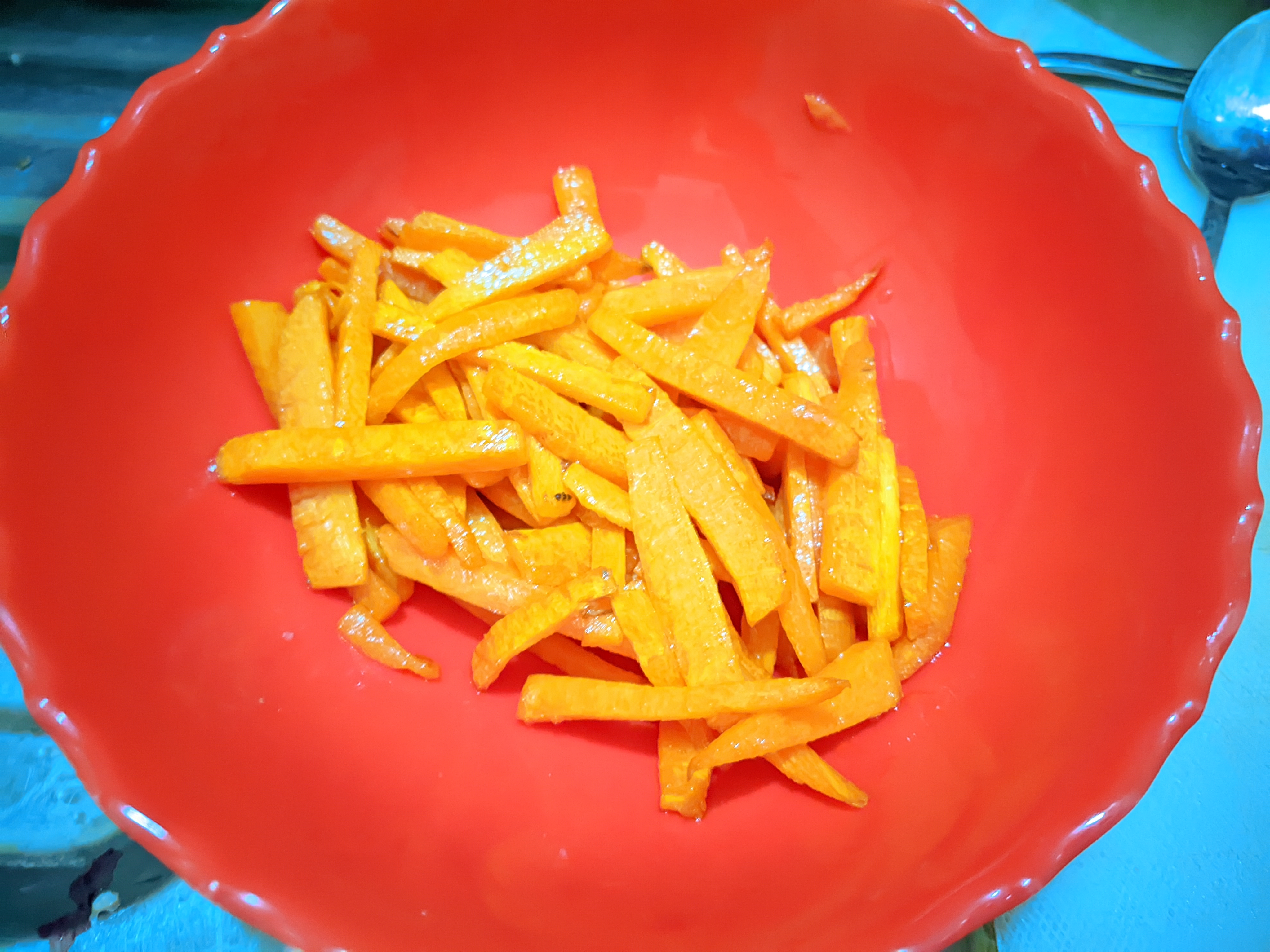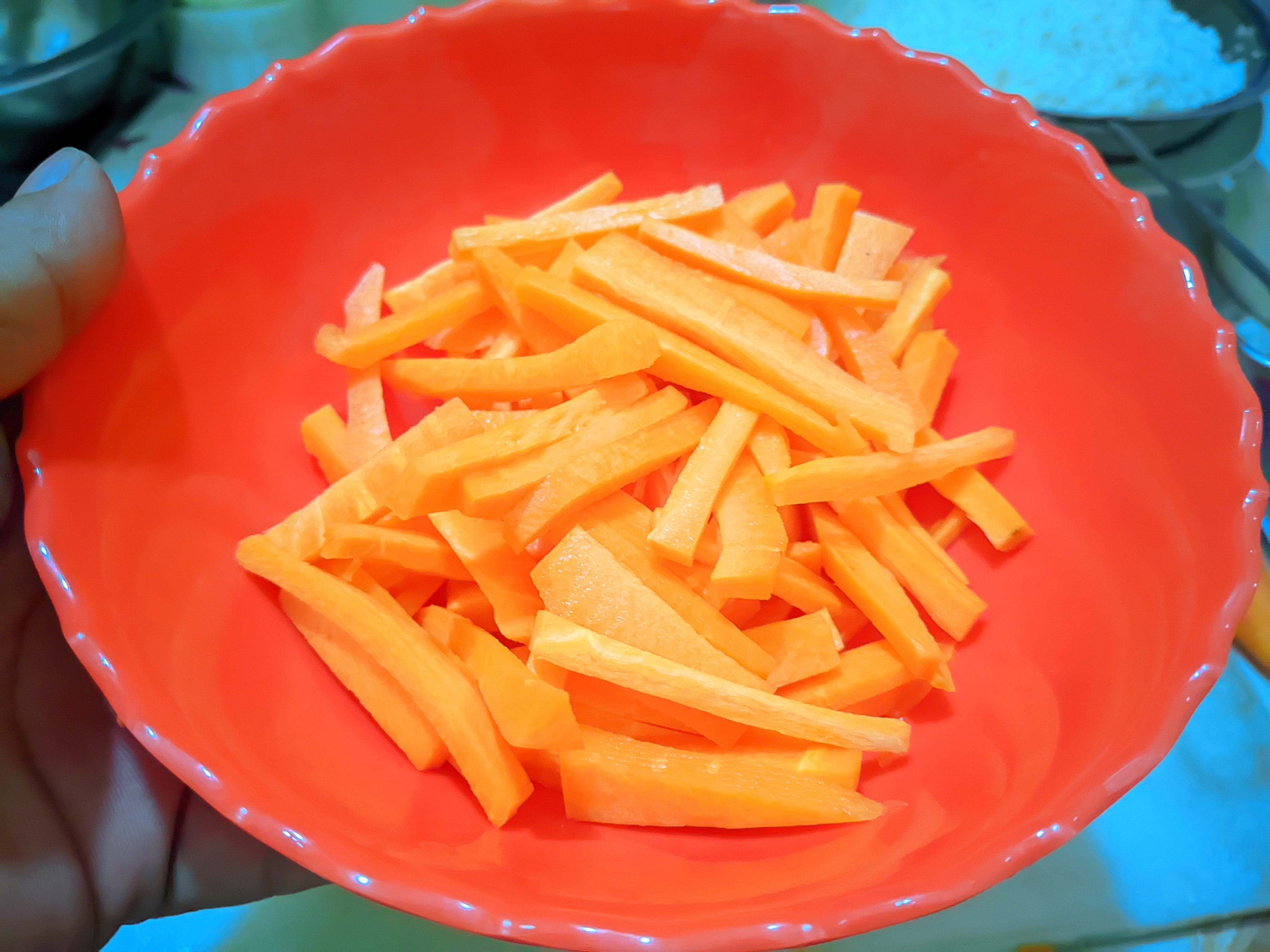 - I wash the carrots with water, cut them into small pieces, and arrange them in a bowl.