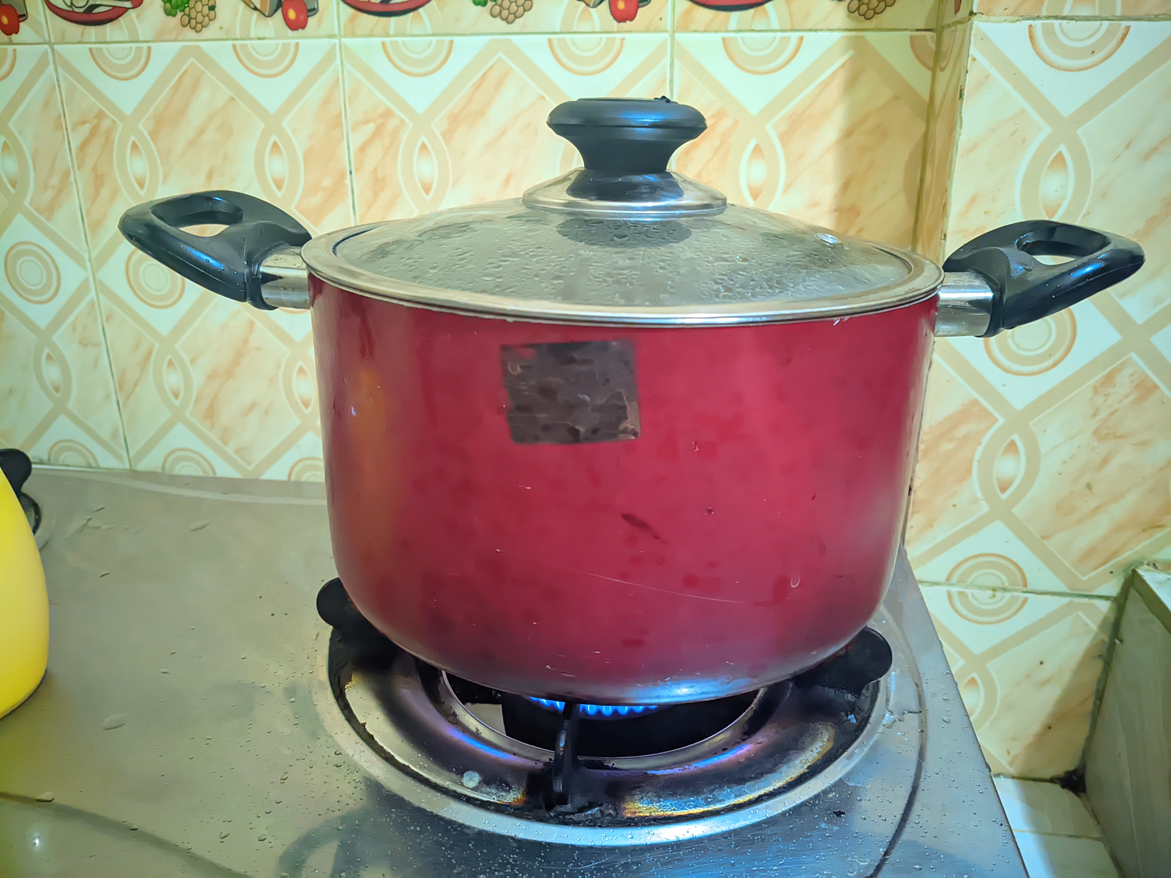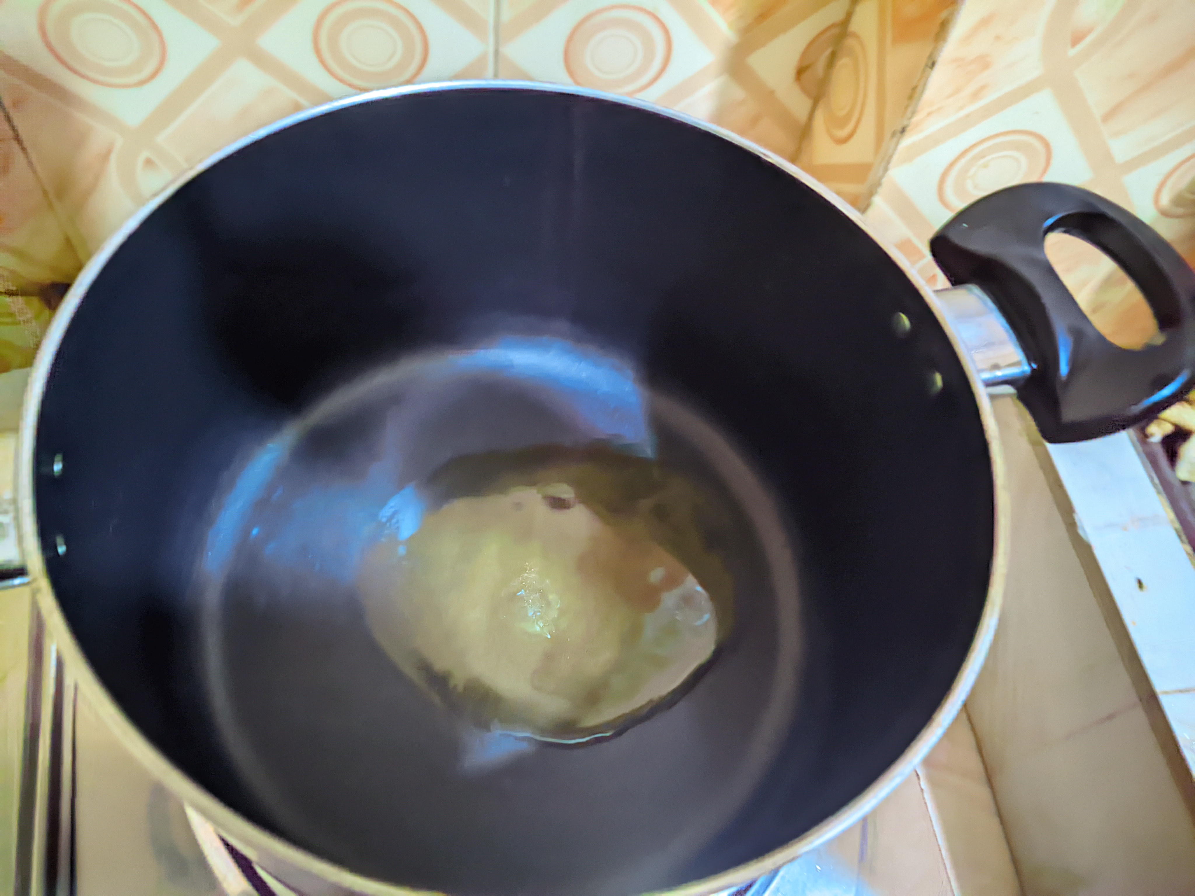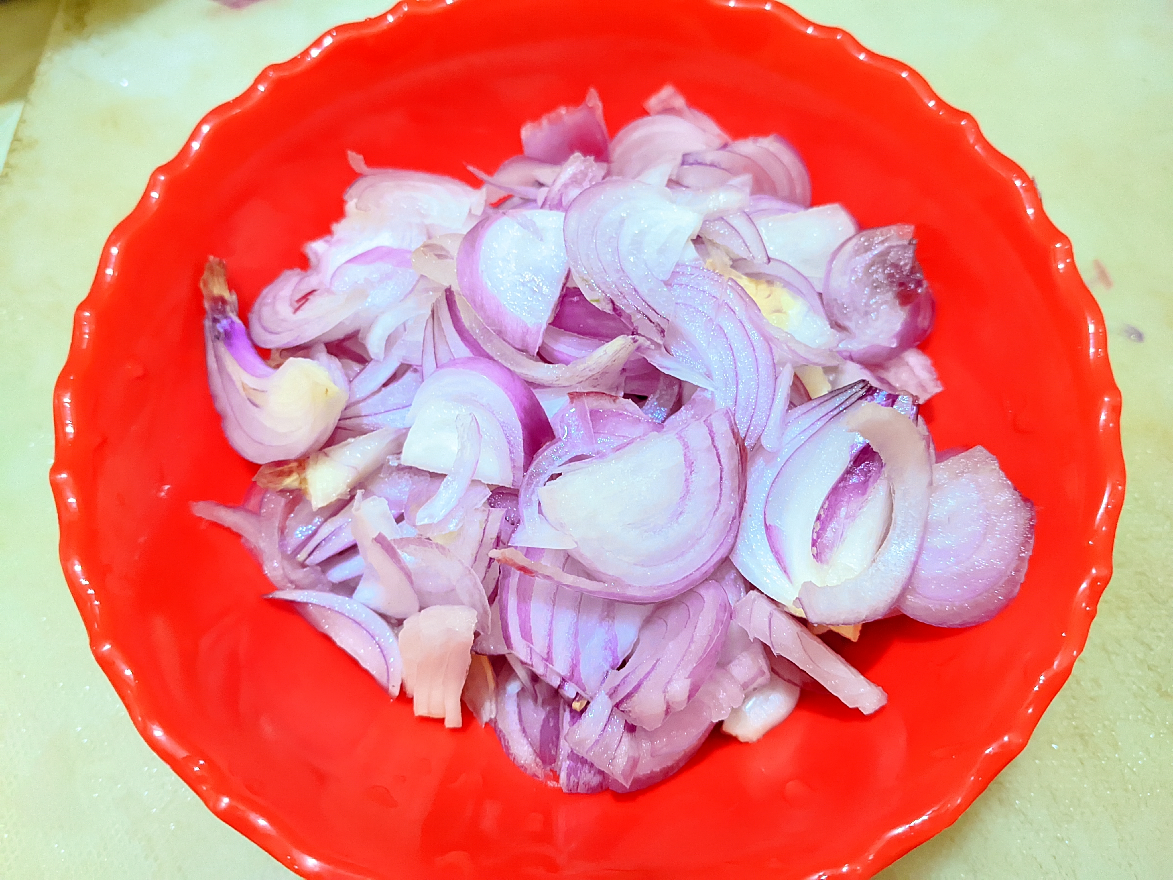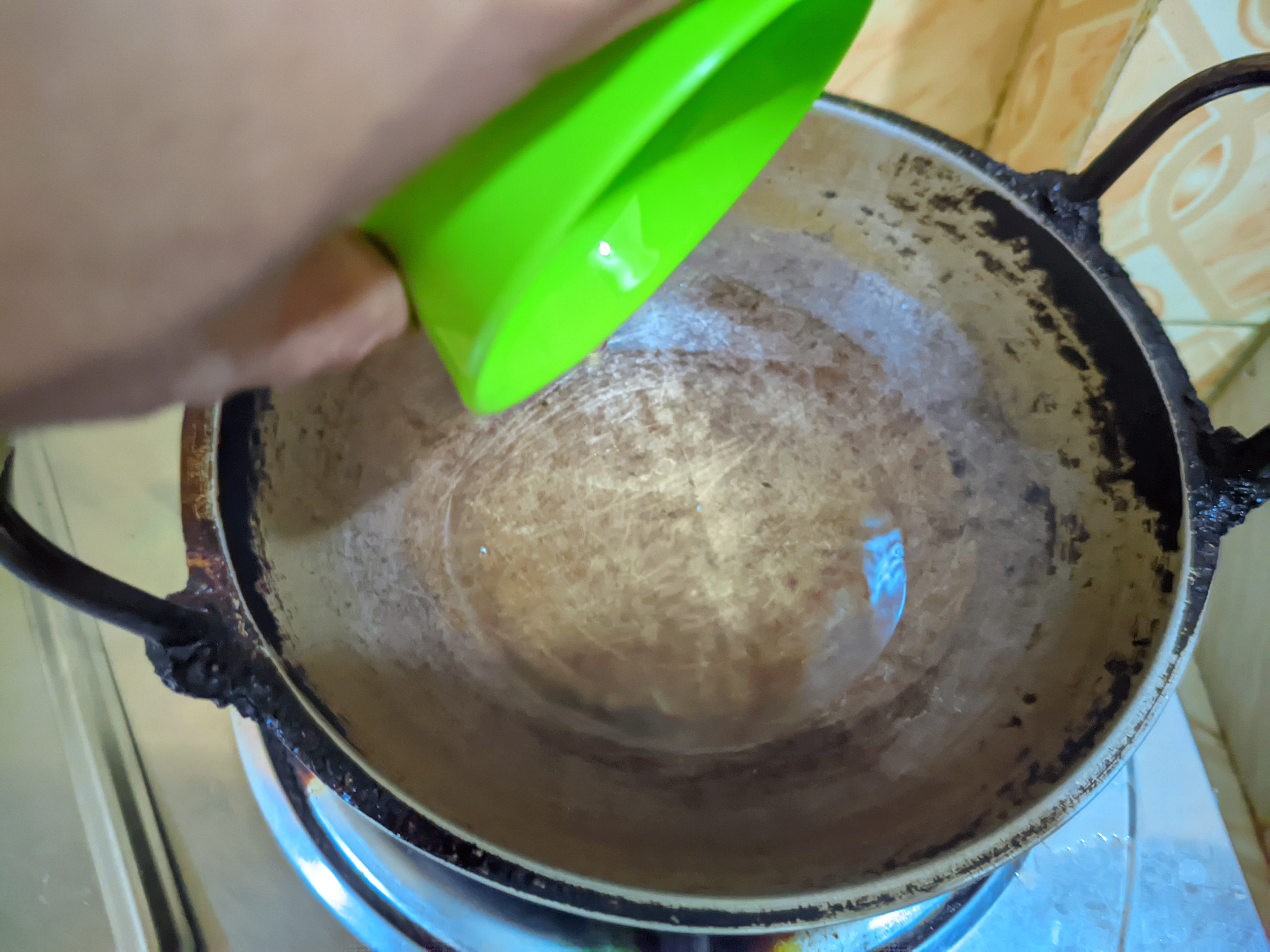 - Now I put a pan on the stove, I add a little soybean oil, when the oil is hot, I add the chopped onions inside.