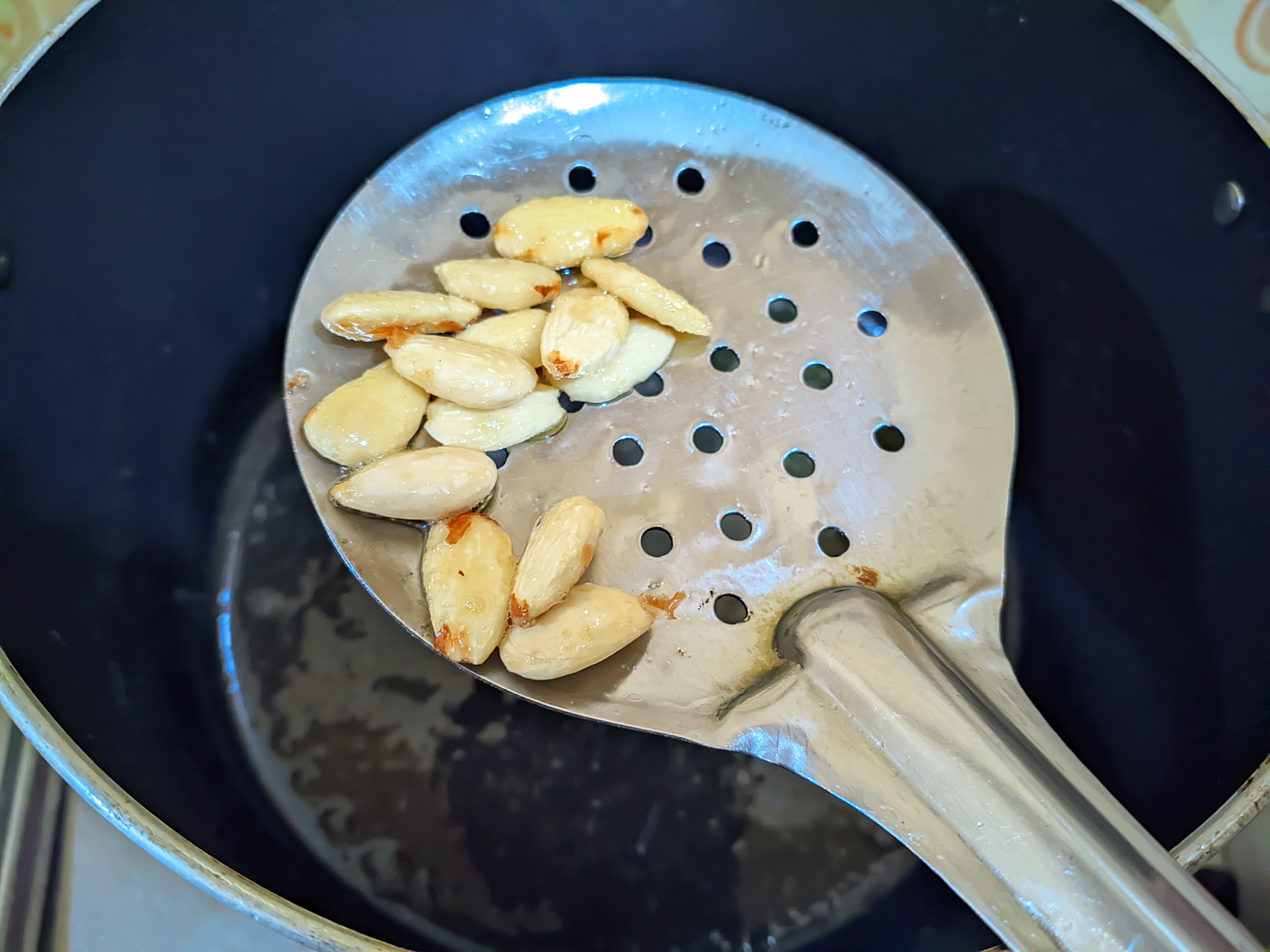 - Now I peel the walnuts in the same way and fry them in the ghee, and put them in the bowl.