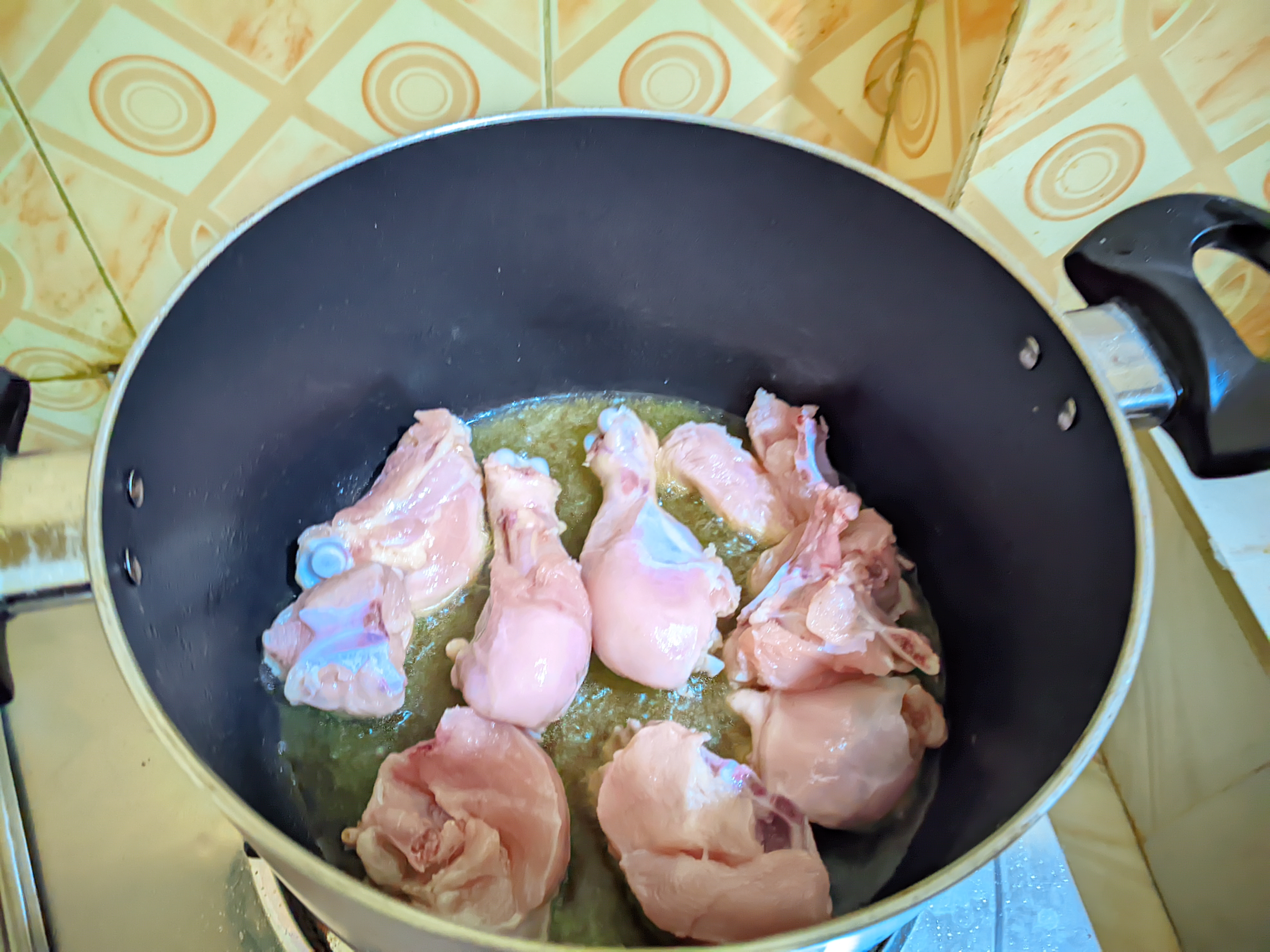 - All the ingredients are ready. Now I put the required amount of oil in the saucepan, and when the oil gets hot, I put the chicken meat in it. Fry the meat well.