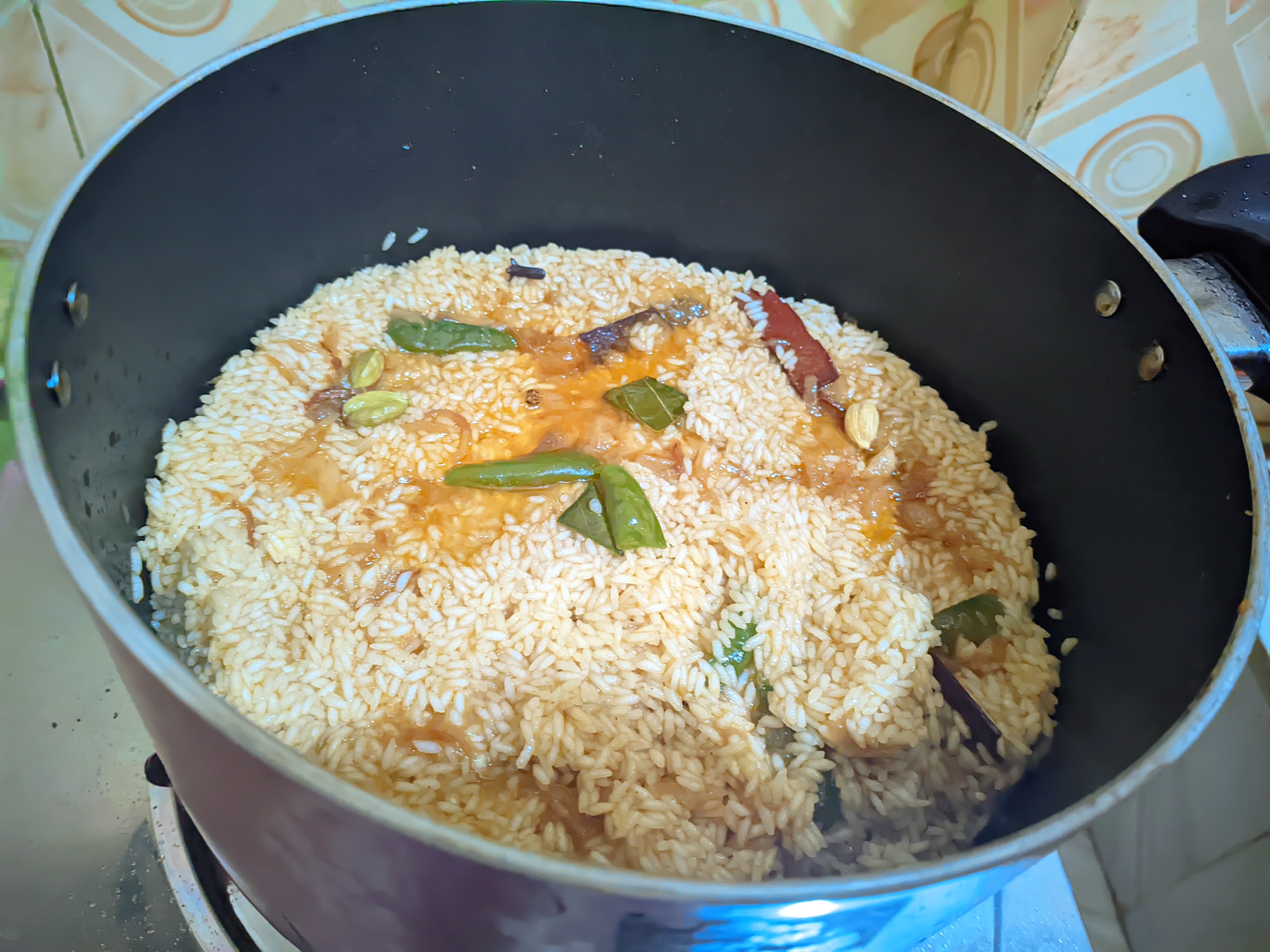 - Light spices of biryani are added, along with a mixture of cardamom, cinnamon, and cloves.