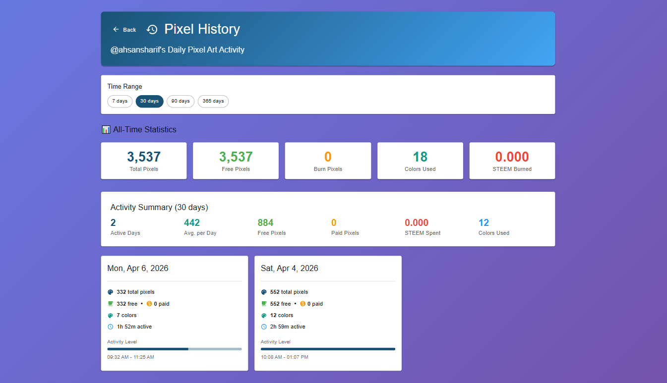 Further, I am going to show you my 30 days of activities, which we can see in the history of this game. In its history, we can see the total number of how many pixels we have drawn, how many free pixels we have drawn, how many burned pixels we have drawn, and how many colors we have used. So you can see my activities for the last two days, and in these two days of activities, I have used a total of 884 pixels and used 12 colors. Using all these things, I have created a sketch of a dinosaur in two days.