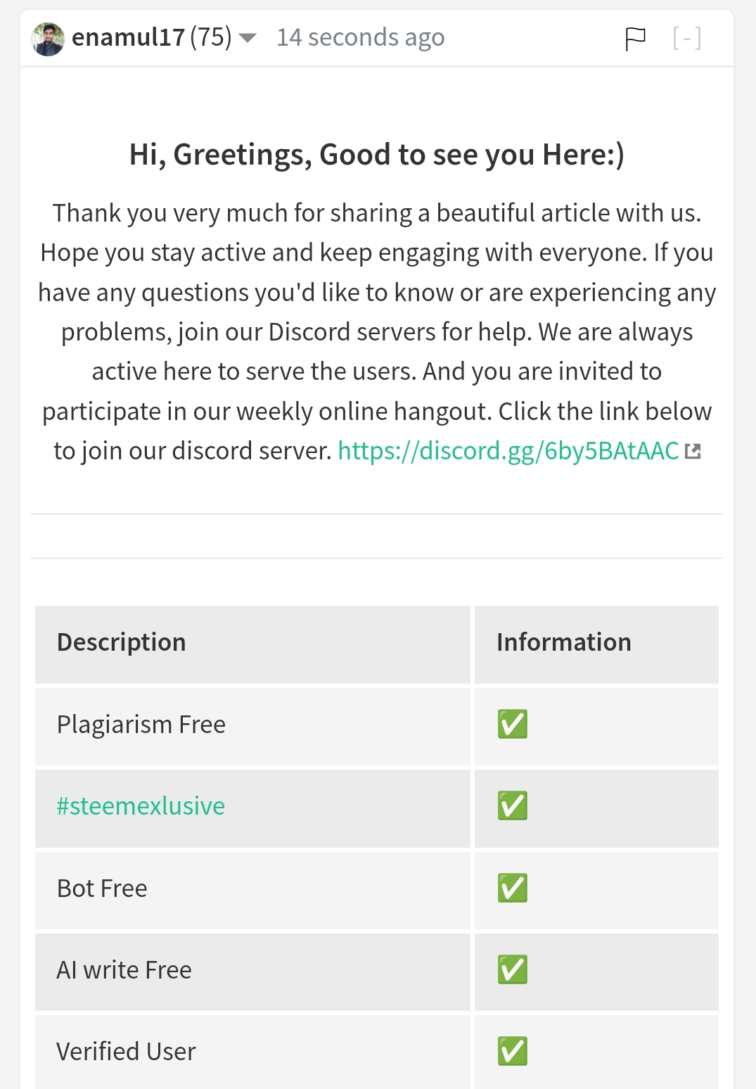 It's nice to see you here. Thank you for participating in the first week of Steemit Engagement Challenge Season 15. We encourage you to stay engaged with other participants by voting and commenting.