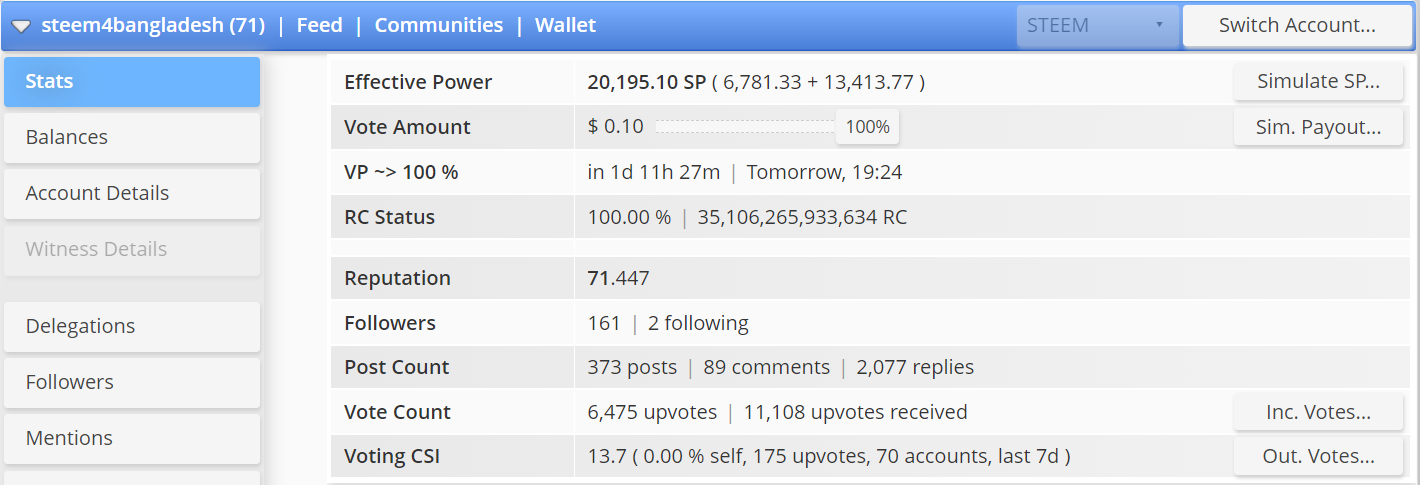 Steem For Bangladesh community curation account name is @steem4bangladesh. The current Effective Power of community curation account @steem4bangladesh is 20,195.09 SP. The reputation is 71.447 And the voting CSI is 13.7 ( 0.00 % self, 175 upvotes, 70 accounts, last 7d ).