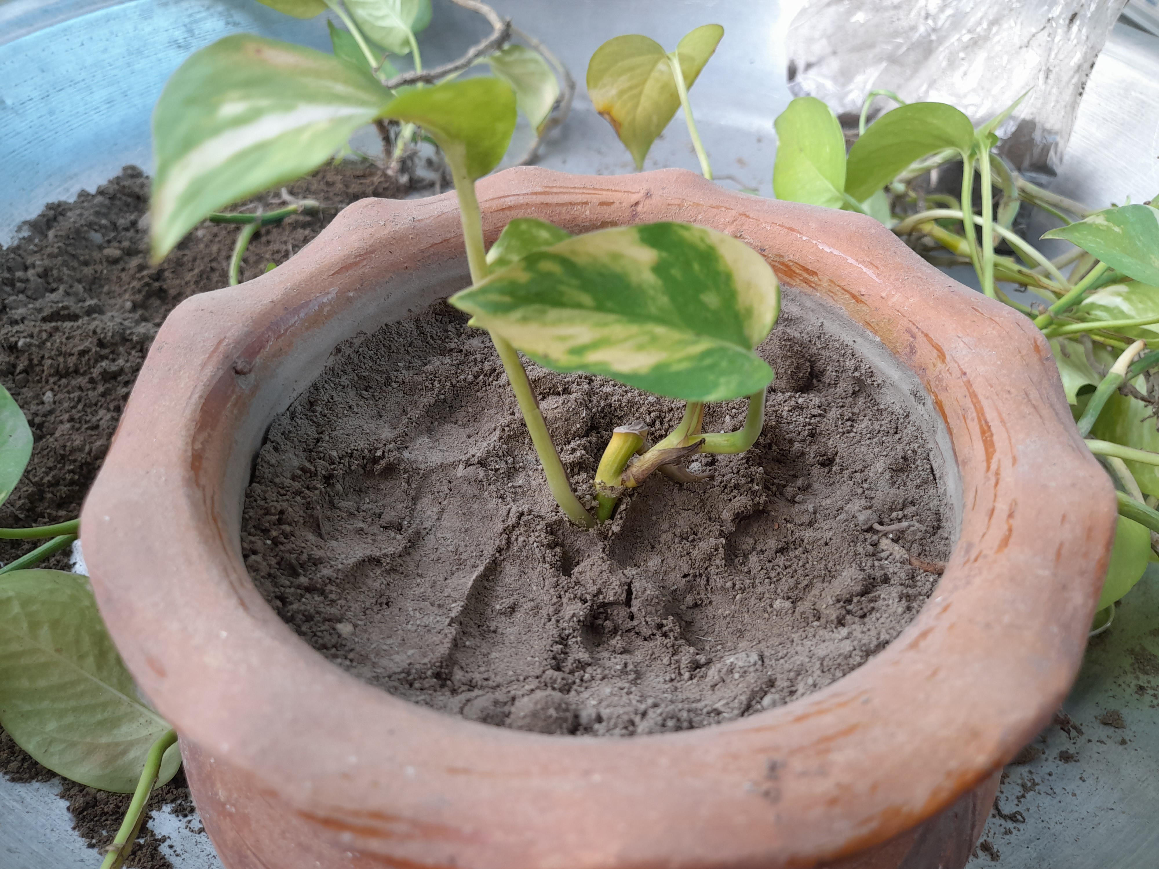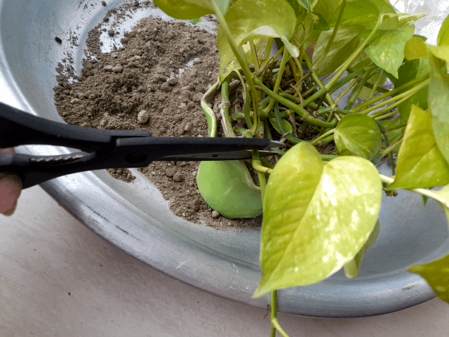 In the second step I cut off the branches of my nearly dead plants with scissors and transplanted them well into two separate pots. After planting I keep them in shade and water them sparingly.