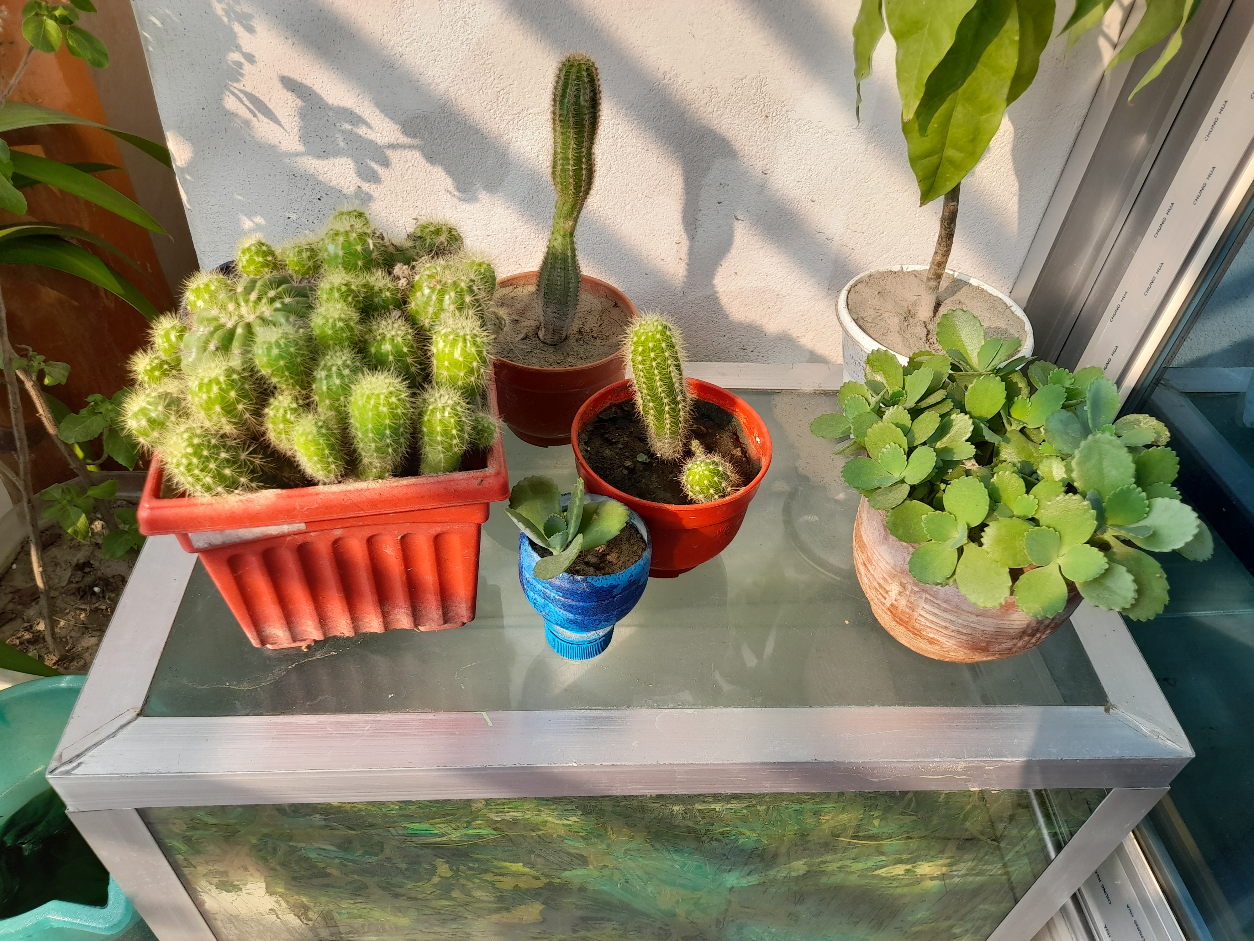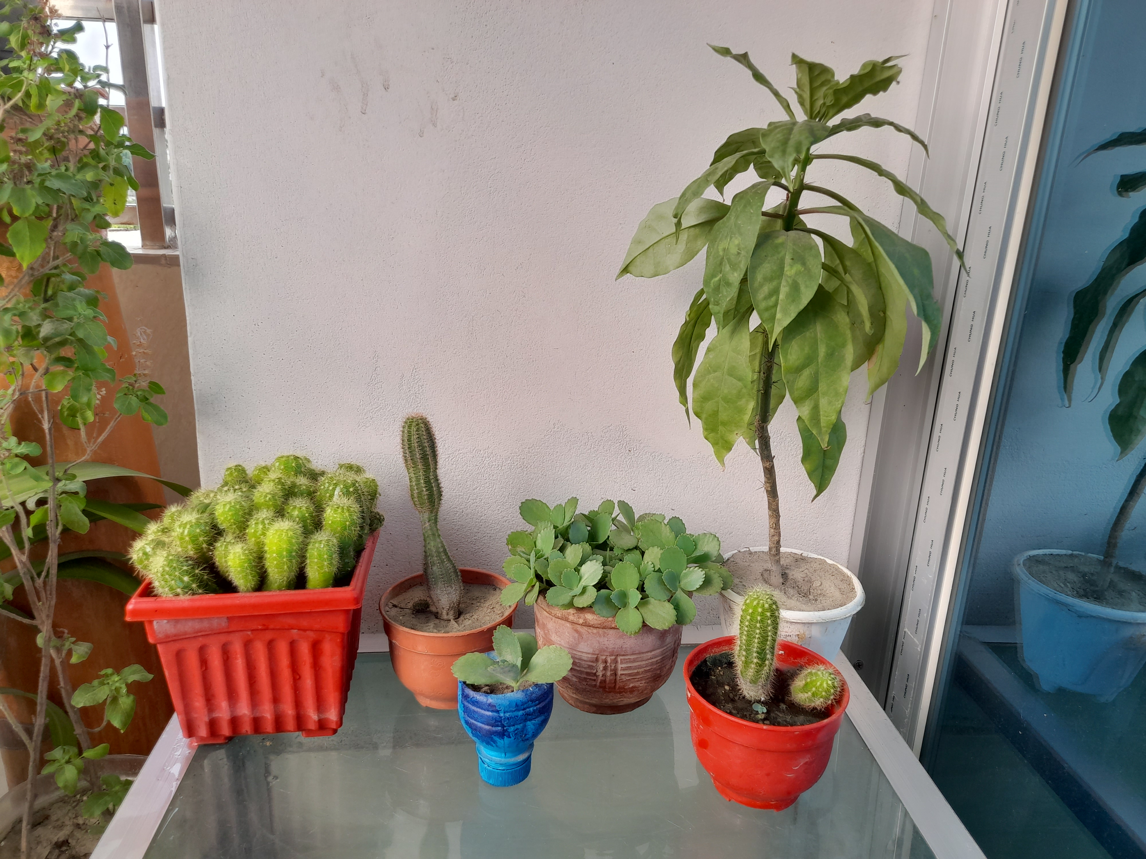 This is my balcony cactus zone. Here I put several species of cactus. There are some medium size, small size and large size cactus, besides the tall tree next to it is the rose cactus. Hope you enjoyed getting to know this special zone of my balcony.