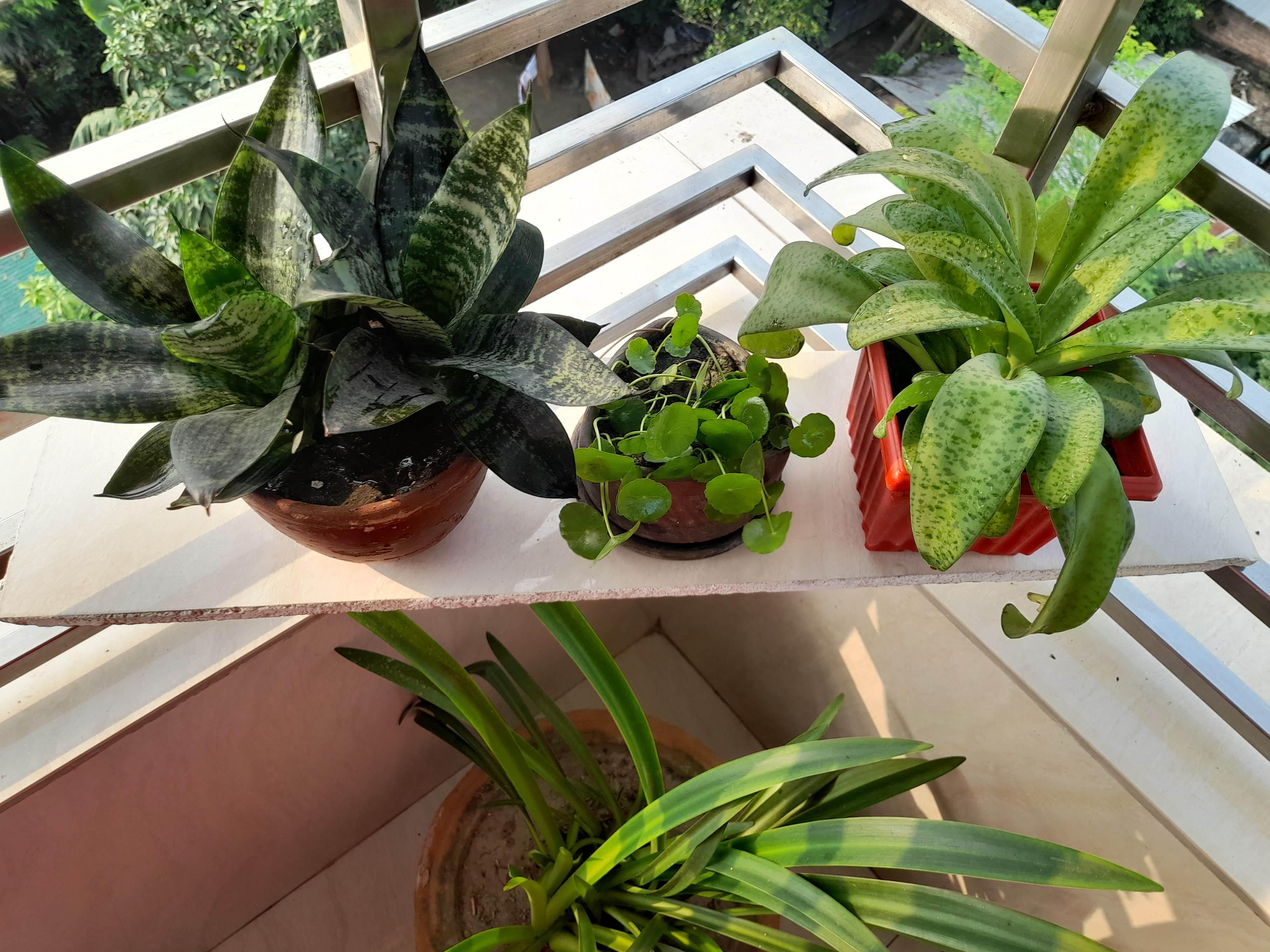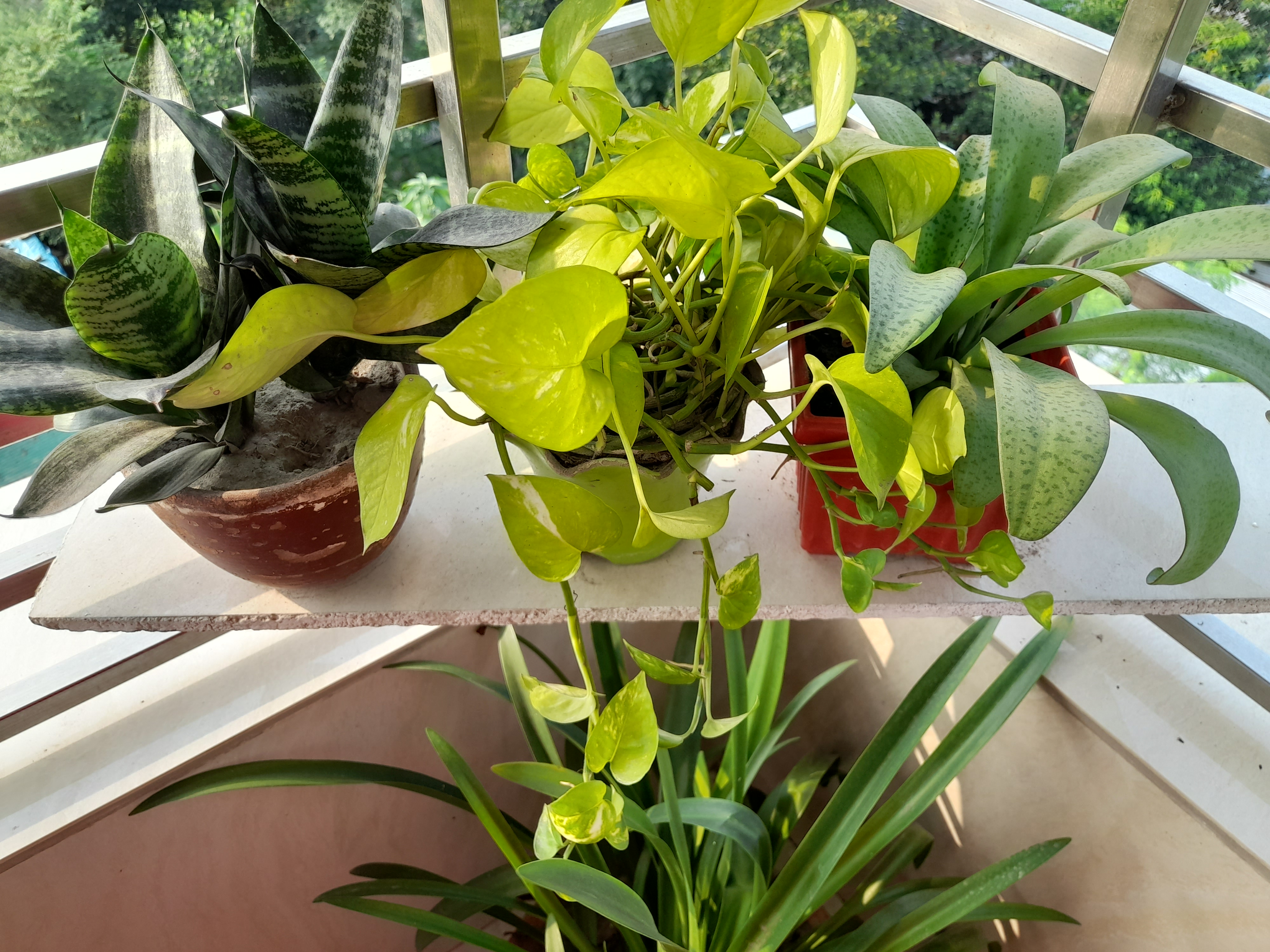 Then I clean this section of my balcony. I clean the leaves of all the plants that are in this section. A plant had some weeds and weeded out those weeds. This is a temporary section so I occasionally transfer the caption from here. The plants you can see here are lily, snake plant and money plant. Here's the plan I'll be replanting so I've replaced this plant with my favorite coinplant during the next tidy up.