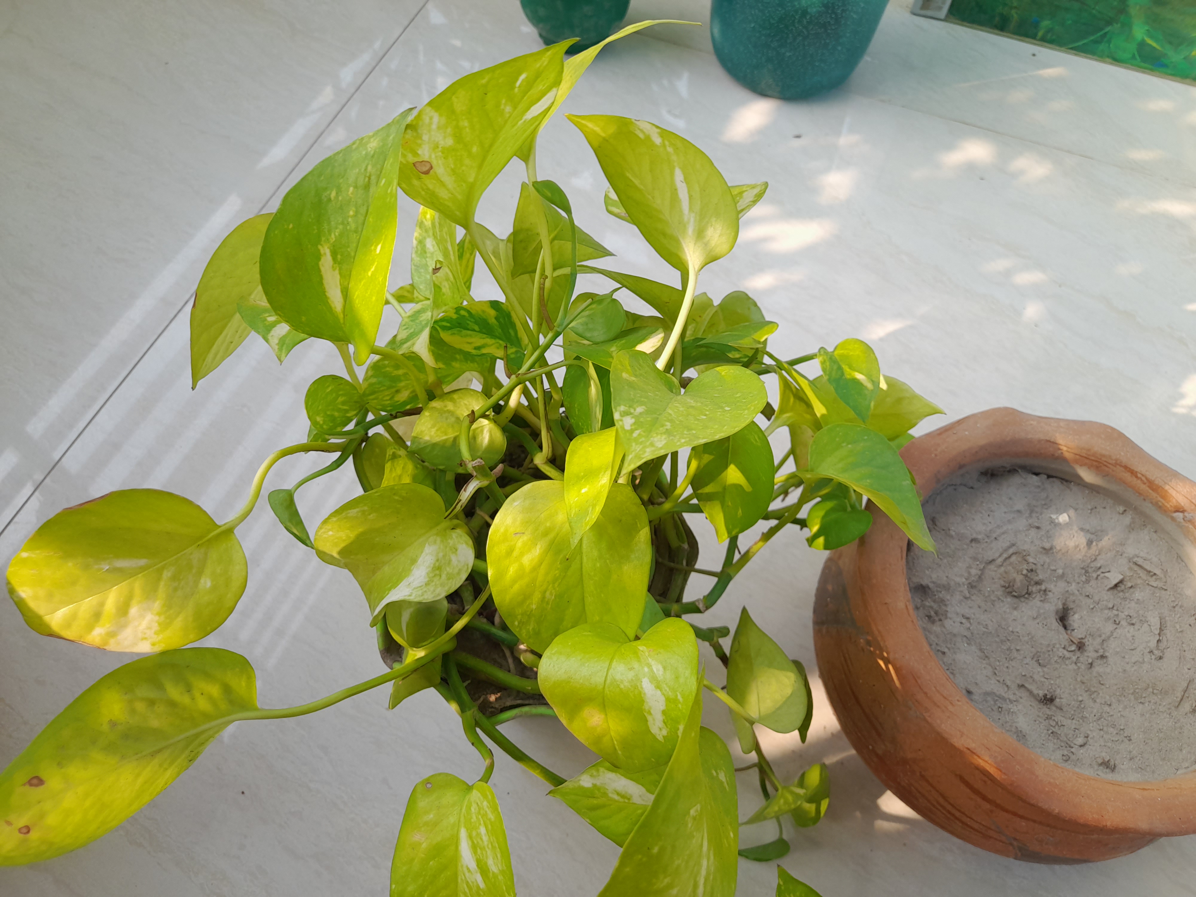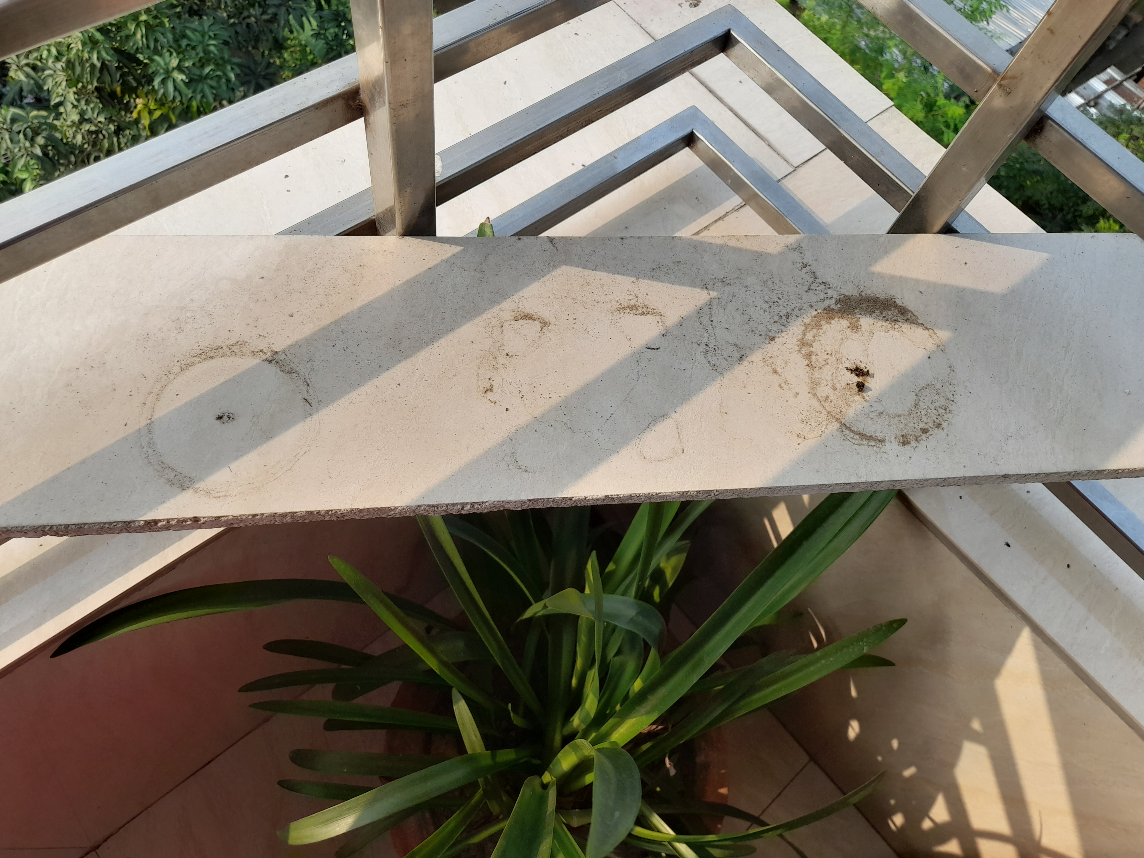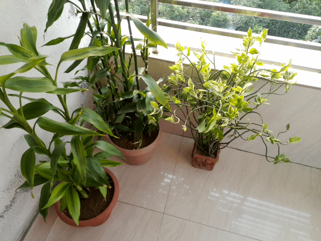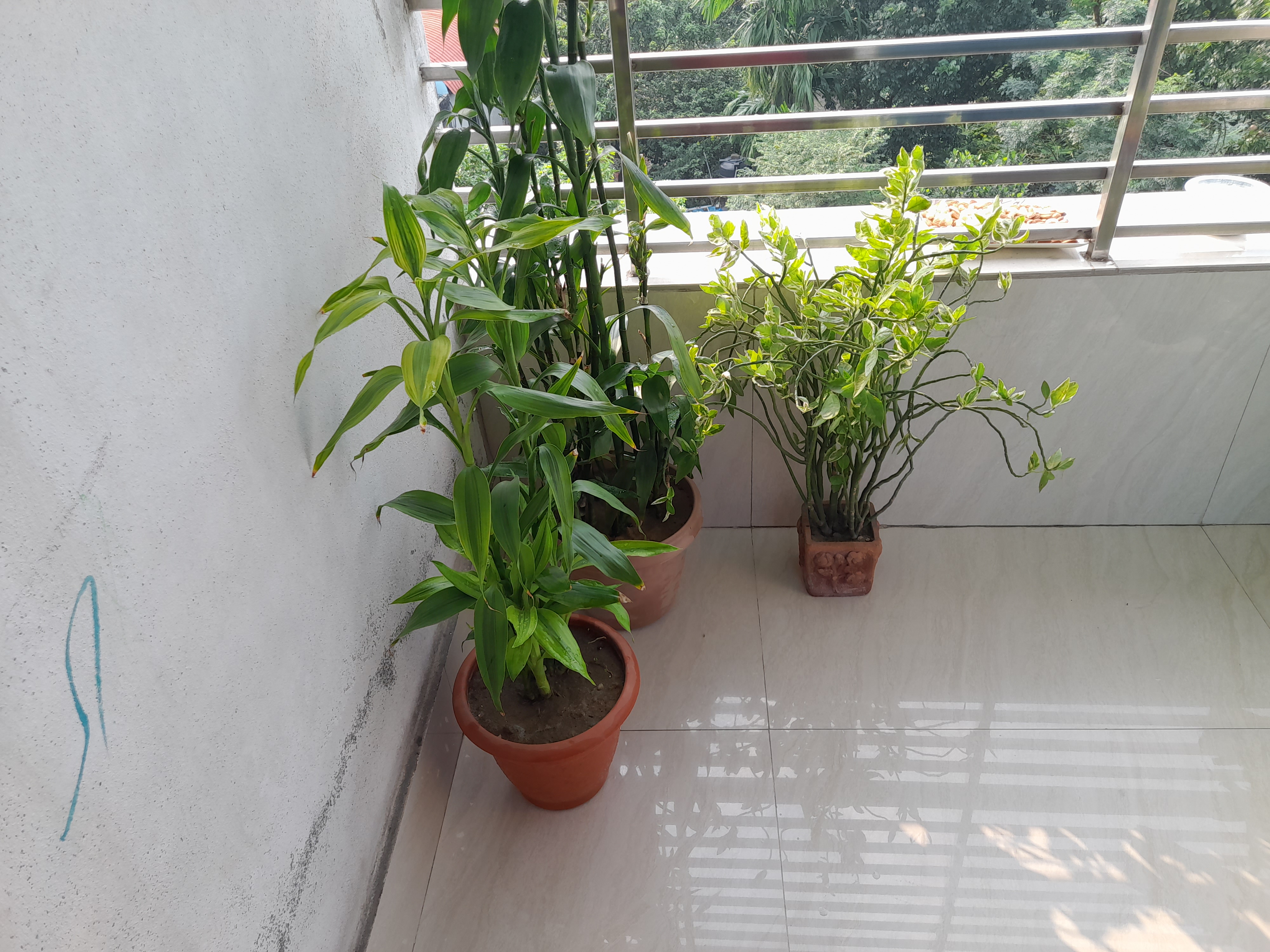 I moved my Chinese bamboos and cleared the area. I clean my balcony regularly so the dust here is relatively less. Also, due to lack of rain water on the plants, there was dust on the leaves, so I sprayed them with water. And after drying the balcony floor I put them back in place.