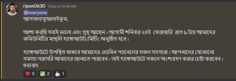 So I invite you all to attend our hangout on Saturday 24 February at precisely 9 p.m. and inform all your friends who are outside the community. Everyone should join our Discord server. We look forward to hearing all your valuable words. Thank you all.