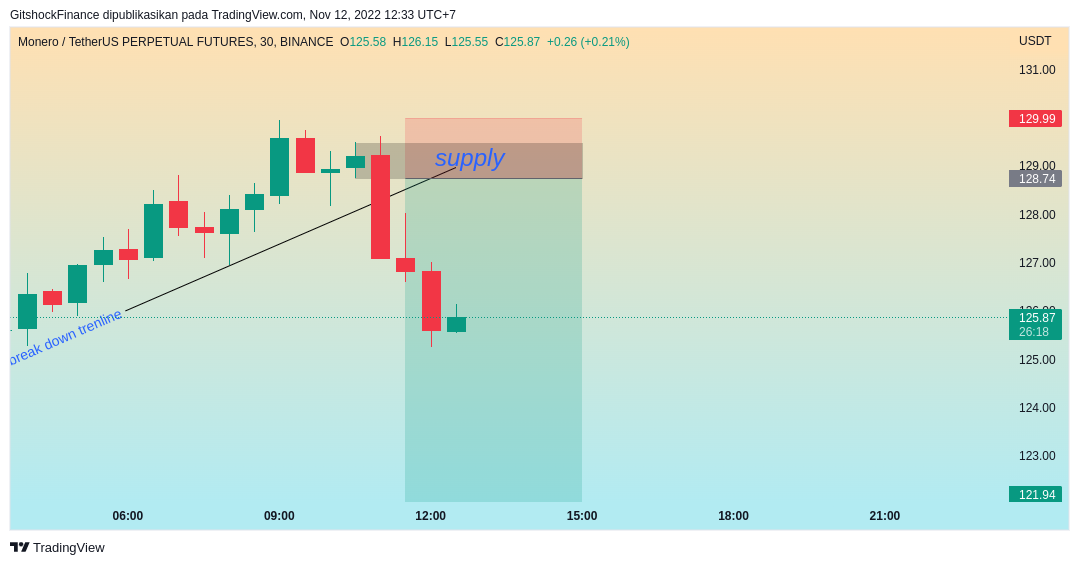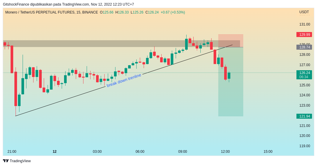 Terjadinya breakdown trend yang sebelumnya uptrend korektif pada area resisten menandakan bahwa harga dari XMR akan terus mengalami penurunan. Dan pada momen ini kita mencari posisi yang tepat untuk melakukan short selling atau posisi penjualan pada future market.