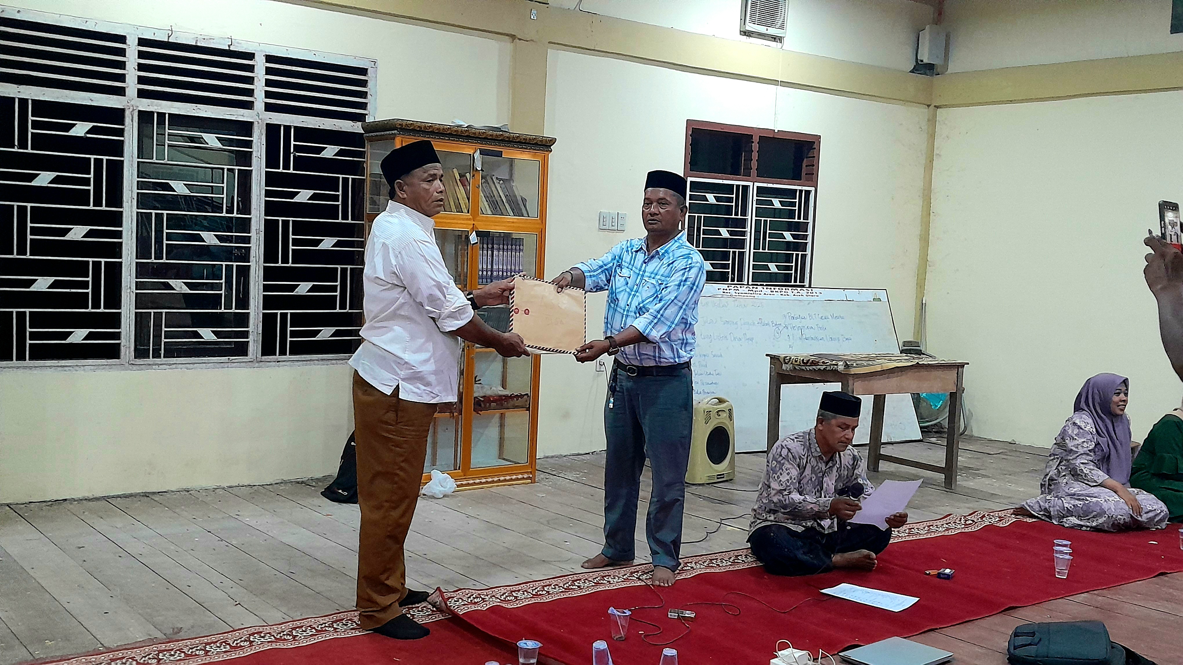 Seperti kursi pering sendok dan barang barang yang lain nya, kemudian acara penyerahan tersebut di saksikan oleh tuha puet dan masyarakat setempat, yang di serahkan beberapa aset nya seperti tanah sawah karena tanah sawah yang di beli dengan anggaran gampoeng ada yang luar gampoeng setempat, dan ada juga yang di dalam gampoeng setempat.