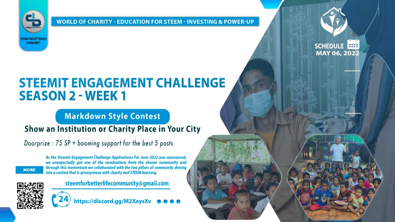 We've revamped it with a selection of general charities to review under the title Steemit Engagement Challenge Season2 #week1 | Markdown Style Contest : Show an Institution or Charity Place in Your City and steemian can choose according to the conditions of their respective countries such as a free education center, a free medical center, a free training center, a nursing home, an orphanage, a humanitarian service center, a child counseling center, a women's counseling center, community economic empowerment, or other Charity Place. If there are other inputs or suggestions to make this contest run smoothly, we are also very grateful to you for submitting your input to this contest.