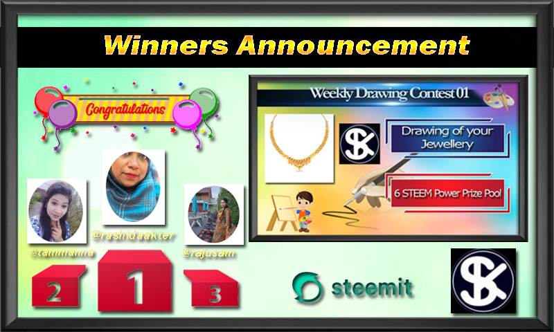 Competition "Drawing Of your Jewellery" The contest is over and now it's time to announce the winners. We have received 04 post so far. If you have shared this Steem For Ladies quality article very creatively and skillfully as we stated in the contest post, we will appreciate you justly. So, the highest scoring author gets 🔹3 STEEMS🔹 as steam power, and the 2nd and 3rd authors get 🔹2, 1 STEEMS.🔹