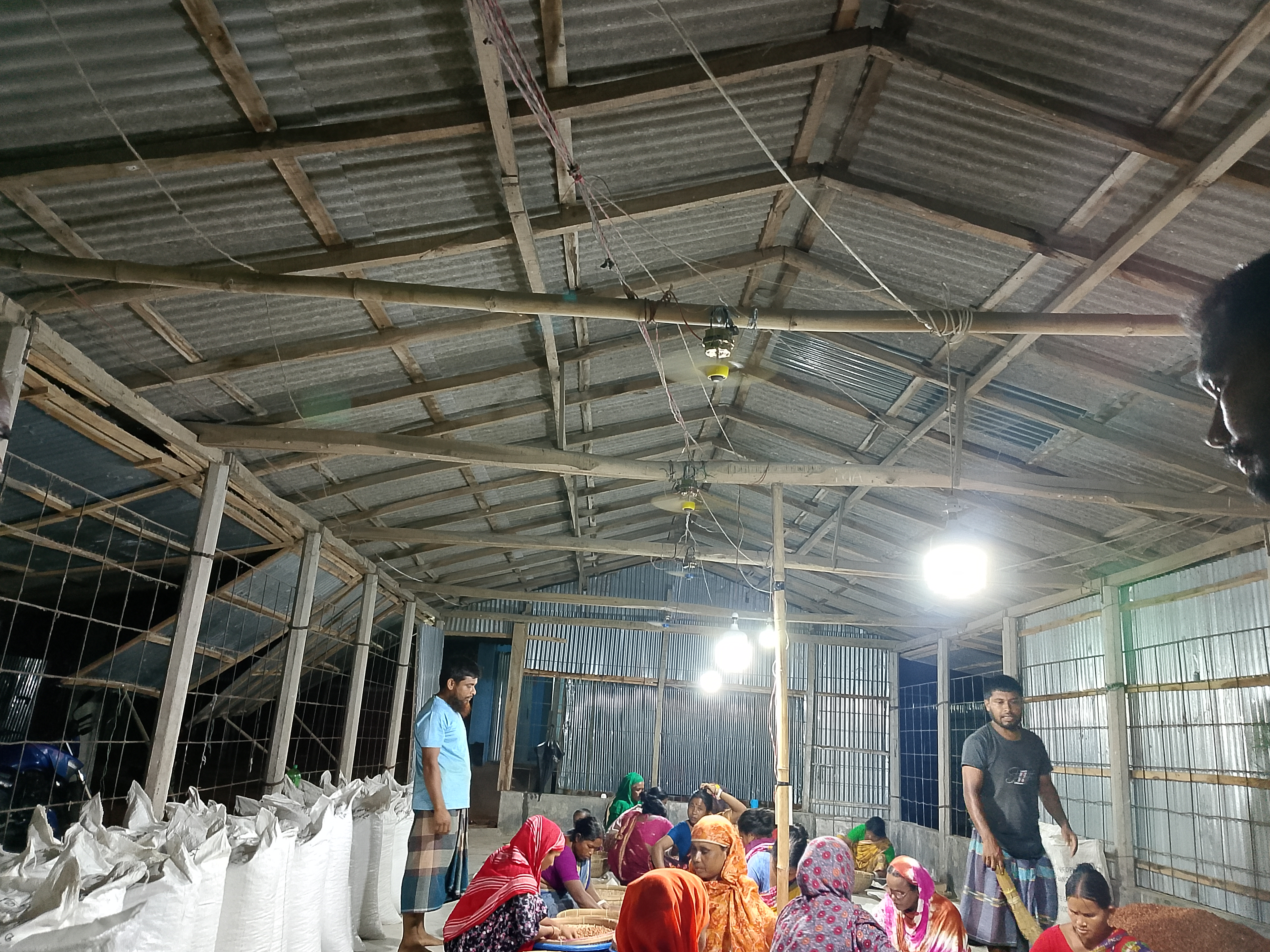 Today the nut car will load from the nut factory. That is why work is still underway till night. And everyone was working fast. Female people are picking nuts. And the rest of the plastic white sacks are giving these nuts. And they are being weighted in a sack by 5 kg. Sewing with sewing machine. All sacks are ready. The car will have to load the car with the load. And during the night, the car will be set up for TK Pabna. Then our work will be done here. Then I'll leave here.