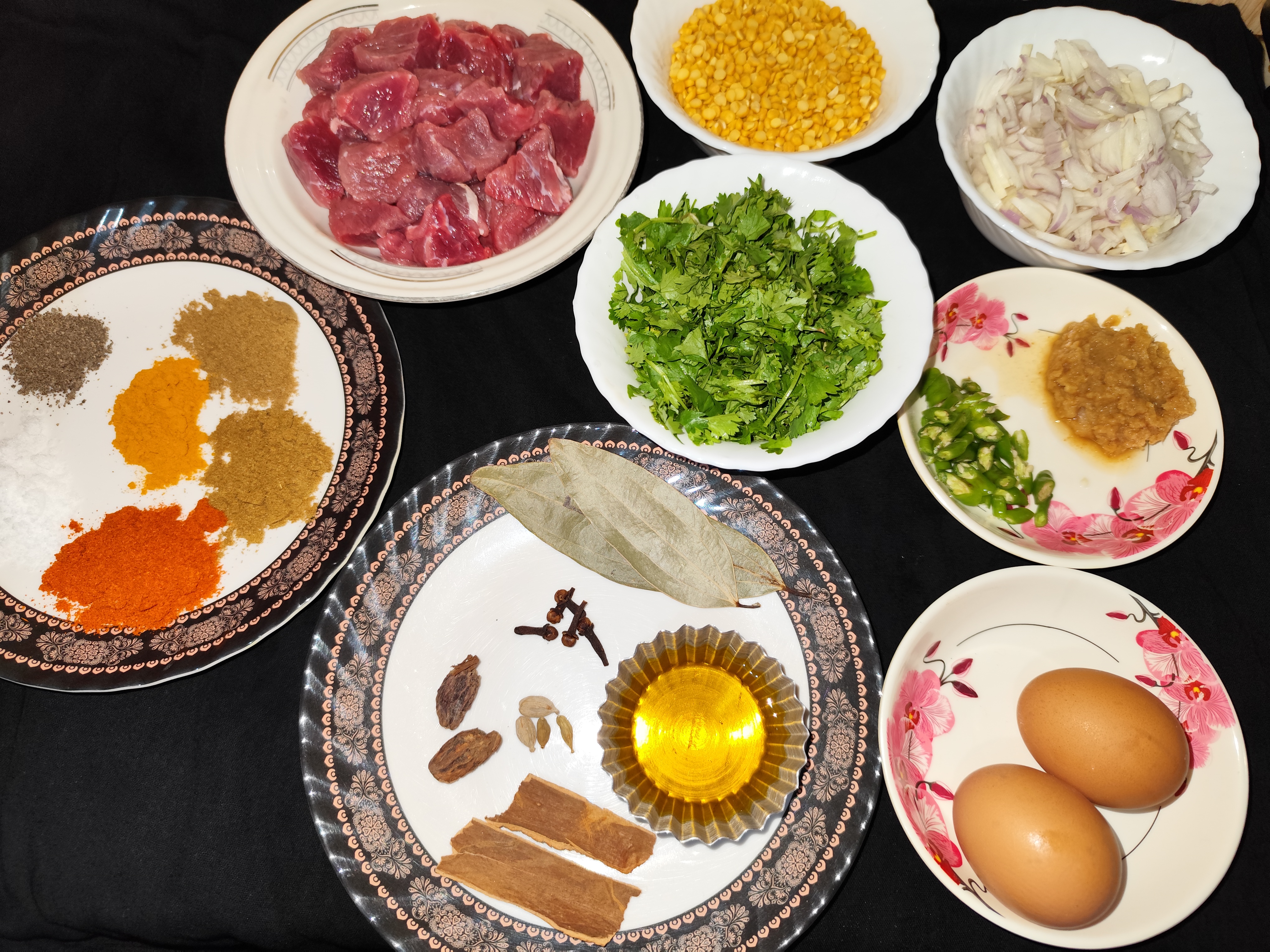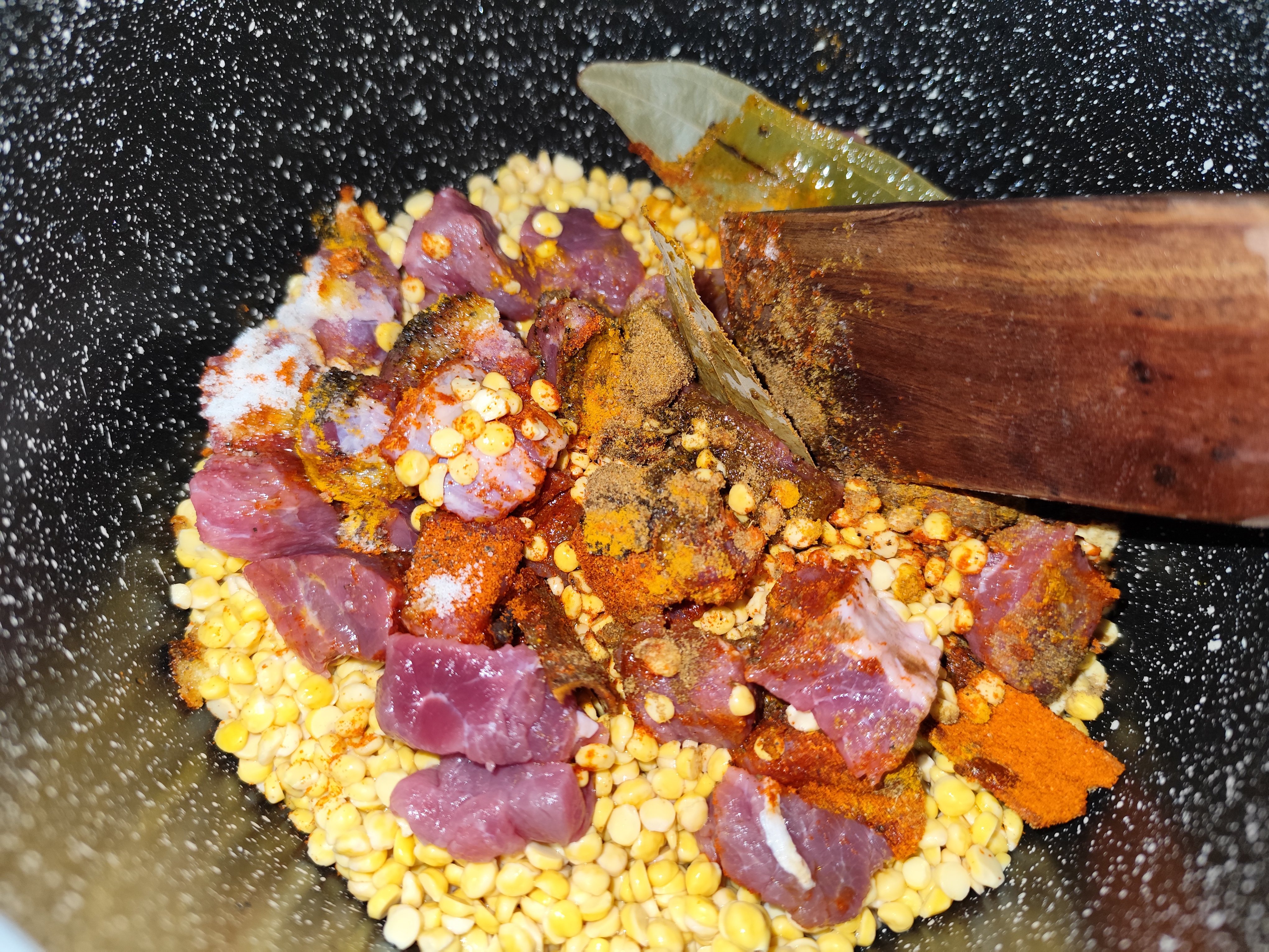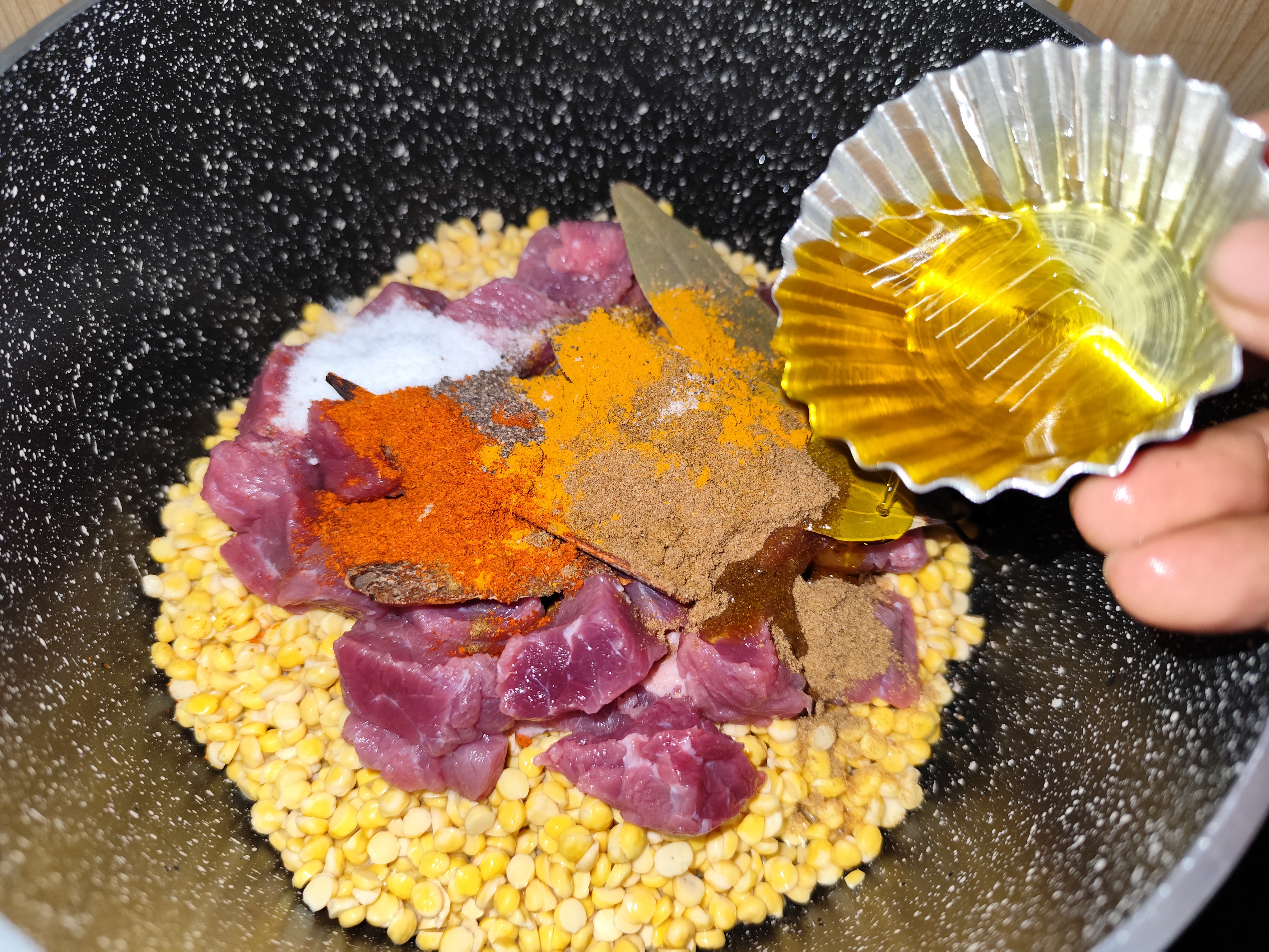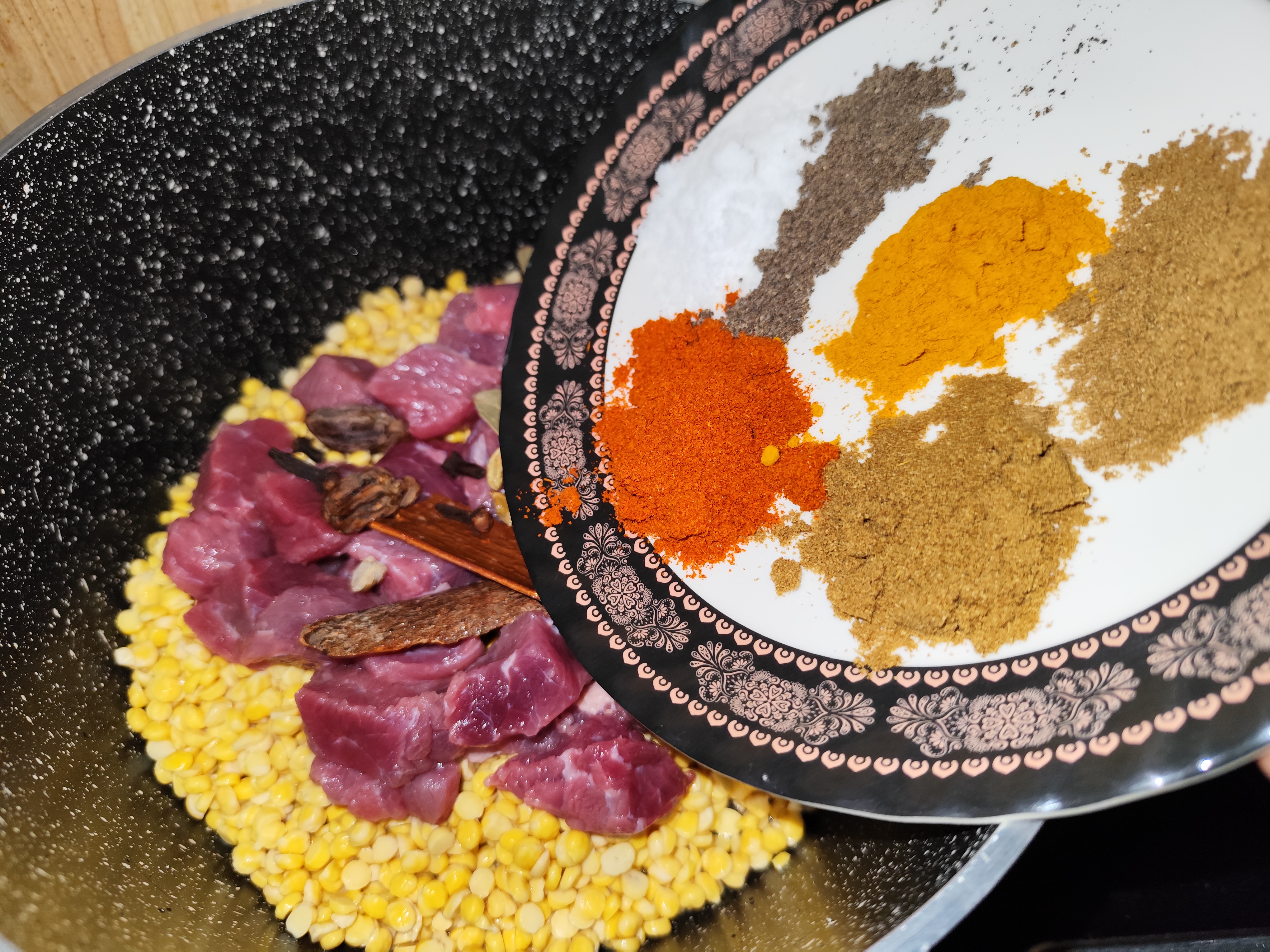 When the daal is well soaked and soft, I drain it from the water and put it in a bowl. I added 400 grams of boneless and fat-free beef to the dal, which I cut into small pieces for quick cooking. Now I added 1 teaspoon of ginger paste, 1 teaspoon of garlic paste, 1 tablespoon of chili powder, 1 teaspoon of turmeric powder, 1 teaspoon of coriander powder, 1 teaspoon of cumin powder, 2 pieces of cinnamon, 4 white cardamoms, 2 black cardamoms, 1/4 teaspoon of black chili powder, 2 bay leaves, 4 cloves, 1 teaspoon of salt, Half a cup of chopped onion and 2 tablespoons of mustard oil.