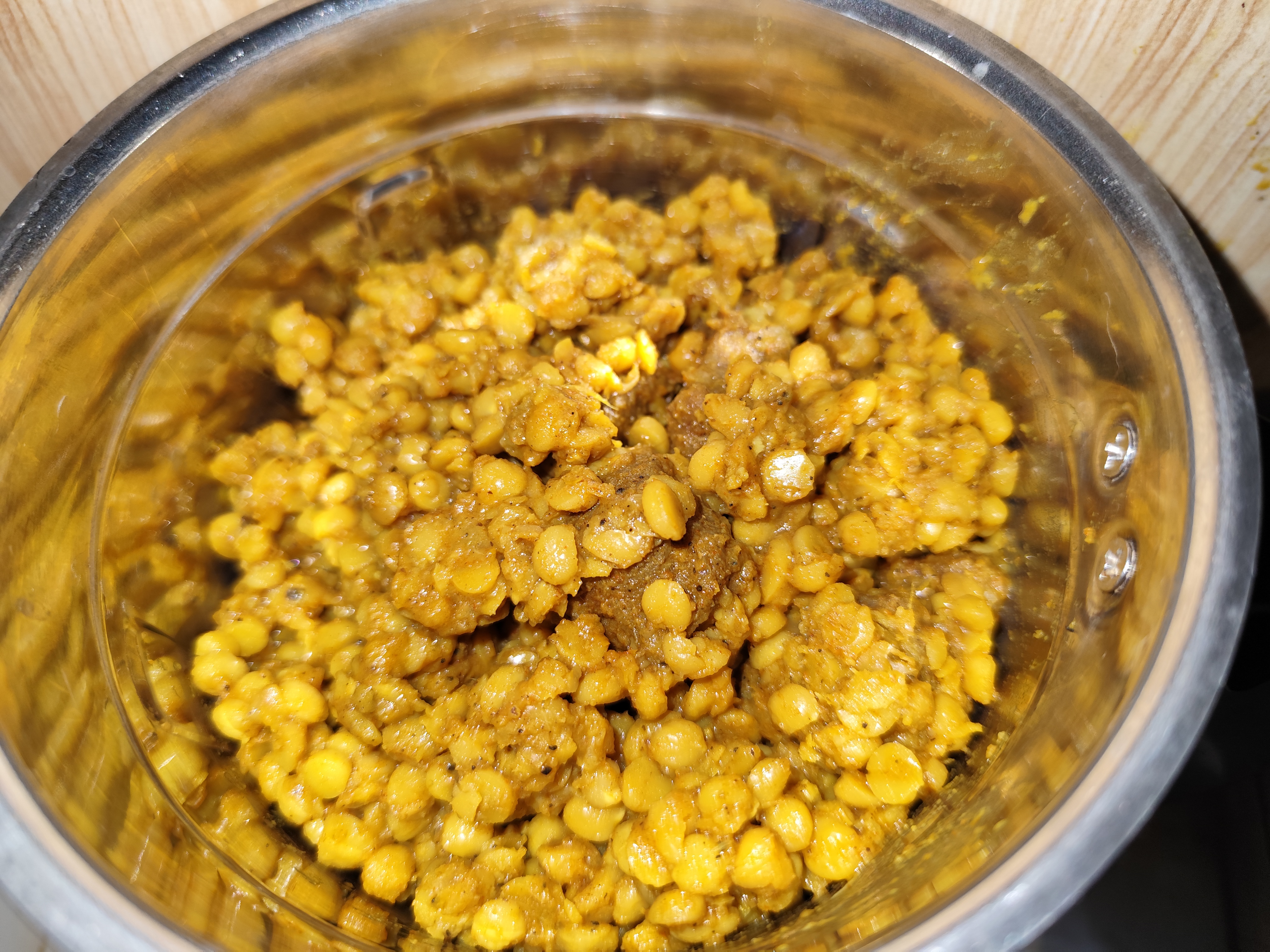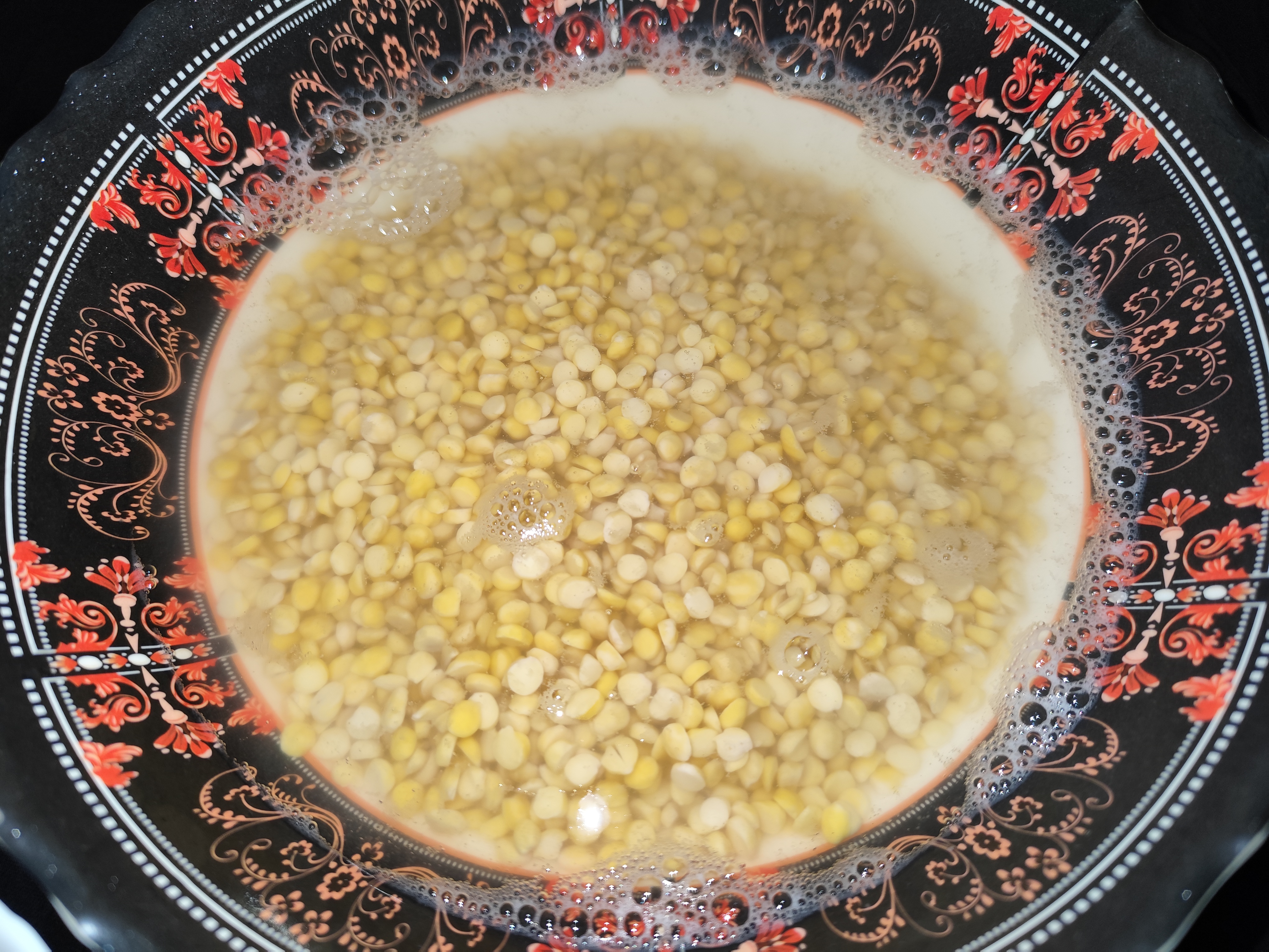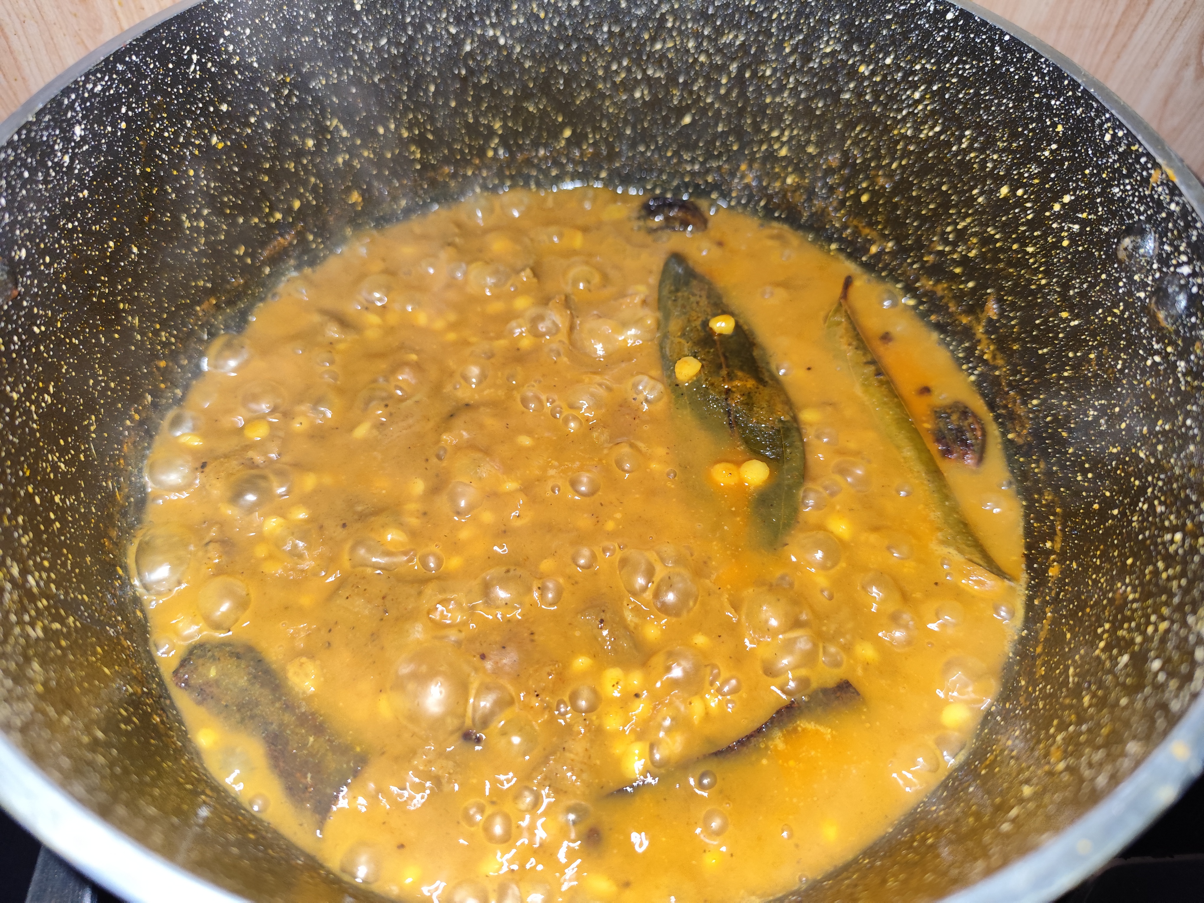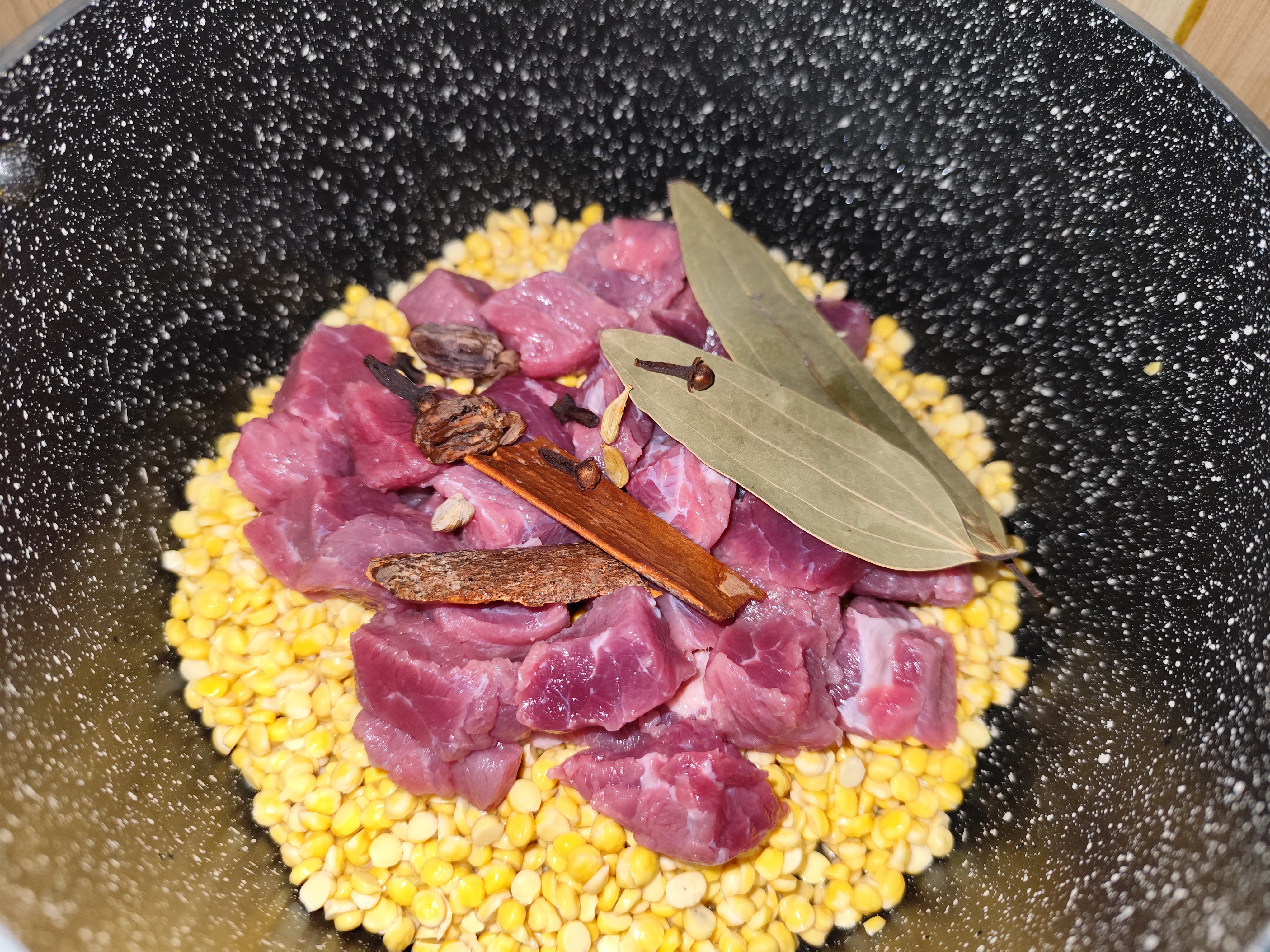 When the daal is well soaked and soft, I drain it from the water and put it in a bowl. I added 400 grams of boneless and fat-free beef to the dal, which I cut into small pieces for quick cooking. Now I added 1 teaspoon of ginger paste, 1 teaspoon of garlic paste, 1 tablespoon of chili powder, 1 teaspoon of turmeric powder, 1 teaspoon of coriander powder, 1 teaspoon of cumin powder, 2 pieces of cinnamon, 4 white cardamoms, 2 black cardamoms, 1/4 teaspoon of black chili powder, 2 bay leaves, 4 cloves, 1 teaspoon of salt, Half a cup of chopped onion and 2 tablespoons of mustard oil.