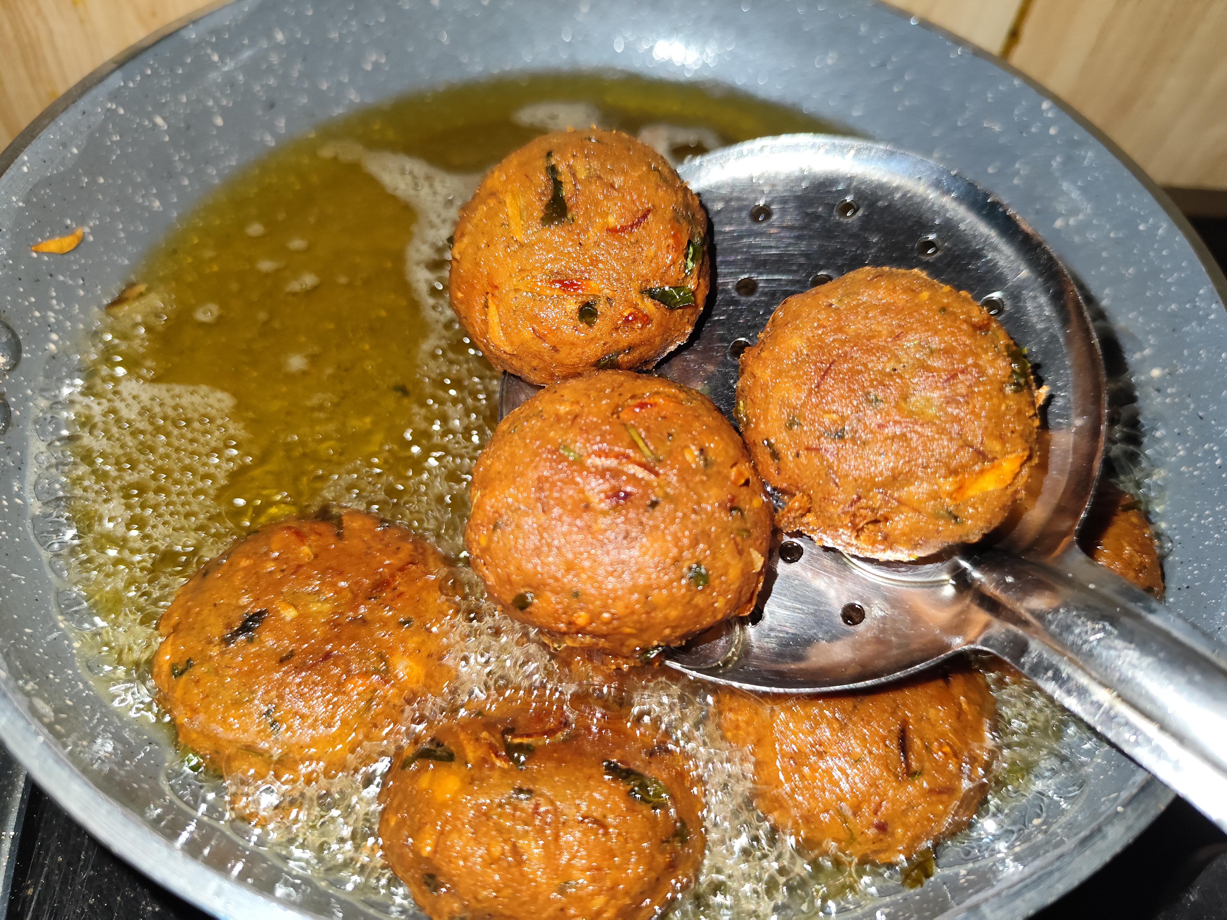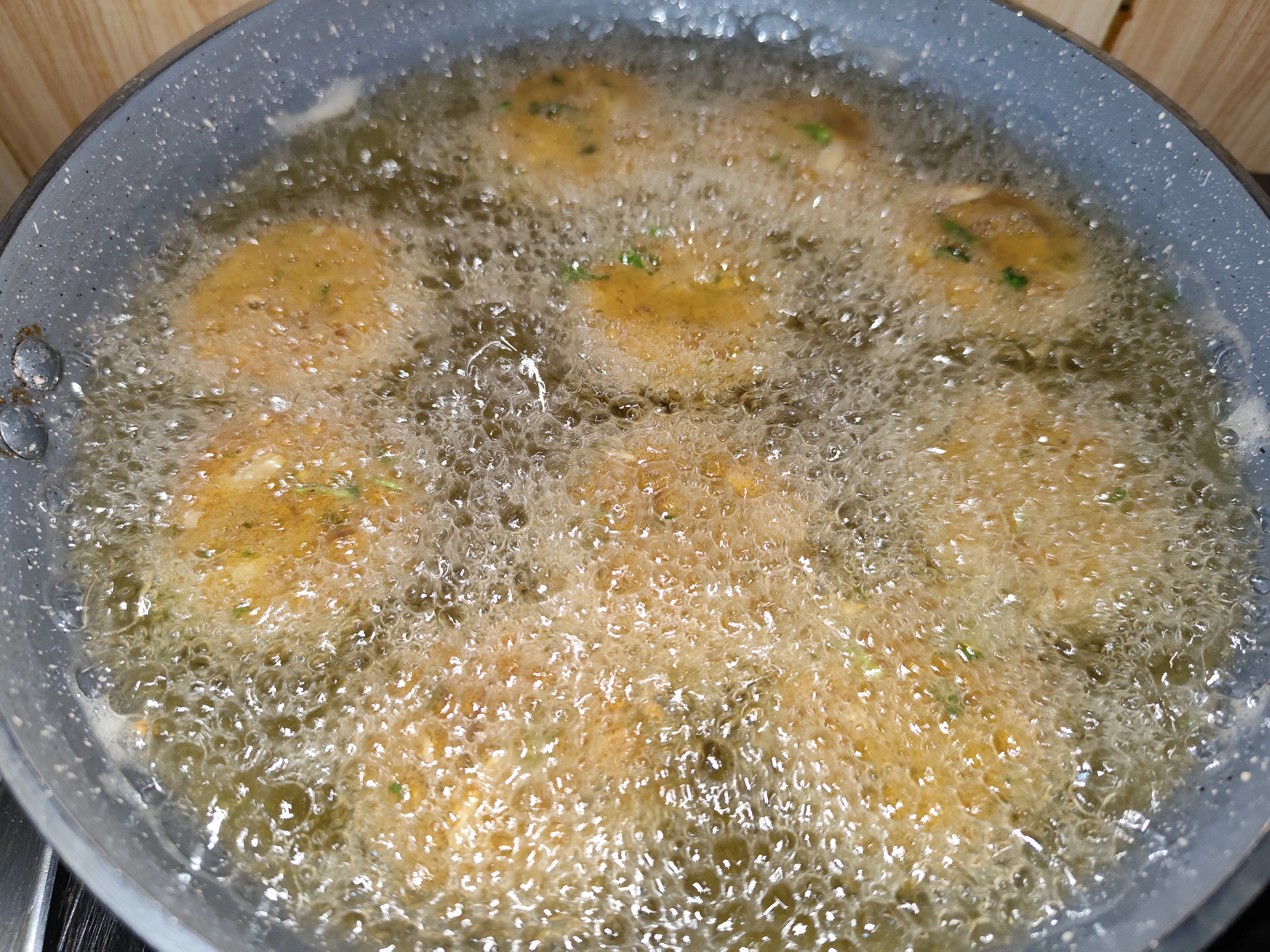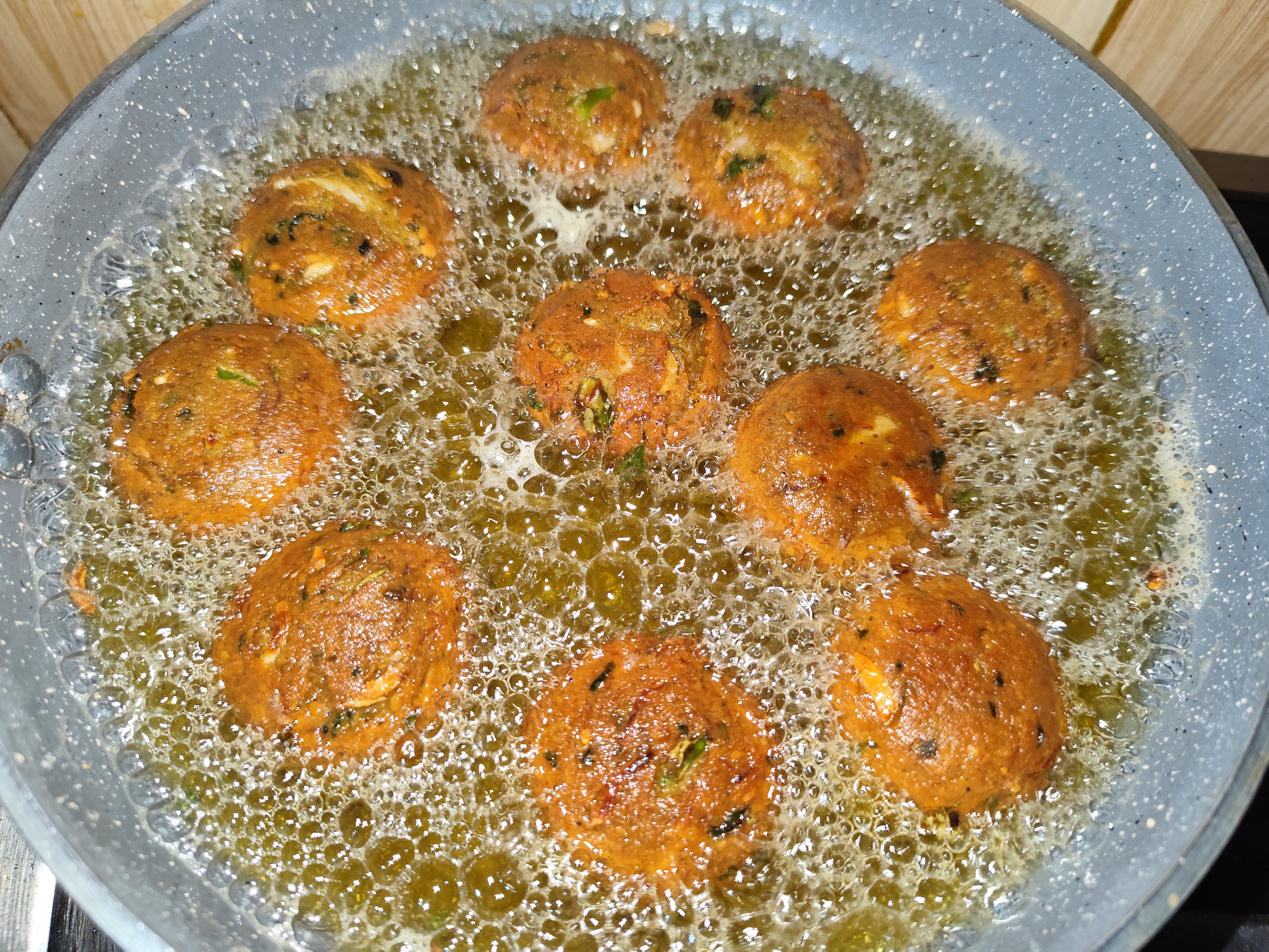 To fry the kebabs, I heated oil in a pan on the stove. The kebabs must be fried in deep oil. The oil should be heated well by keeping the stove on high heat. At this stage, the kebabs should be left in the oil. When both sides turn slightly red, the kebabs can be moved from side to side. At this stage, the stove should be kept on low heat and fried. When they turn brown, drain the oil and take out the kebabs.