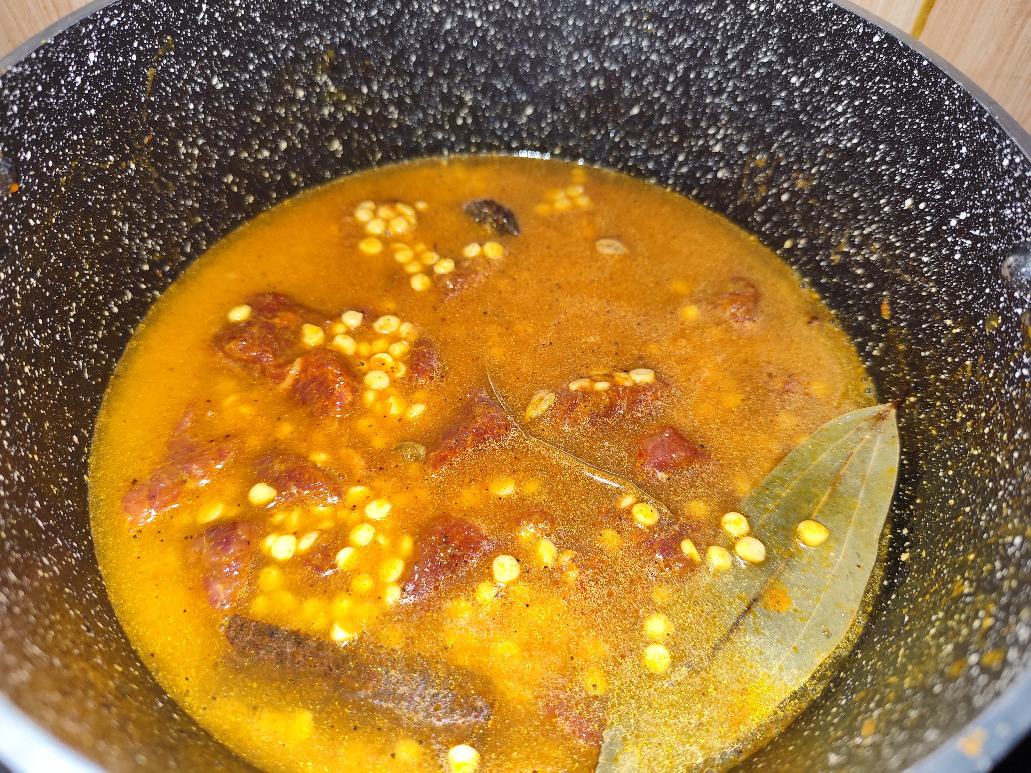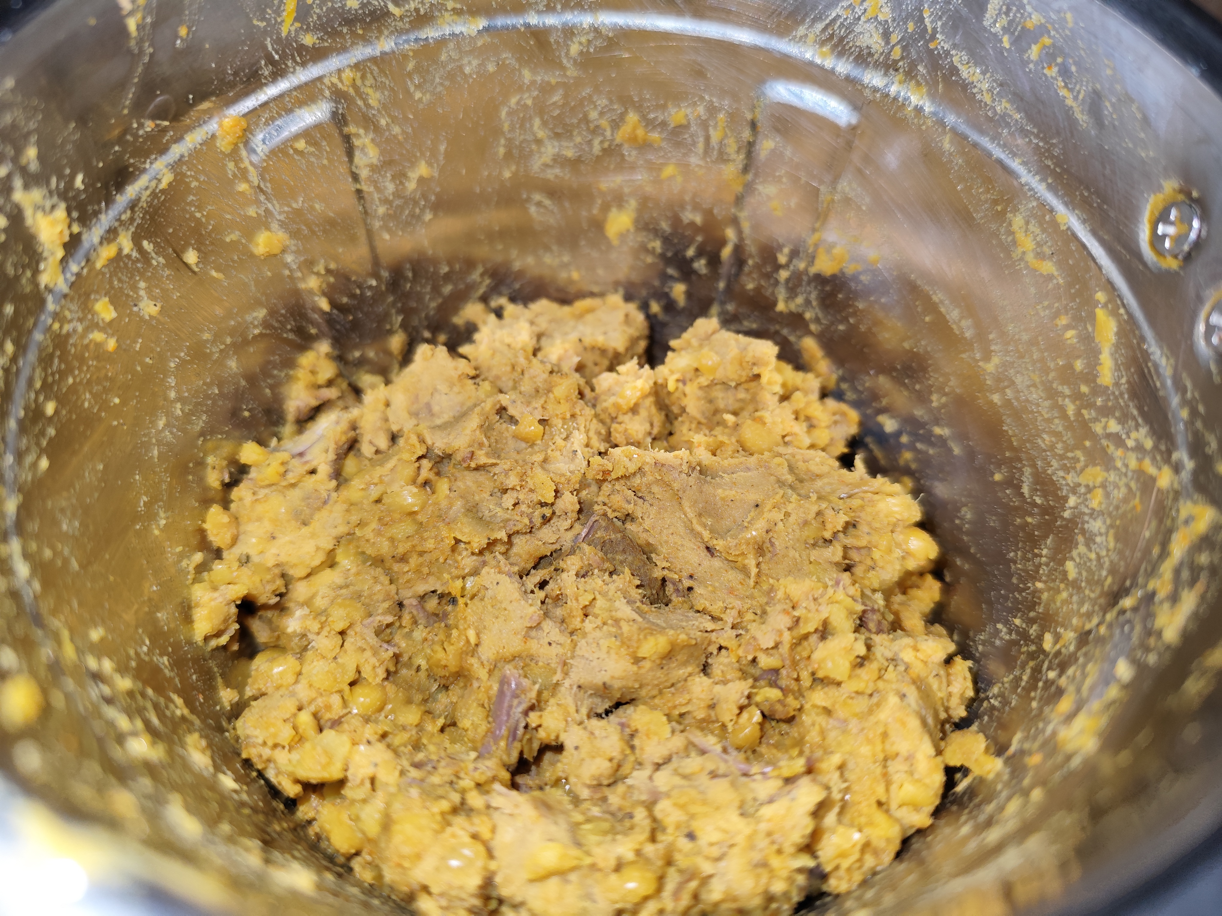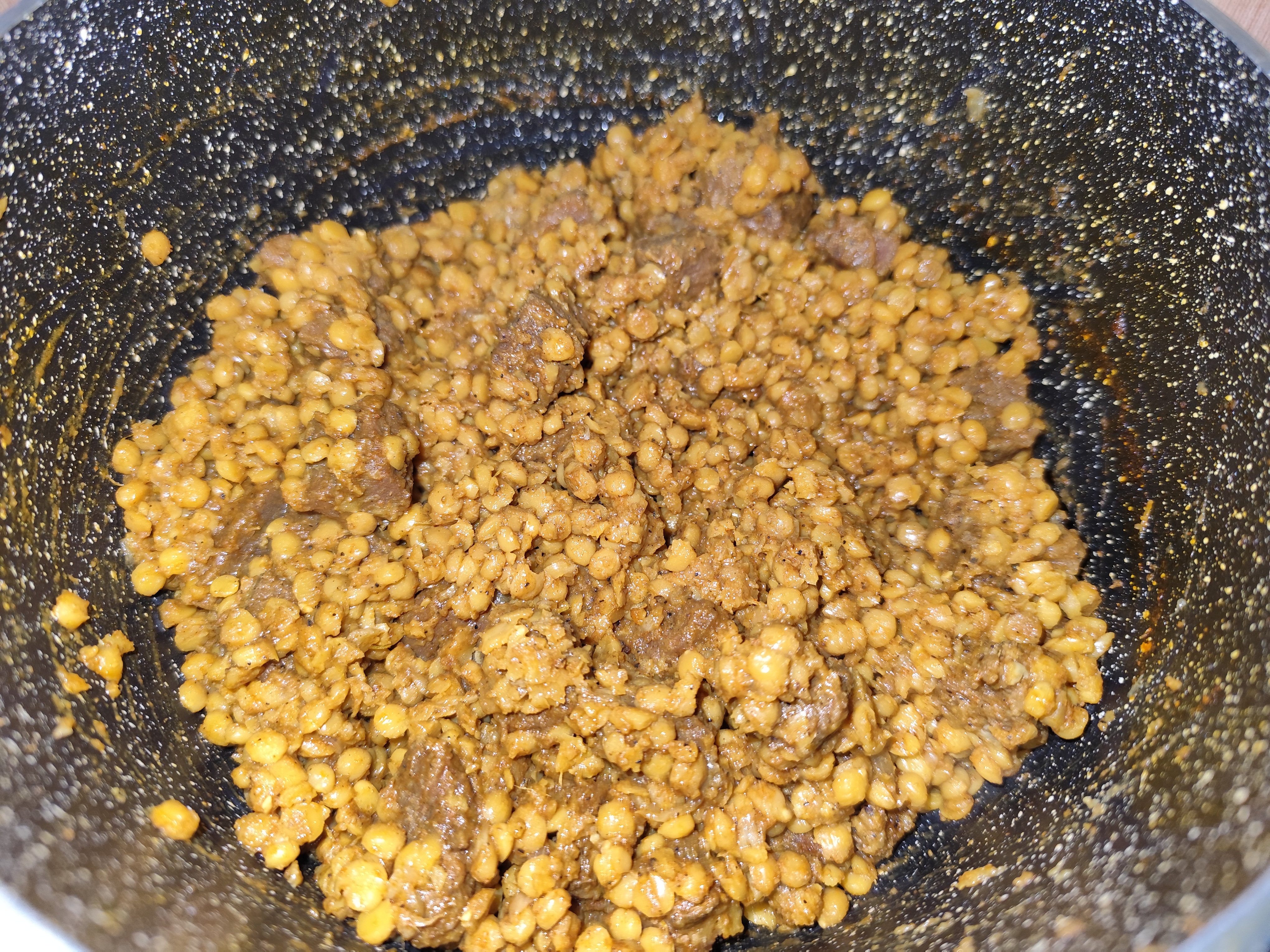 After adding all the ingredients, I mixed it very well with the lentils and beef. Then I added 2 cups of water and put the pot on the stove. I cooked the meat and lentils on medium heat for about 1 hour. After the meat and lentil mixture was cooked, I left it to cool.