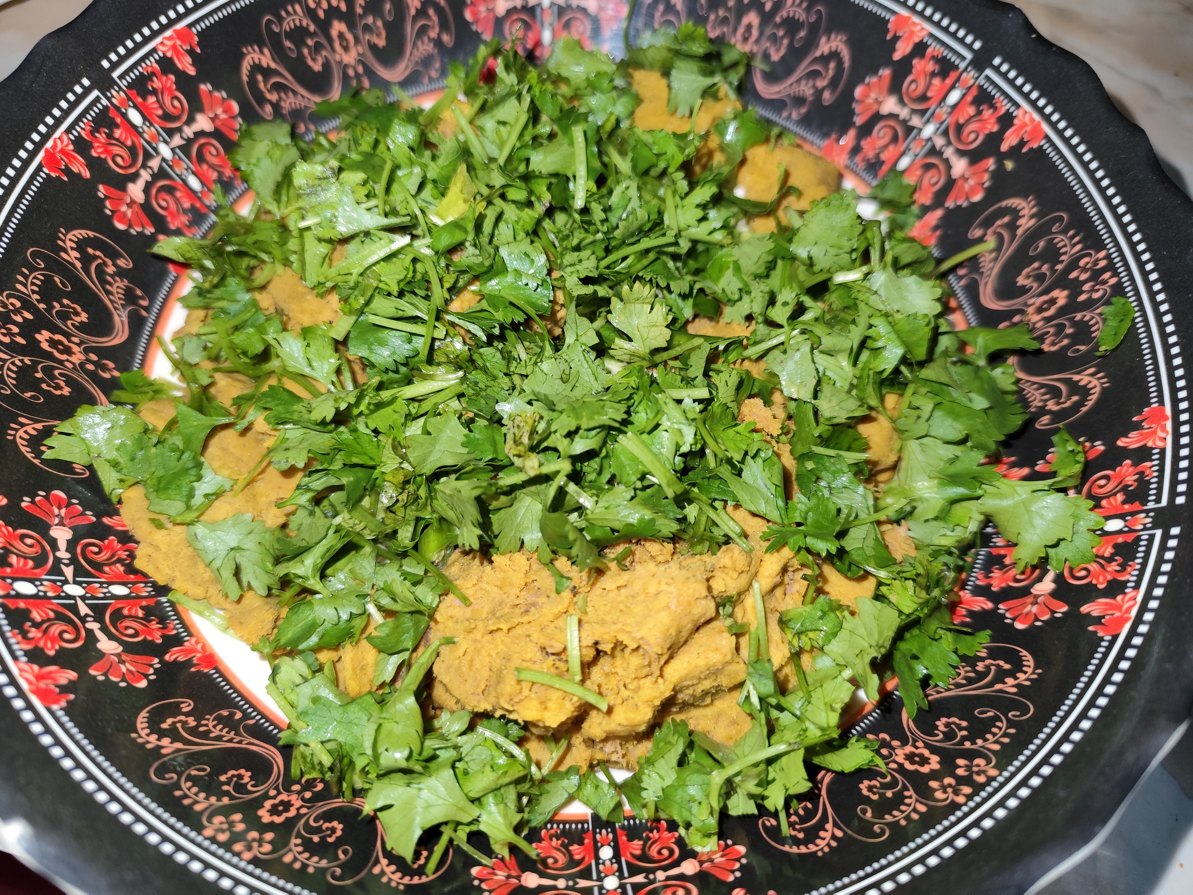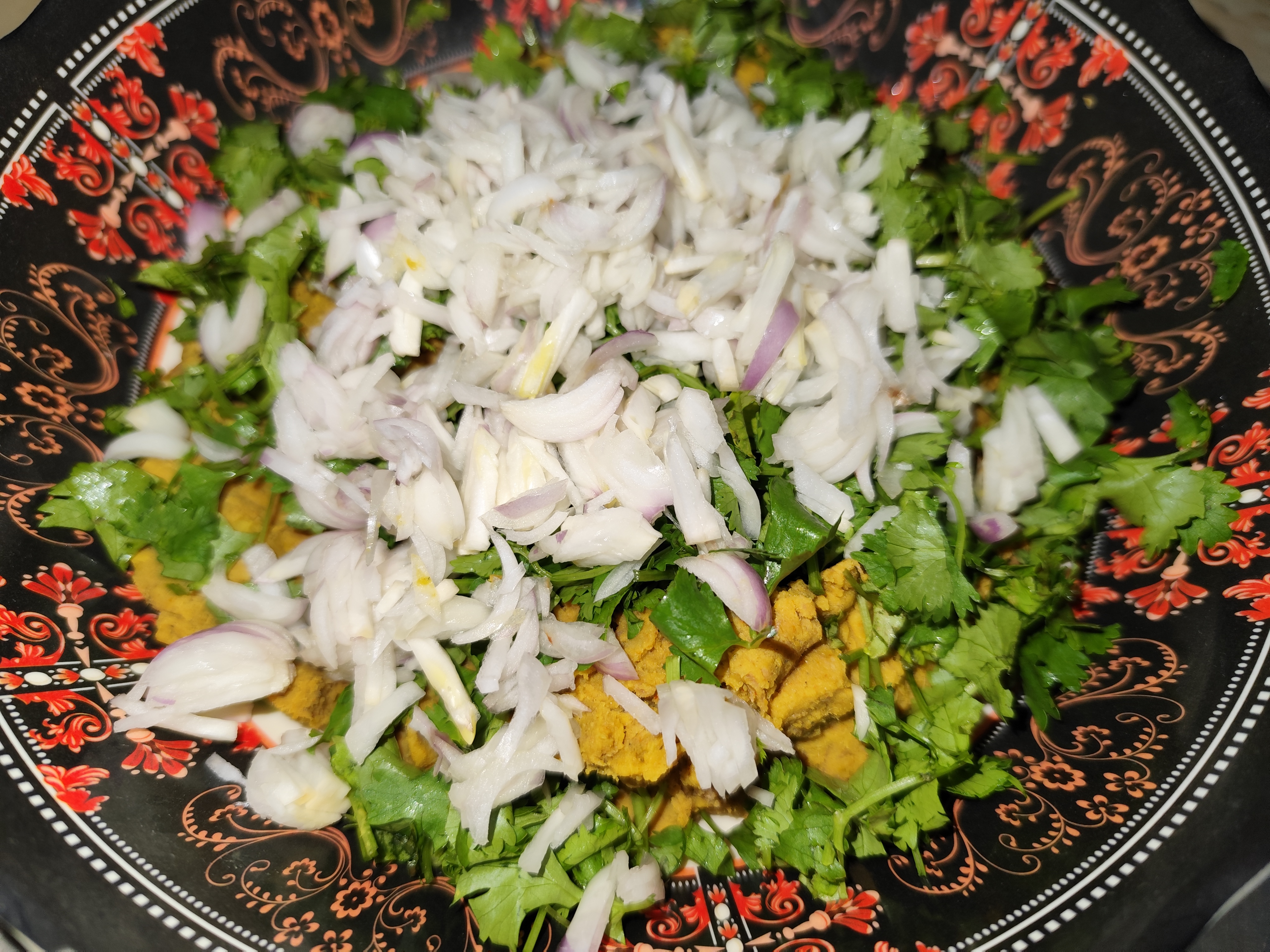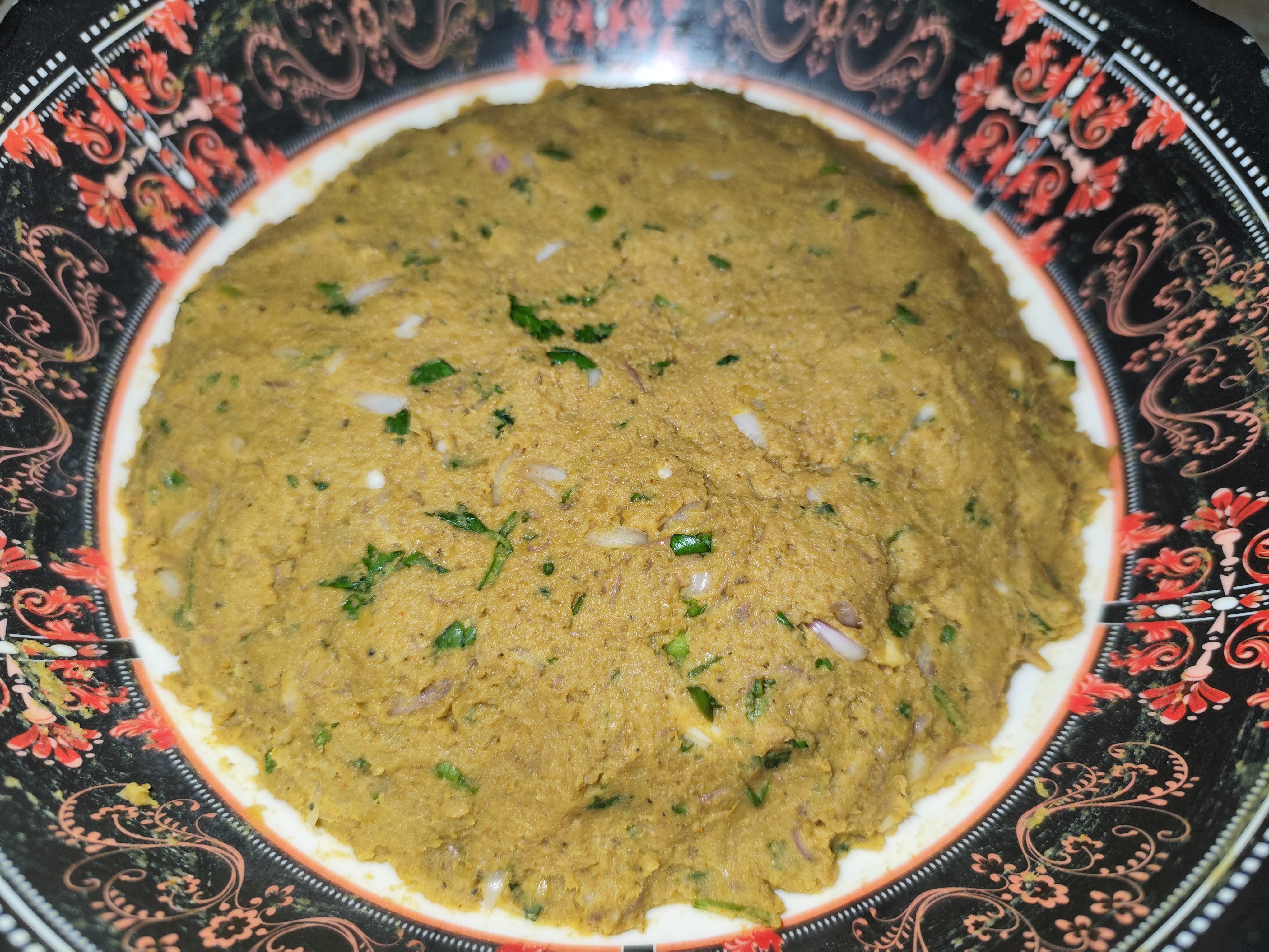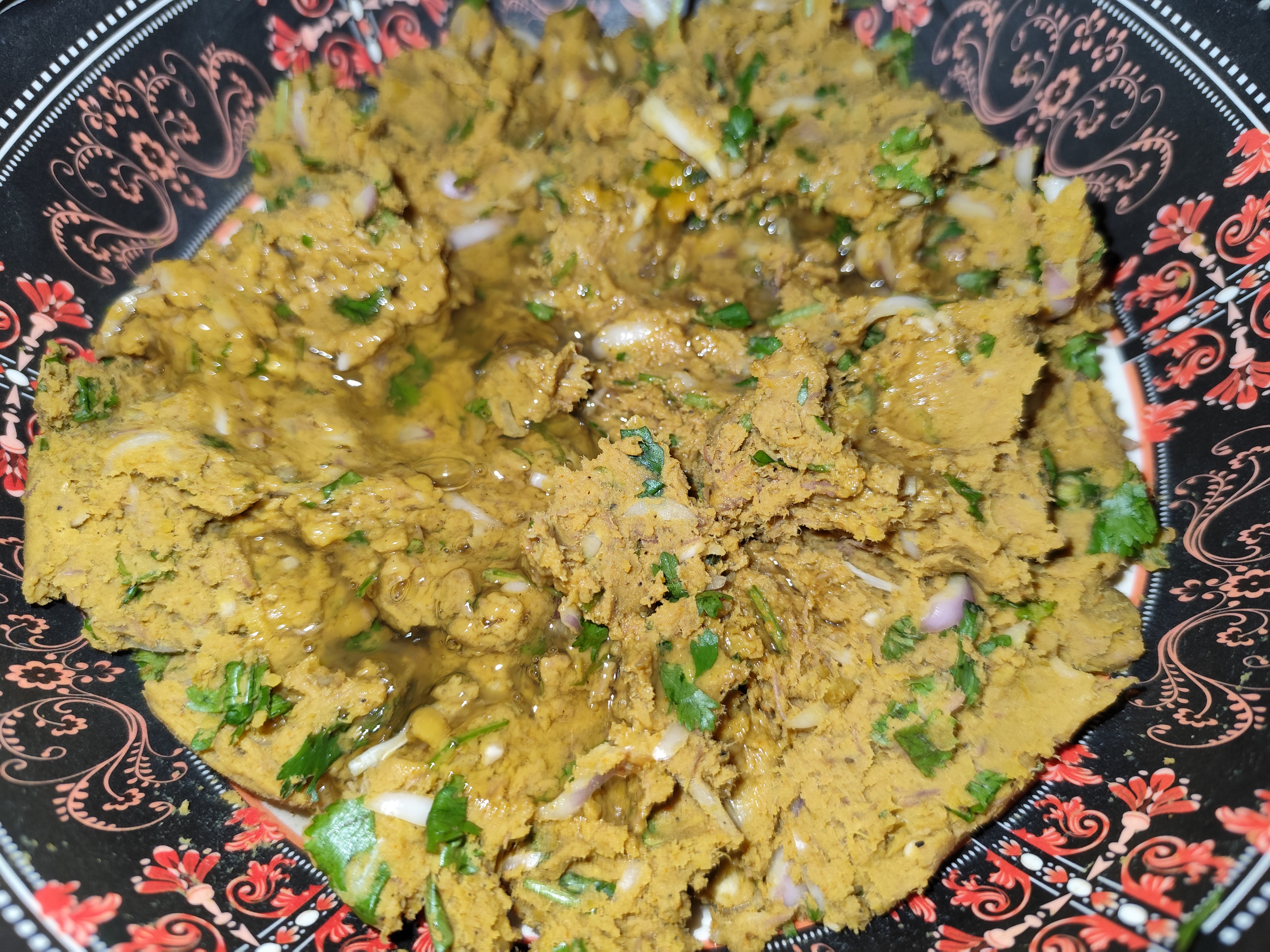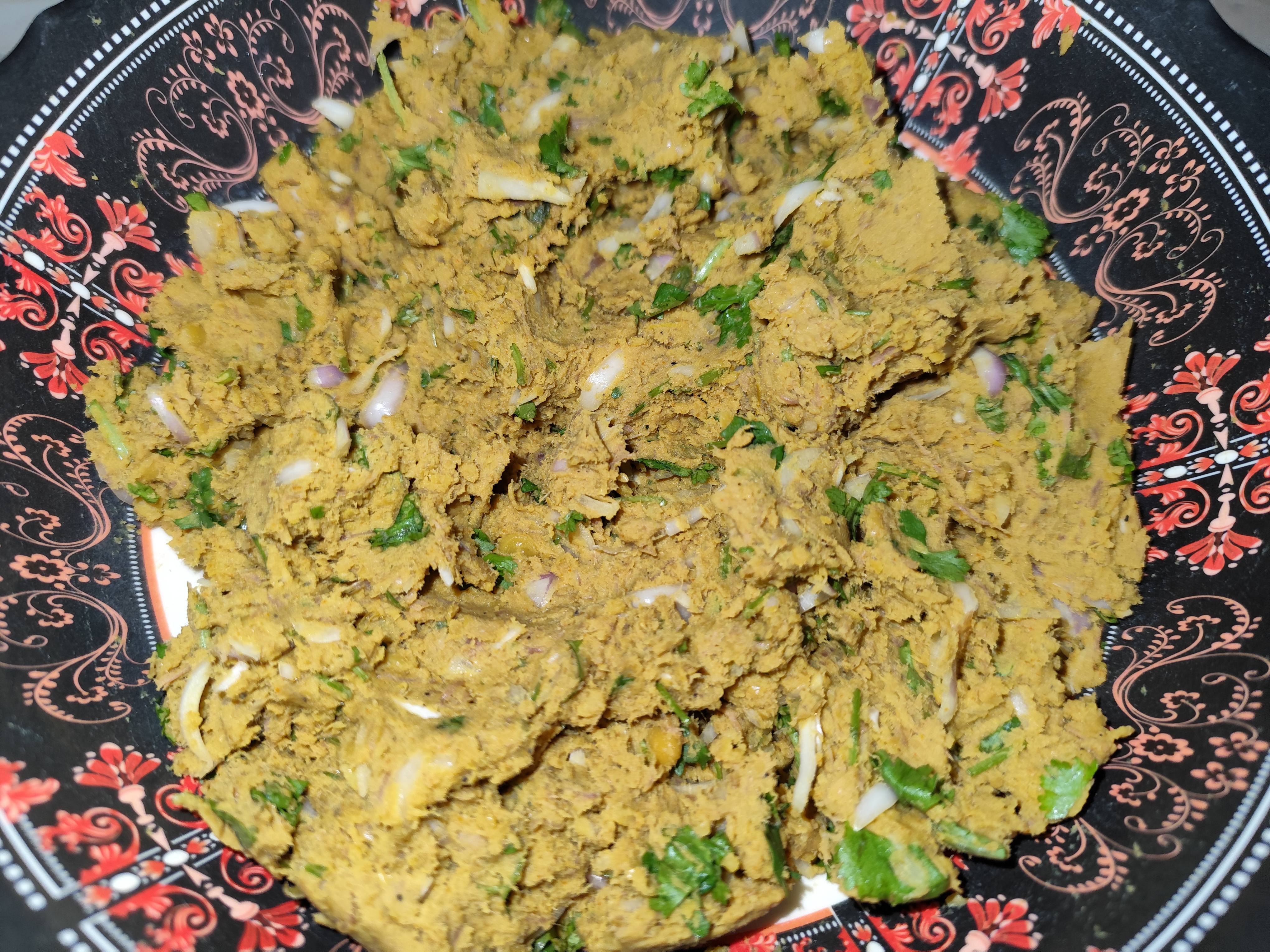 At this stage, I added chopped coriander leaves, chopped onion, and chopped chili to the blended mixture. Then I mixed everything together with my hands.