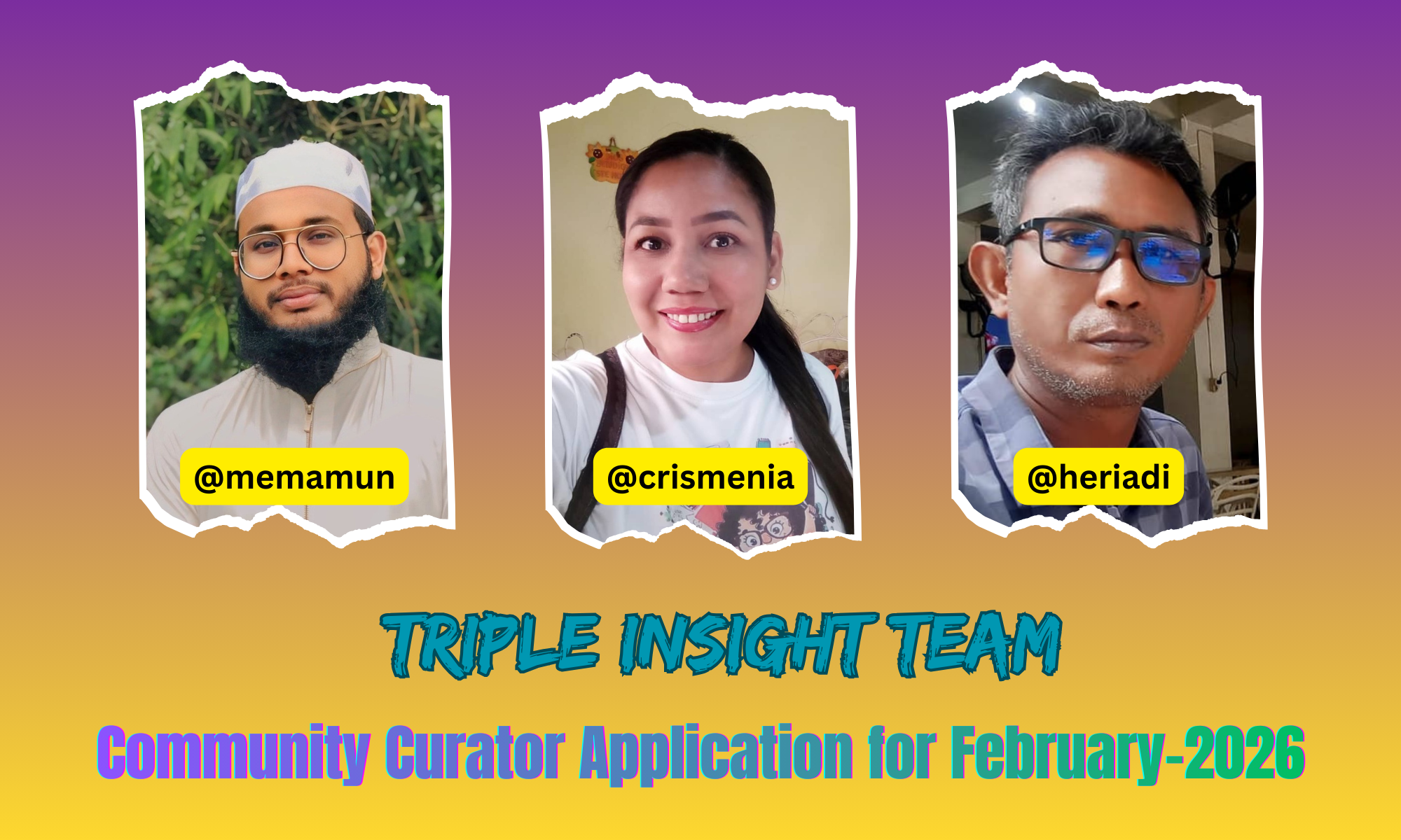 We the Team triple insight Curators are submit our application for the February 2026 Curation. We have over the years, learned a lot about what makes Steemit a successful platform and we aid in joining forces to keep it running. As the Team triple insight curators, we want to contribute greatly, and support users who are dedicated in raising the banner high through meaningful comments.