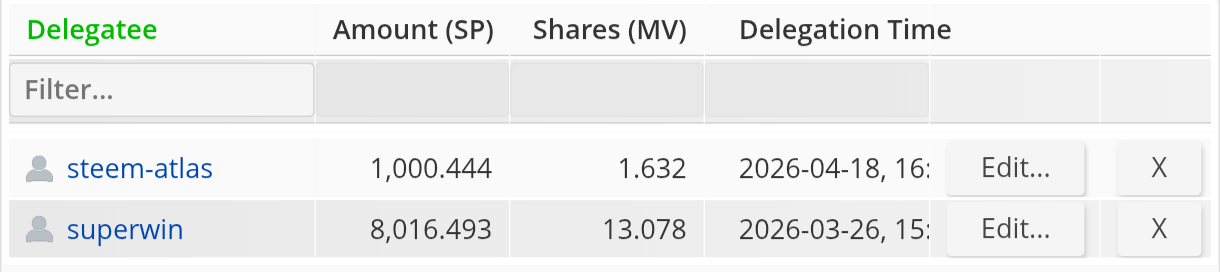 | Delegations | steem-atlas 1,000.444 / superwin 8,016.495 |