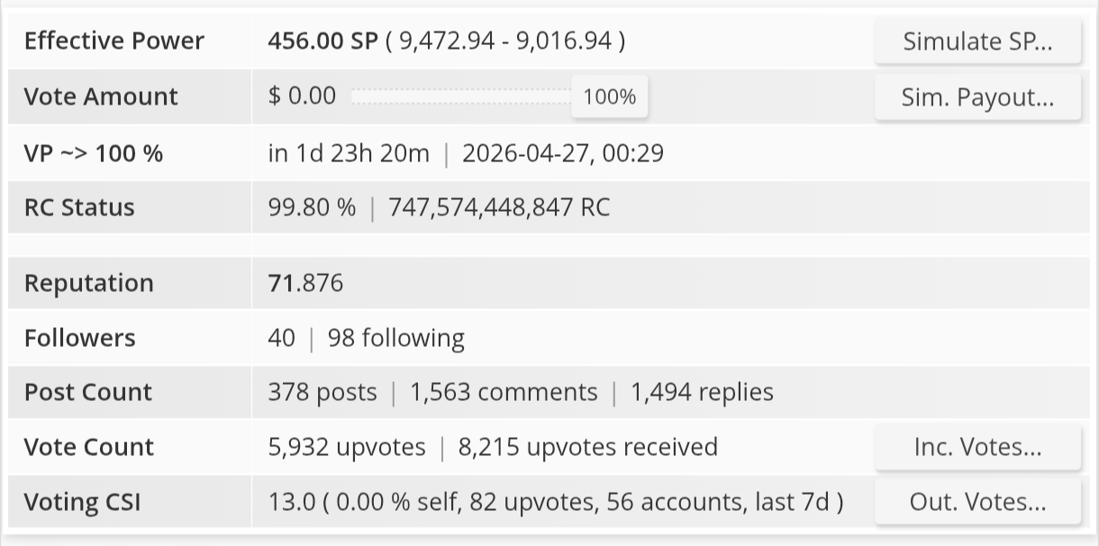 | Current voting CSI: | 13.0 ( 0.00 % self, 82 upvotes, 56 accounts, last 7d ) |