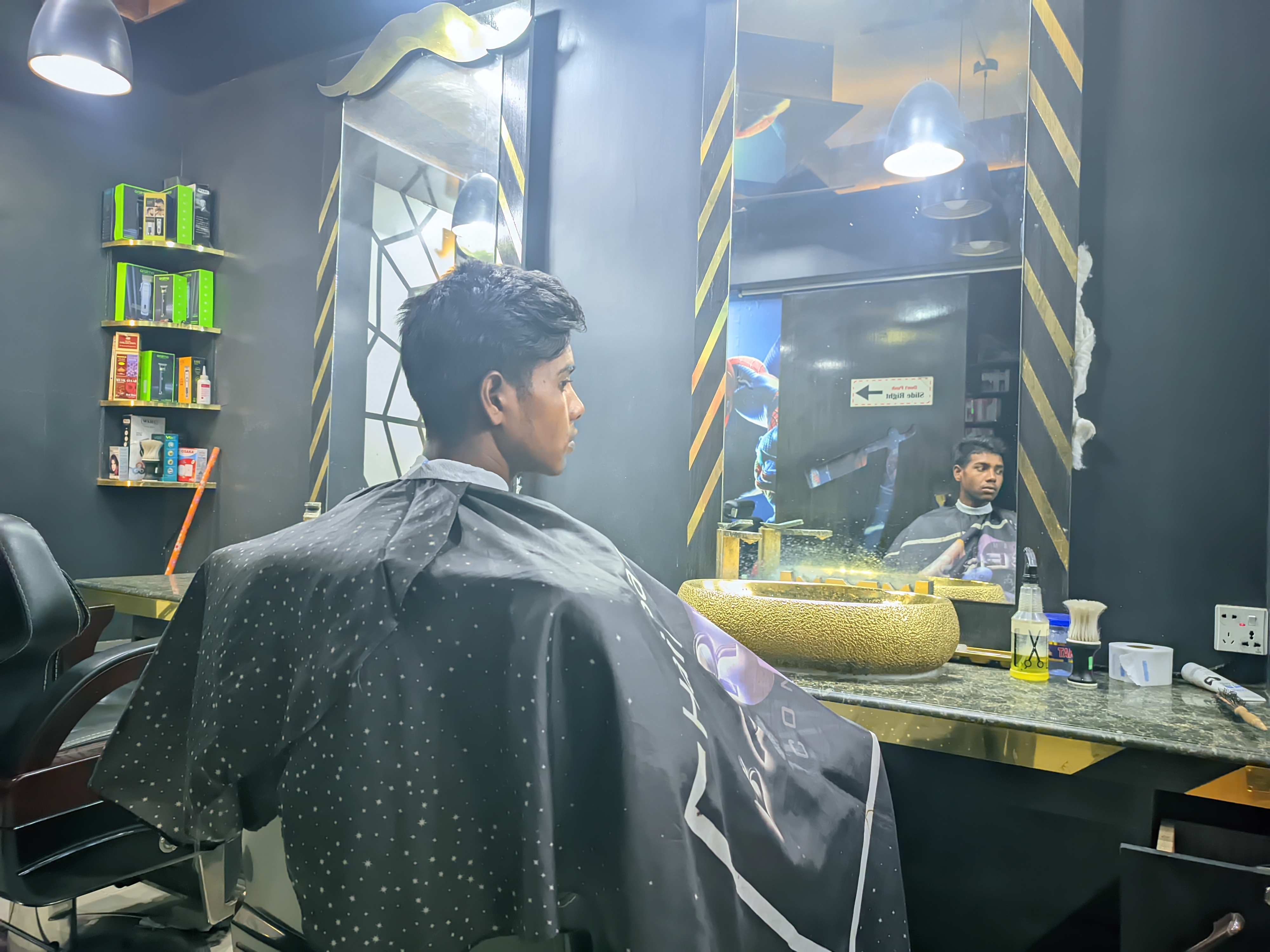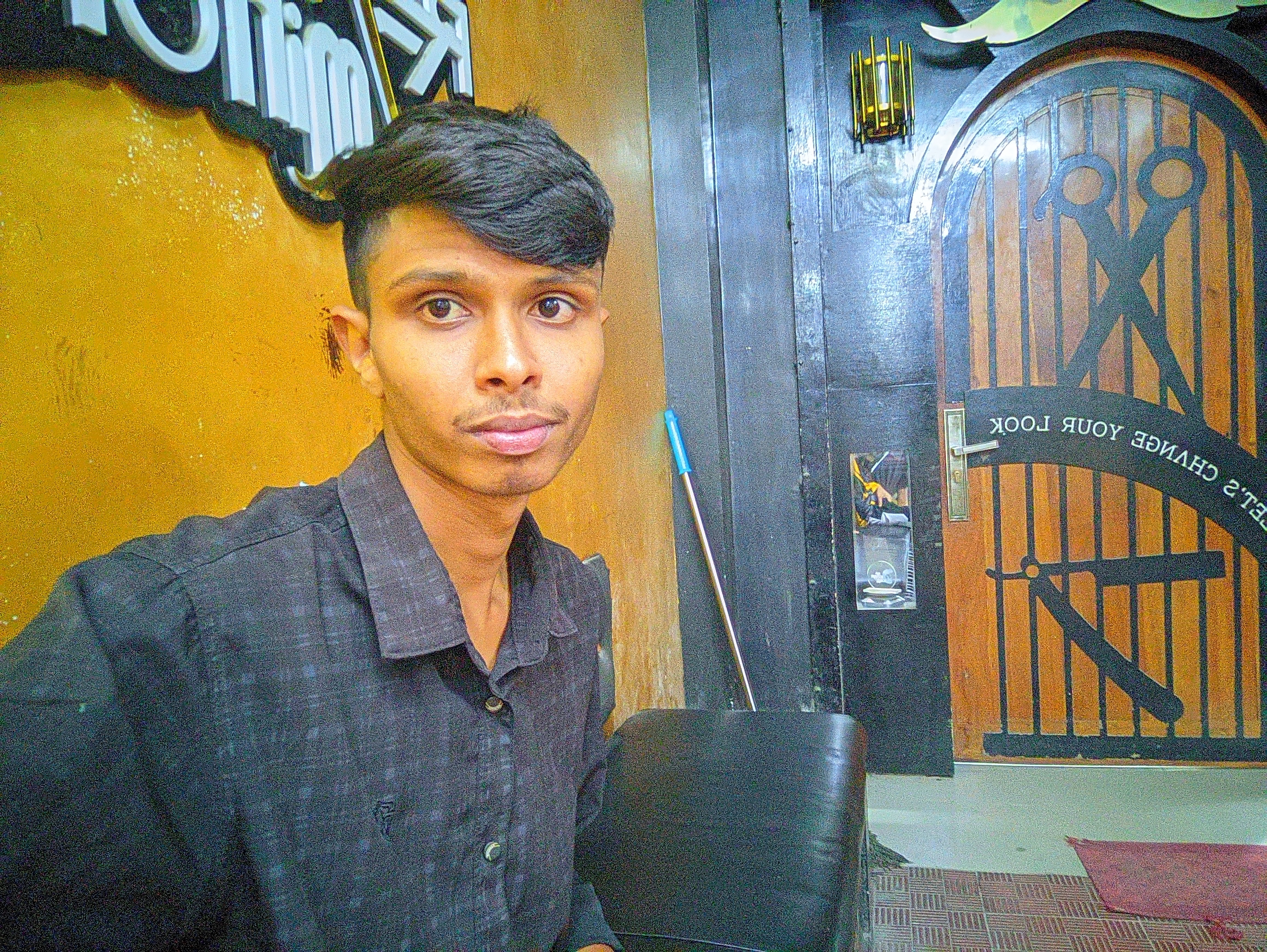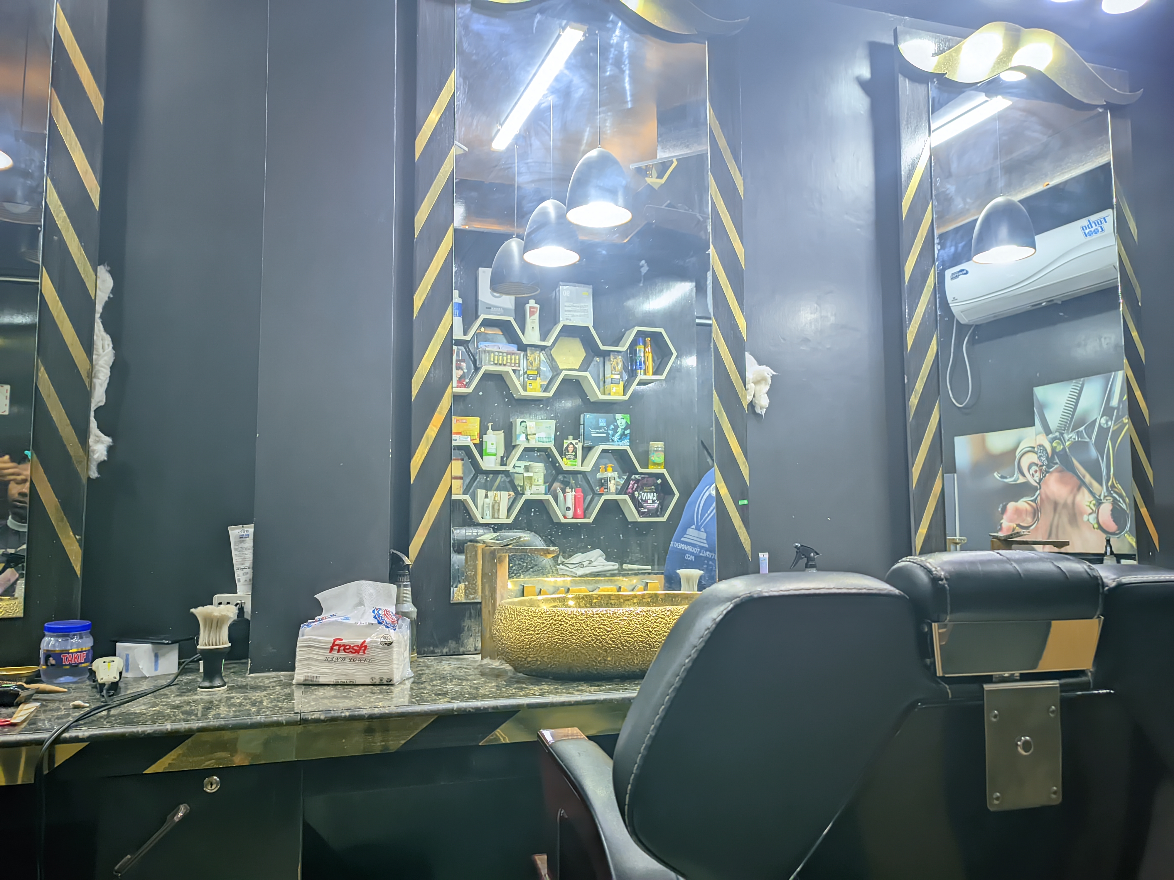 Today I had an urgent taskâa haircut. So I went to that special shop, which is my favorite in this city. The place makes me feel good just by looking at it. The interior design here is different, all wrapped in black and gold colors. The deep black color of the walls and the golden stripes have given the whole environment a gorgeous look.