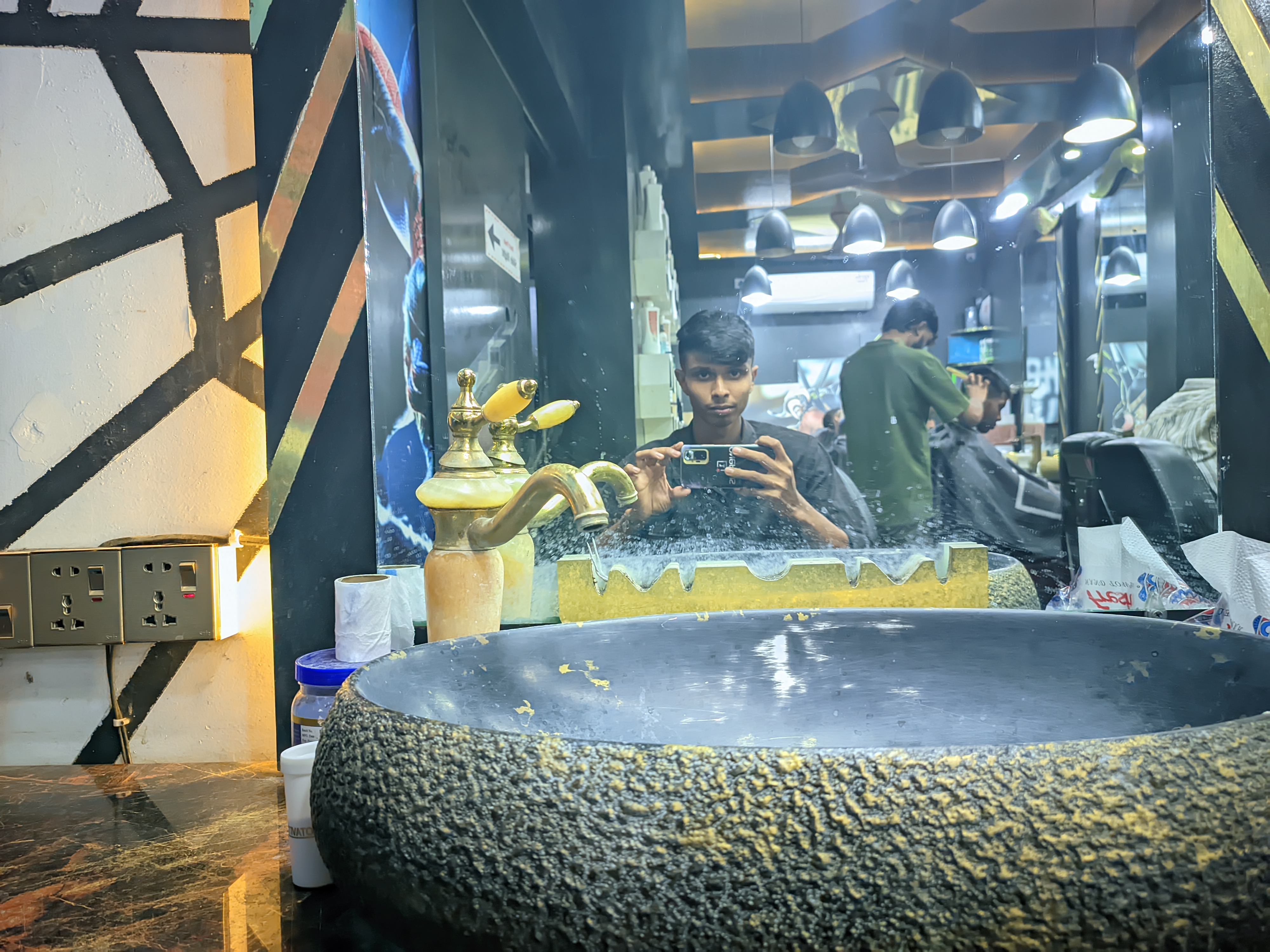 The basin for washing hands before getting a haircut is like a work of art. It is not an ordinary sink, but rather looks like a black and gold bowl with an uneven texture. The design of the golden tap next to it makes it look like something from an old royal era. I once caught myself looking at this mirror.