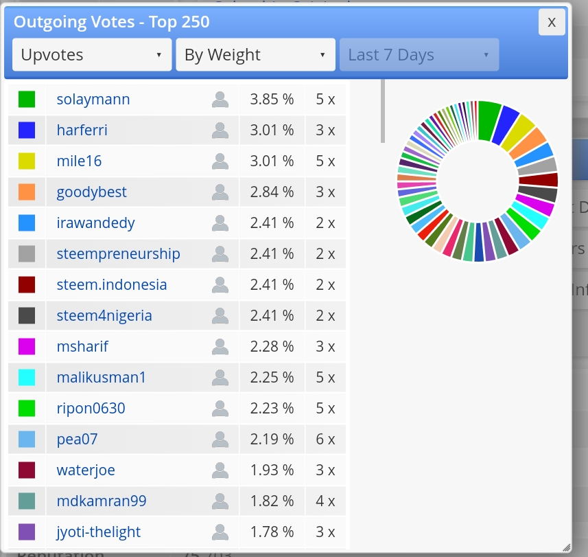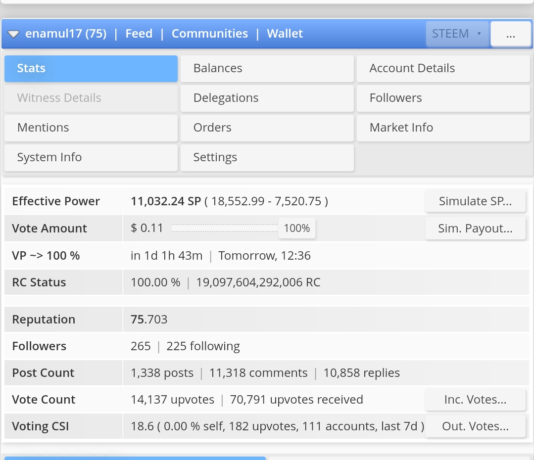 Currently I have 18,552.99 steem power and out of that 11,032.25 SP is my effective steem which I use to support all users who post quality content regularly. Currently my voting CSI is 18.6 ( 0.00 % self, 182 upvotes, 111 accounts, last 7d ) make proper use of my voting power and I never let my voting power fall below 80%. And on the other hand I as a user always try to help other users. I help my steemit friends on Discord about various things that I know.