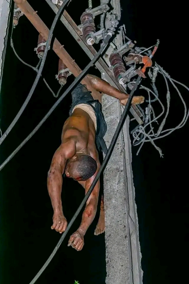 Well, this incident Happened in Aba, Abia State NIGERIA, and said to be a midnight accident which had already happened before the arrival of many people.... The Young man who died of a massive Electric shock high voltage had already died before the arrival of many people....This Young man died a painful death due to his bad crime and what he caused himself..into......