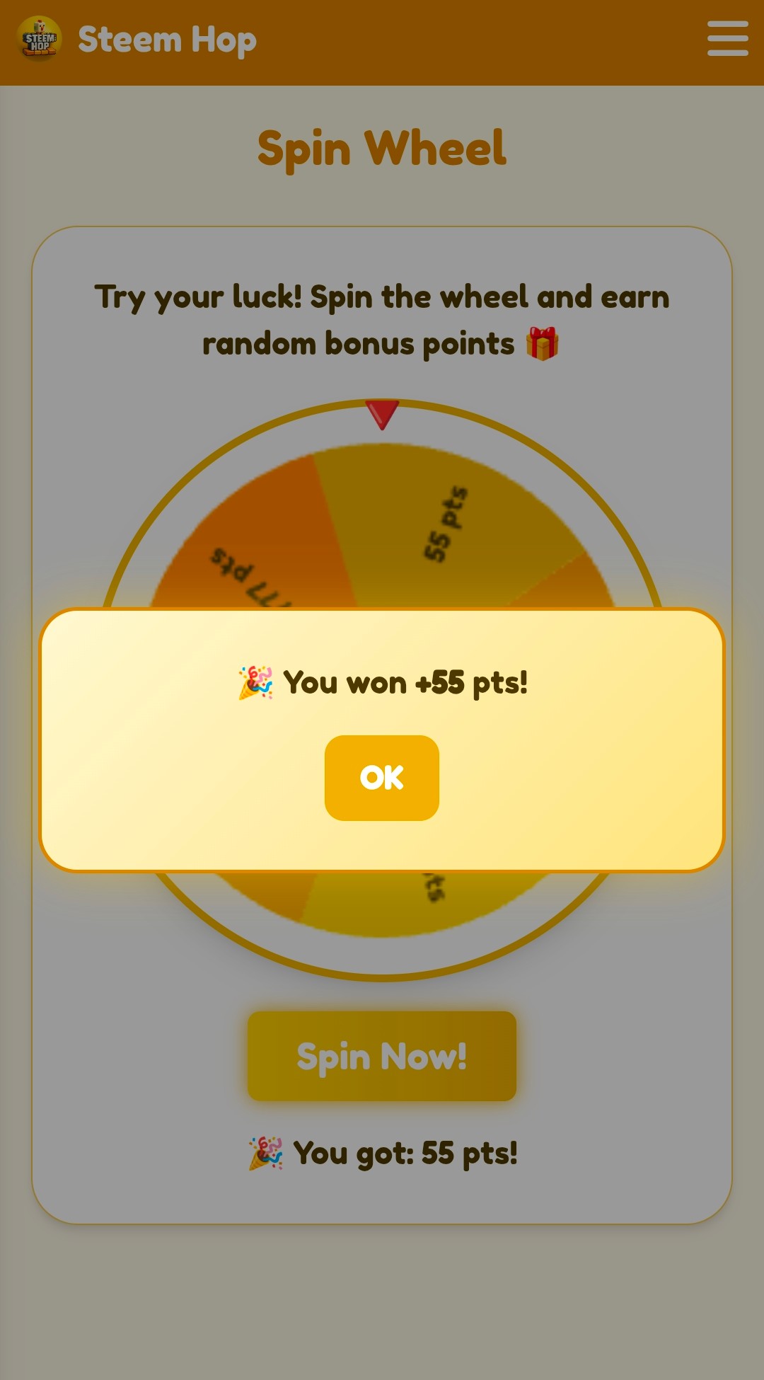 Here in the steemhop game there is one more bonus spot for every player. This is known as spin wheel. Every player get a chance of spin wheel. Here are different options like one more chance, 55 points, 111 points, 333 points and the last one is 777 points. This depends upon our luck. Some players got 777 points while sometimes we didn't get even 1 point. So in my today's spin wheel I got only 55 extra points. I received 55 points.