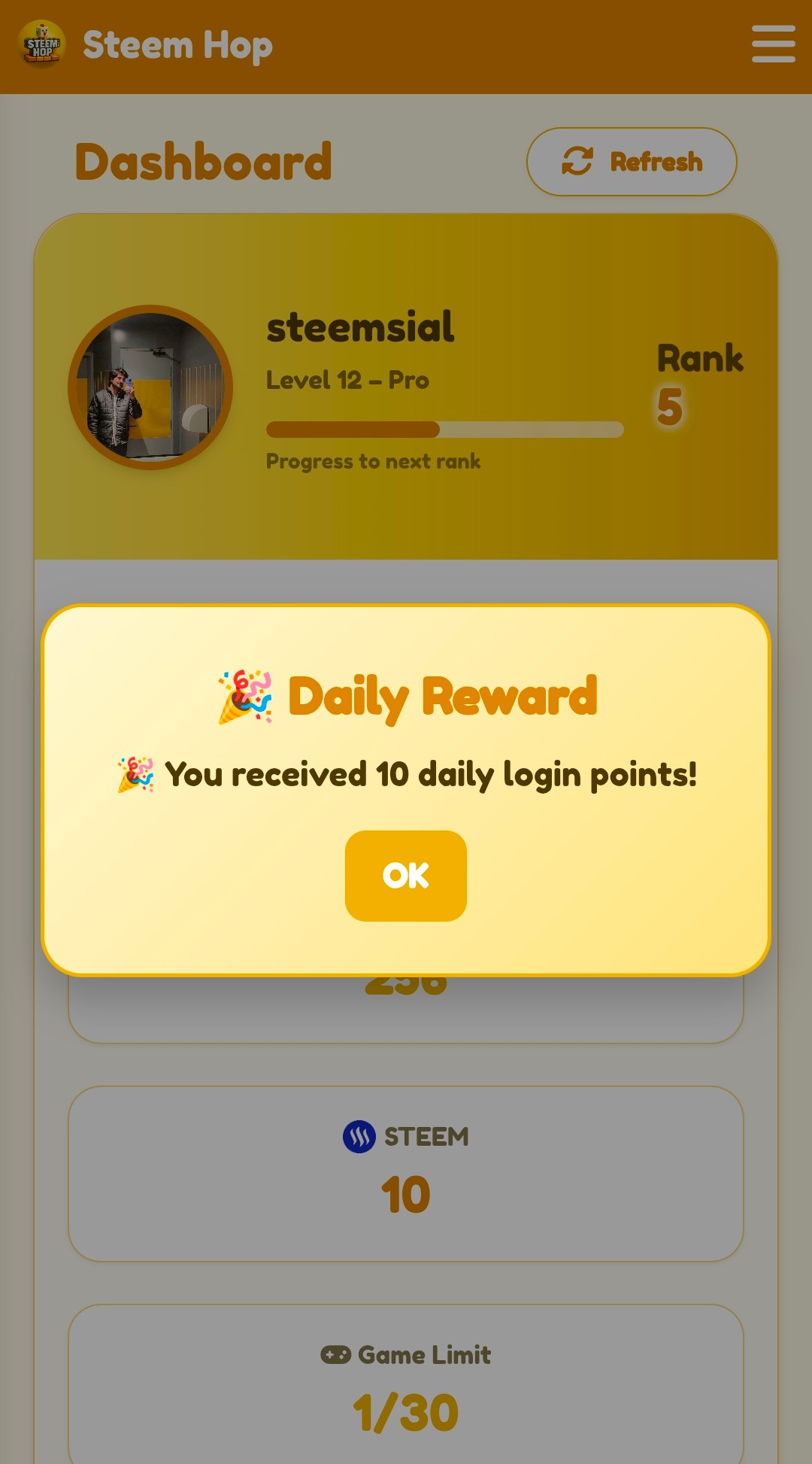 First of all I opened the game using the main link of steemhop game. I then login the game by using my username and steemit key. After signing the game I got 10 points which I received and these points are won on the daily basis as we get login the game after each day. So I got 10 game points and progress to play the game.