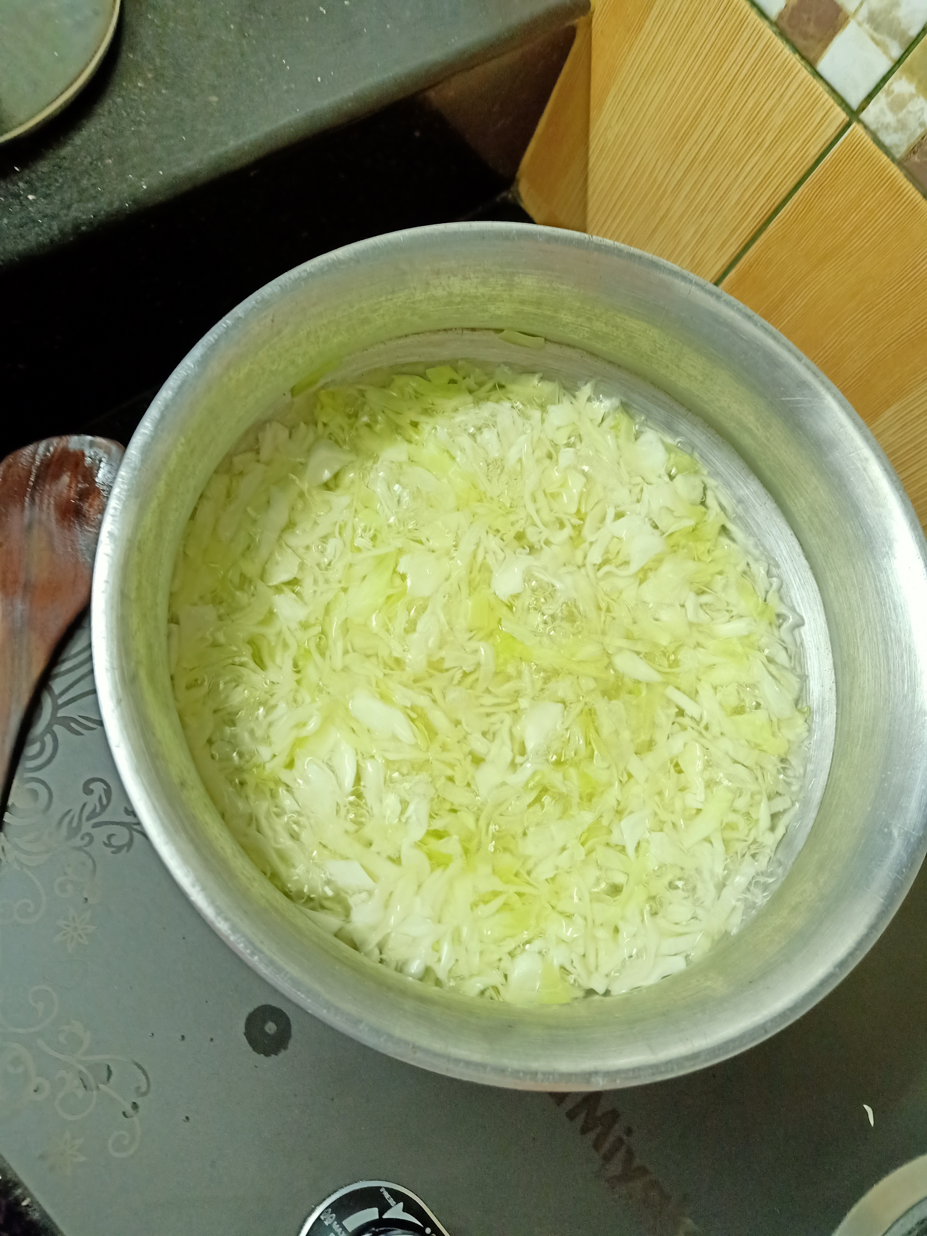 একটি পাত্রে কিছু পানি দিয়ে কুচি করা পাতাকপি আর সামান্য একটু লবন দিয়ে সিদ্ধ করে নিয়েছি... সিদ্ধ করার ফলে পাতাকপির যে একটা গন্ধ আছে তা আর থাকবেনা..