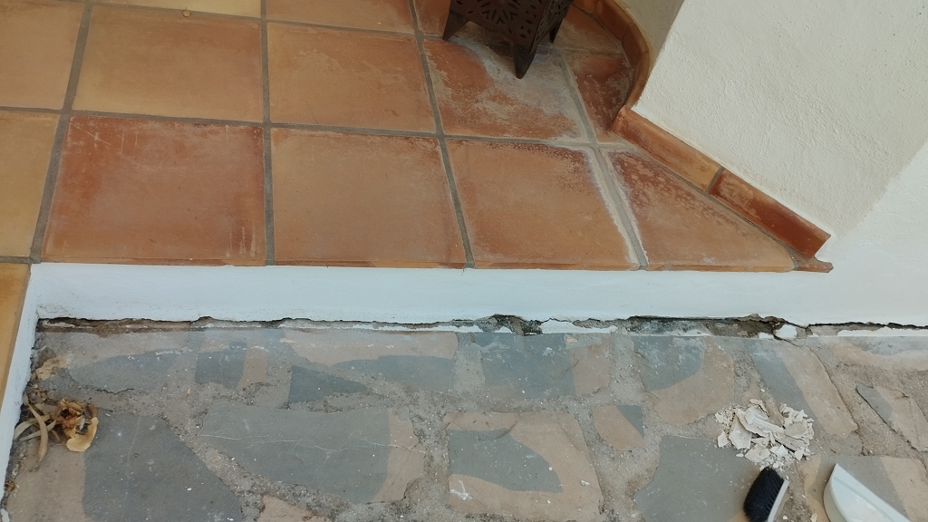 und hier war er nun auch der Stein des Anstoßes, der Makel der ausgeführten Arbeiten, man hatte versucht einen überstehenden Terrassenbereich des Eingangs mit dem Natursteinboden des Vorplatzes am Eingang zu verbinden, was schief gehen musste da die Materialien keinerlei wirkliche Verbindung eingehen und man deshalb eher eine vernünftige Dehnungsfuge hatte machen sollen,