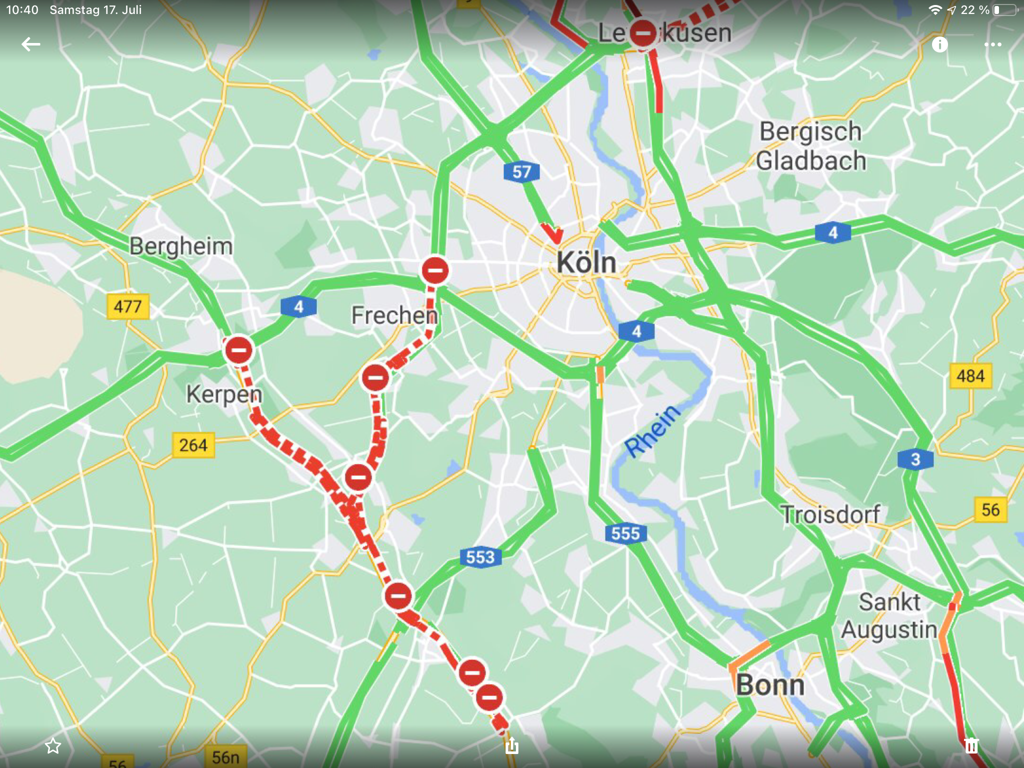 Wir kommen ungehindert bis Kerpen, Weiden und Bedburg und dann ist für uns Schluss.