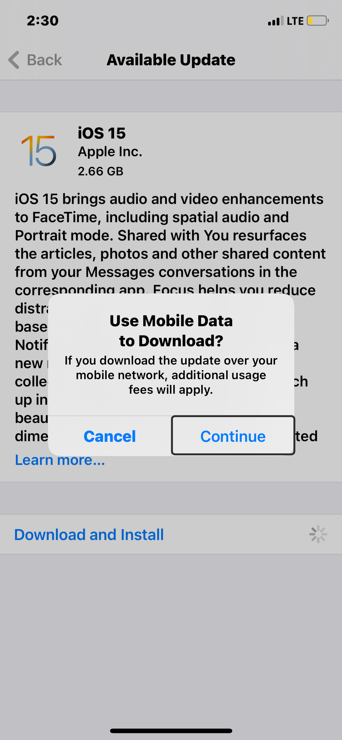 - Tap on Download and Install, you will be promoted whether to use mobile data for the download, tap on continue.