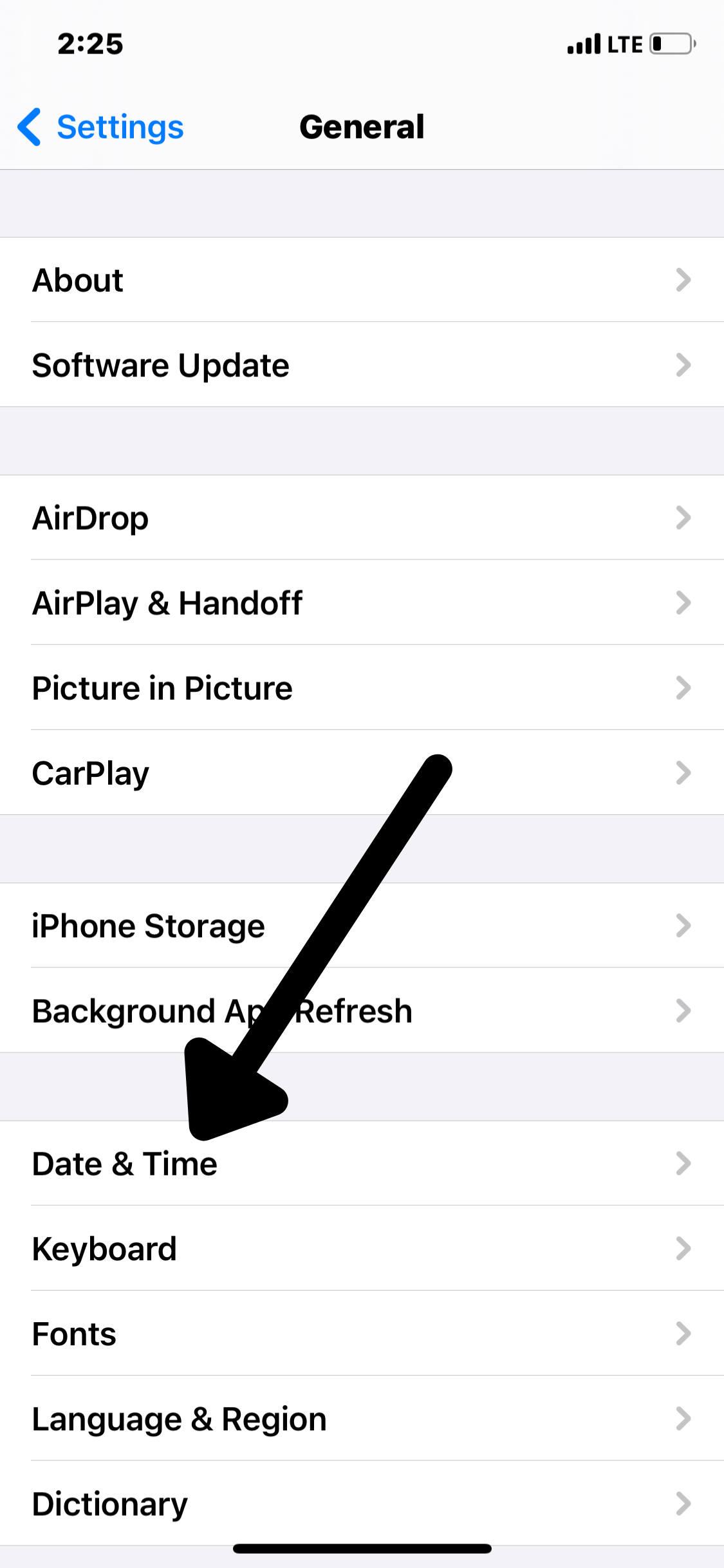 - You swipe back to “General” and from there tap on “Date & Time”.